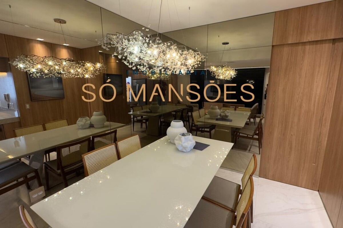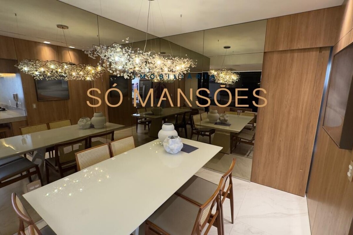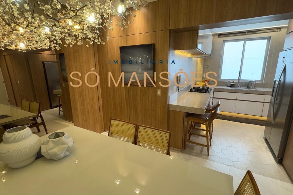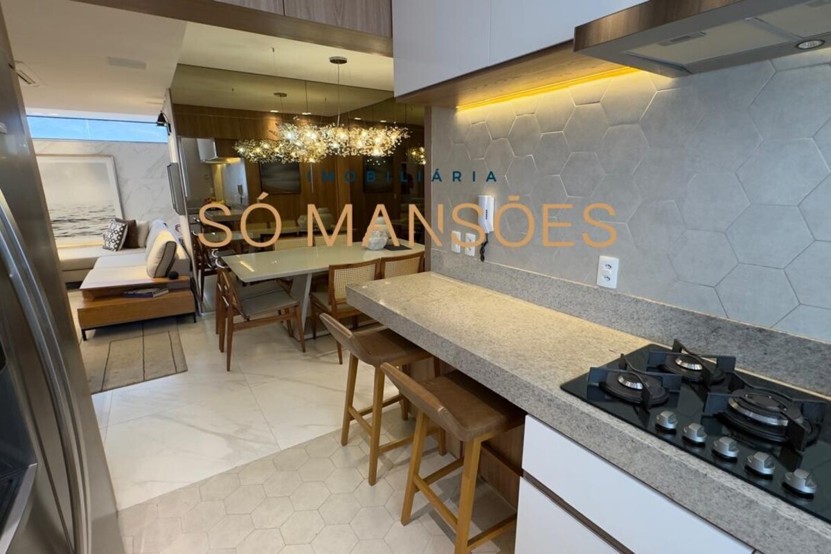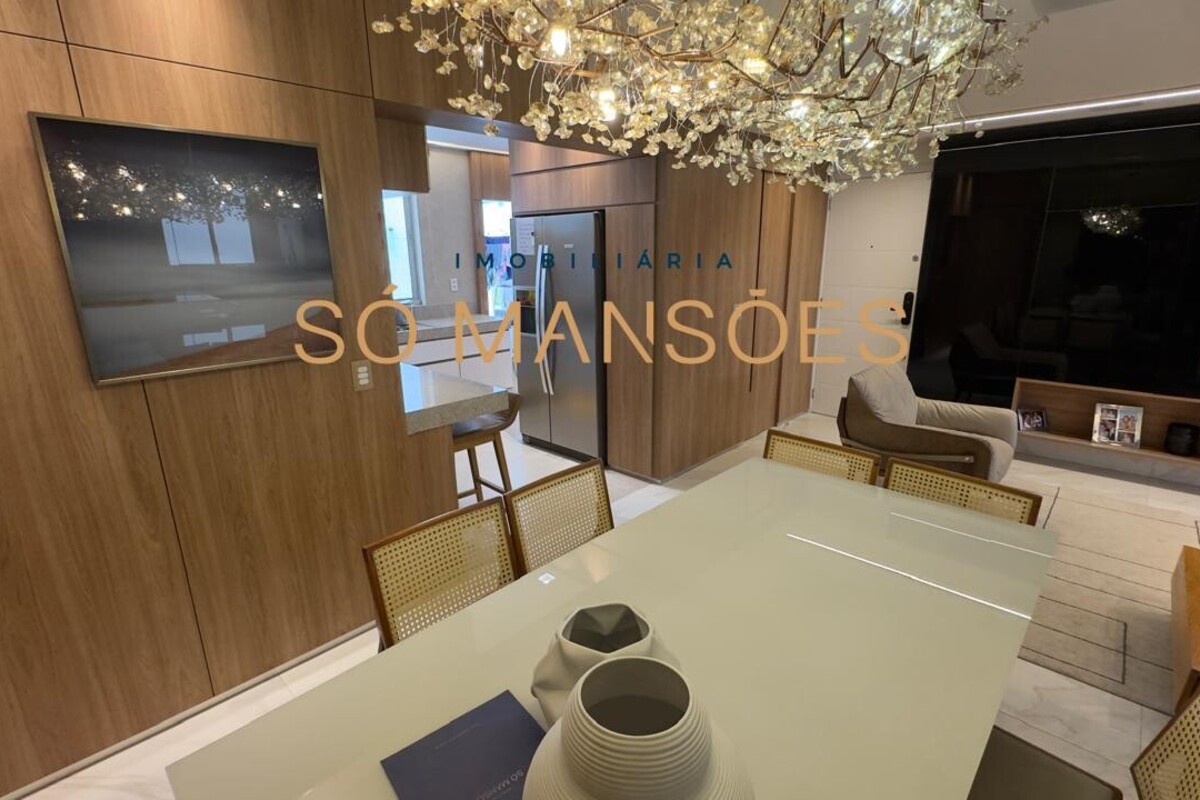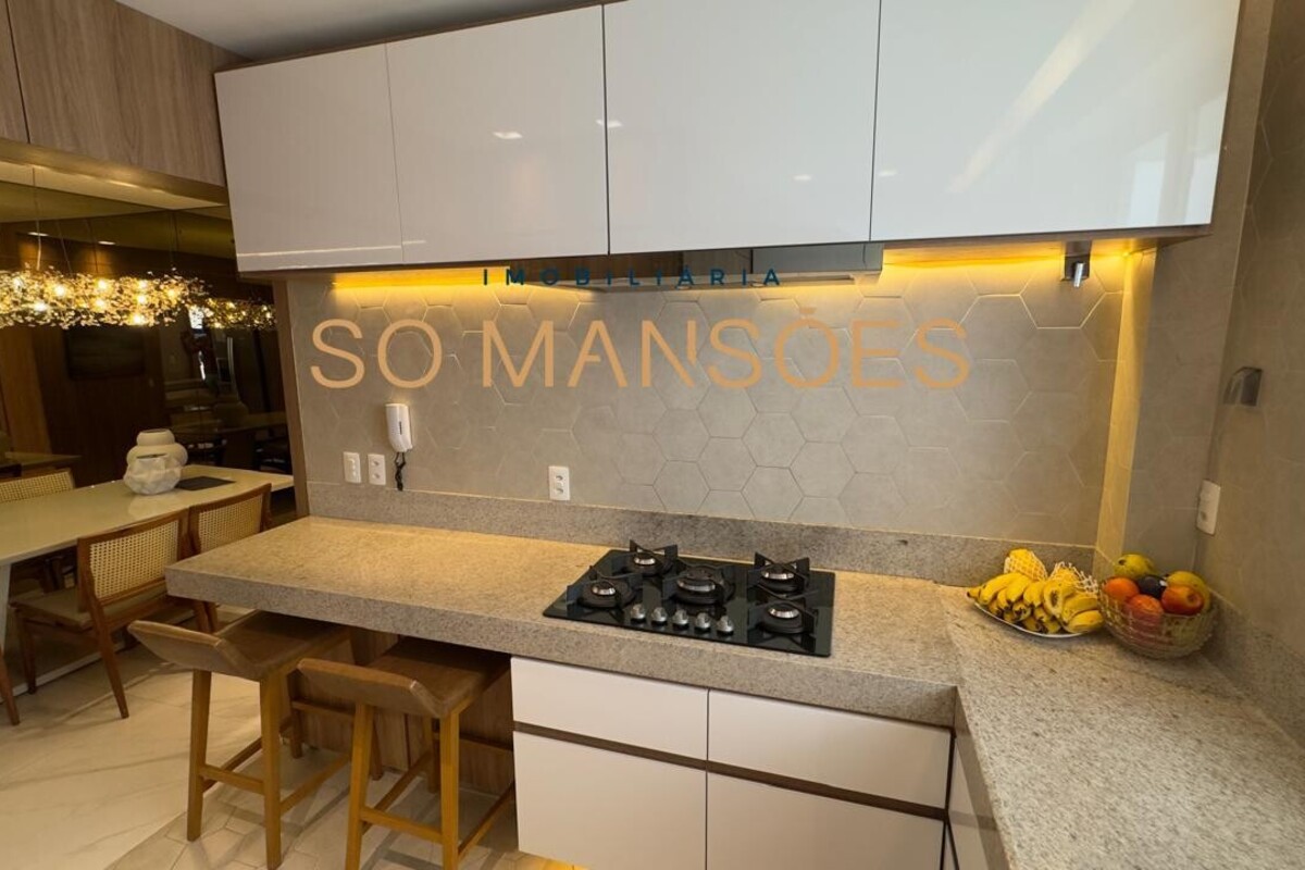 A cozinha segue o mesmo padrão de cuidado e qualidade. Equipamentos como geladeira side by side, torre quente, cooktop e armários planejados garantem eficiência e praticidade. As bancadas em granito reforçam a durabilidade e o design elegante do espaço, enquanto os armários iluminados no jantar adicionam um toque sofisticado e funcional.