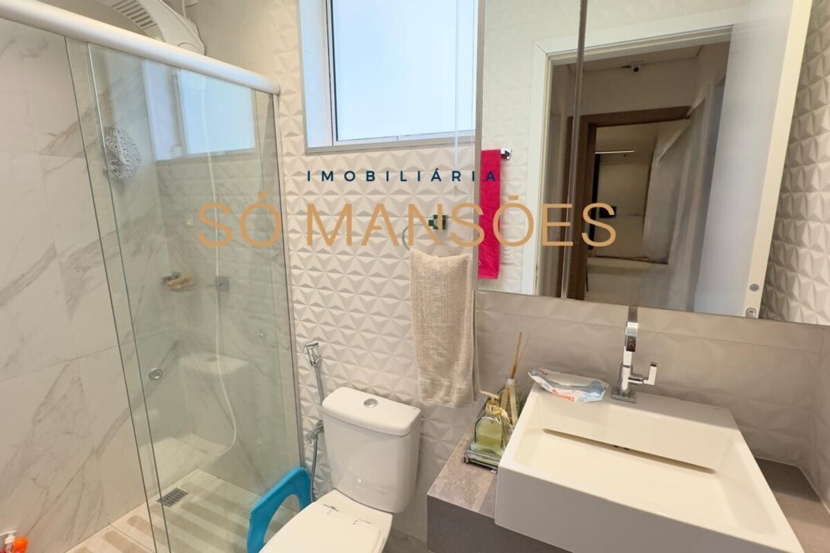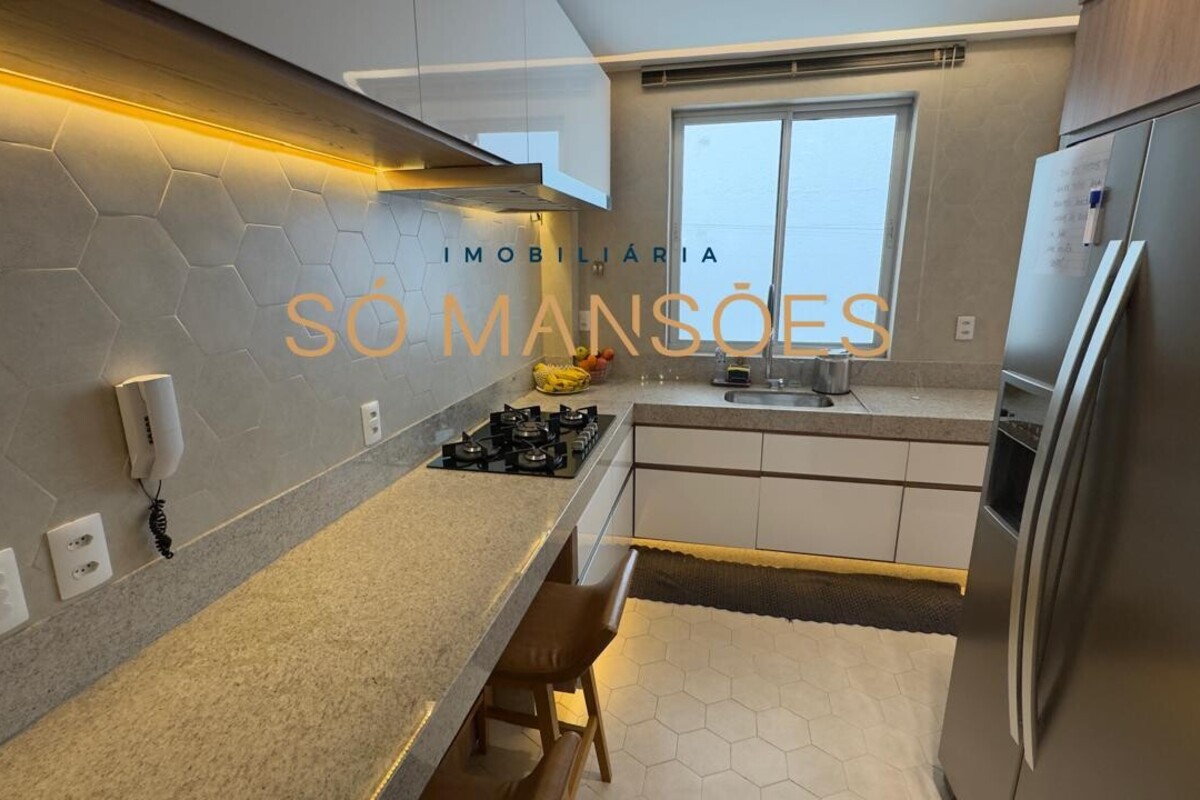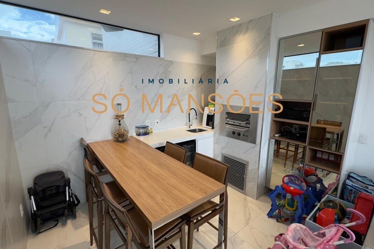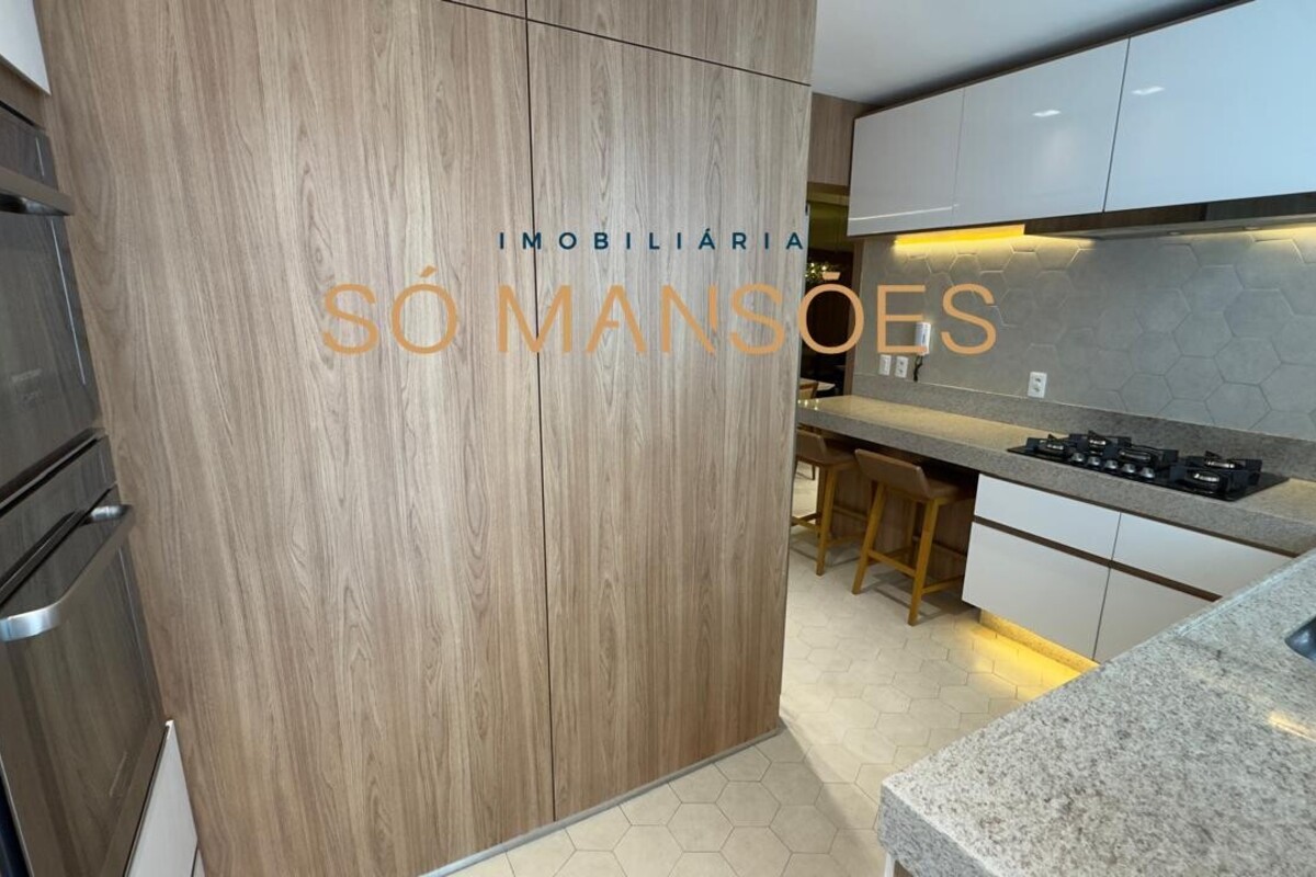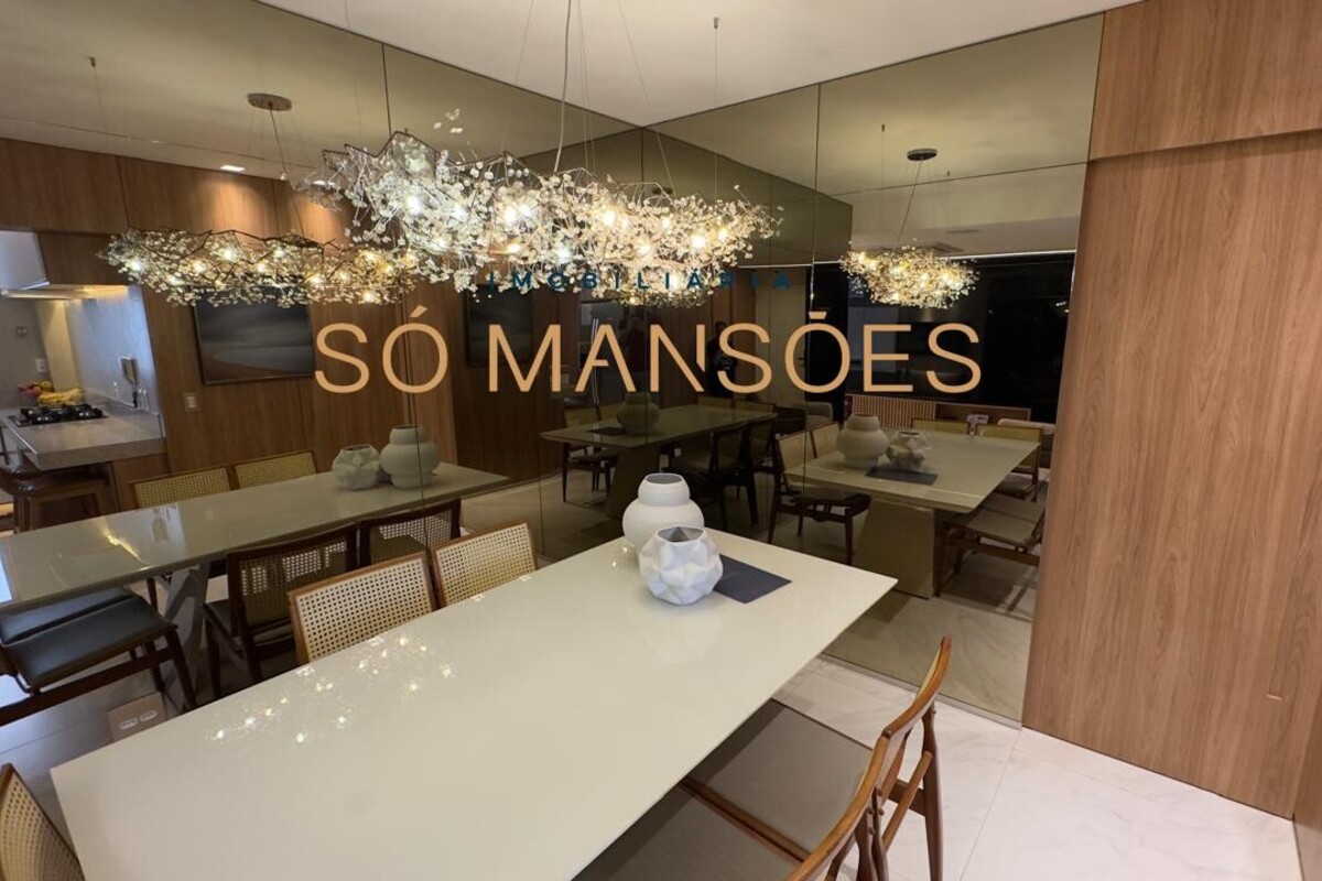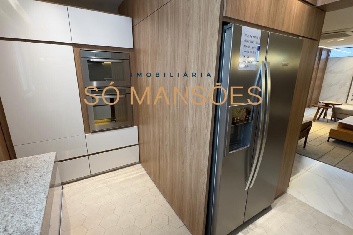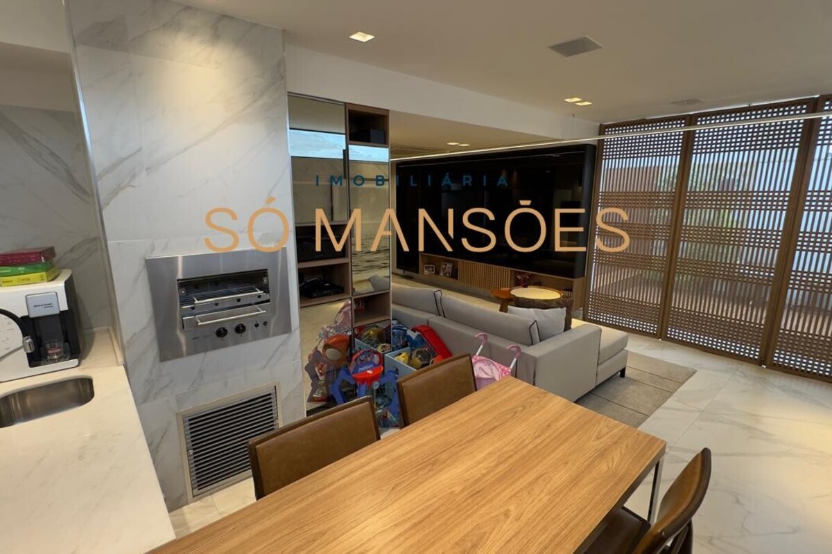 A cozinha segue o mesmo padrão de cuidado e qualidade. Equipamentos como geladeira side by side, torre quente, cooktop e armários planejados garantem eficiência e praticidade. As bancadas em granito reforçam a durabilidade e o design elegante do espaço, enquanto os armários iluminados no jantar adicionam um toque sofisticado e funcional.
