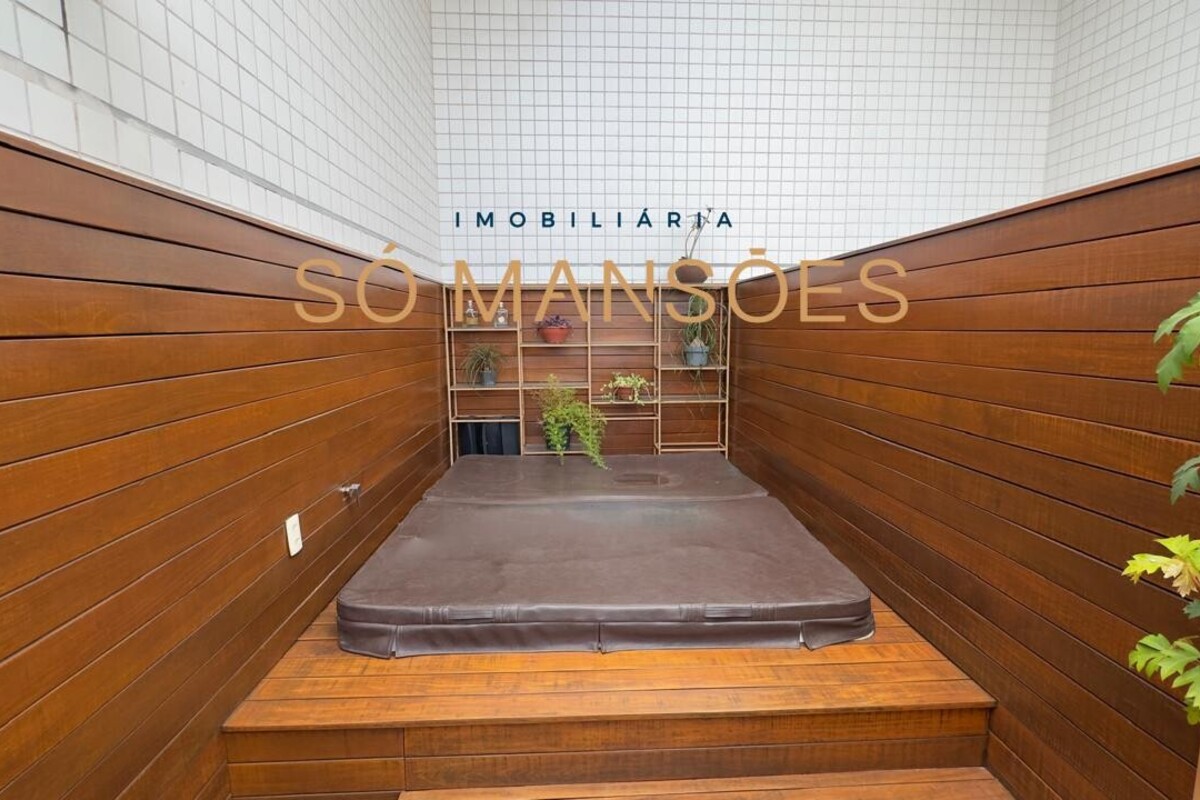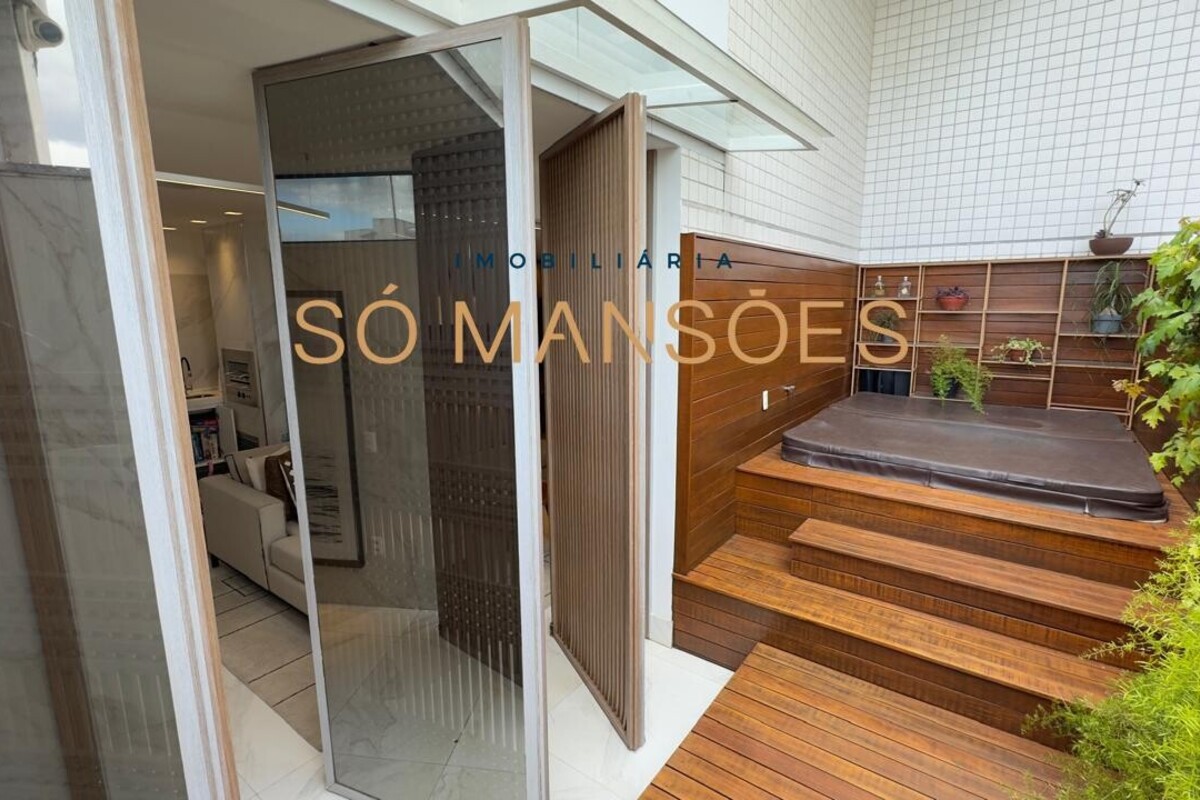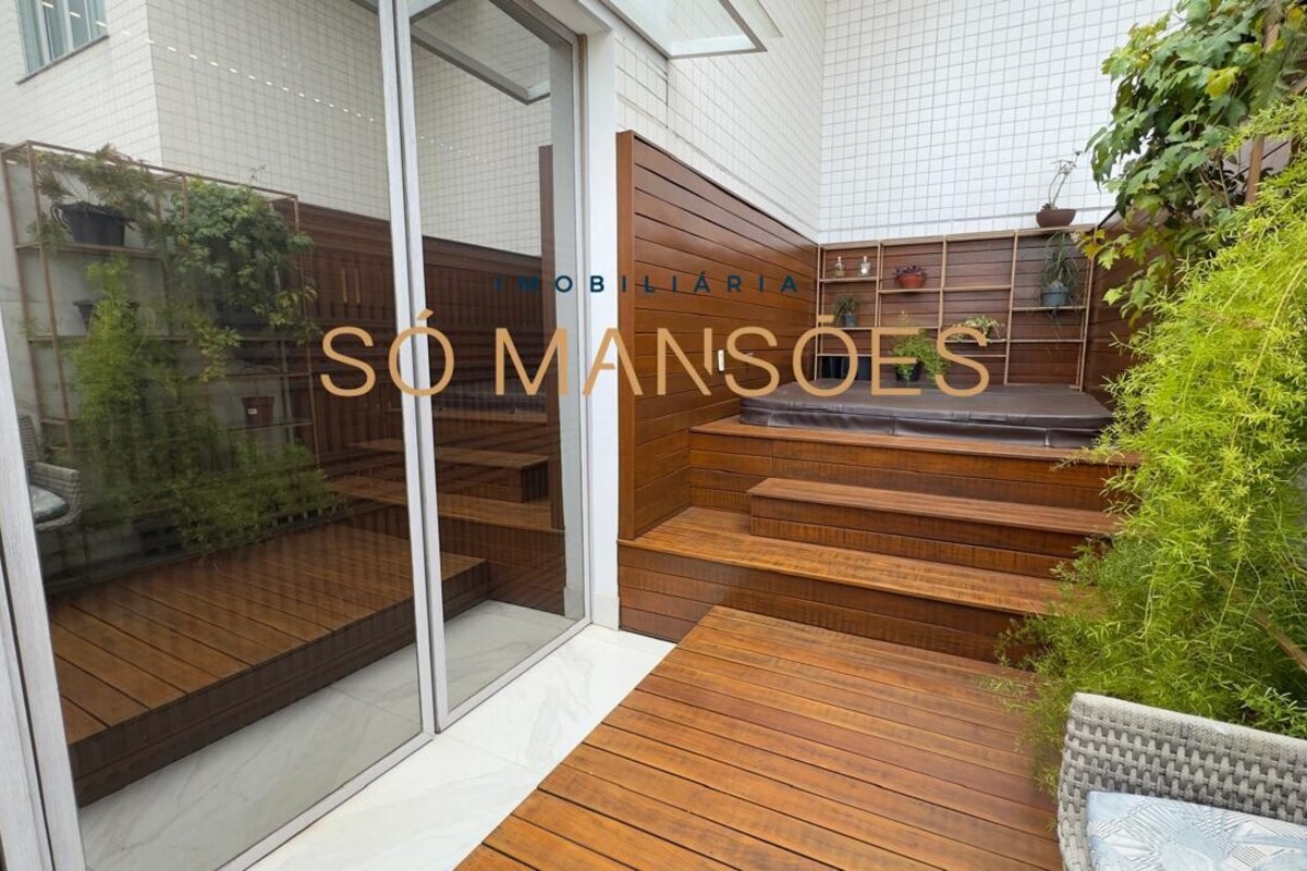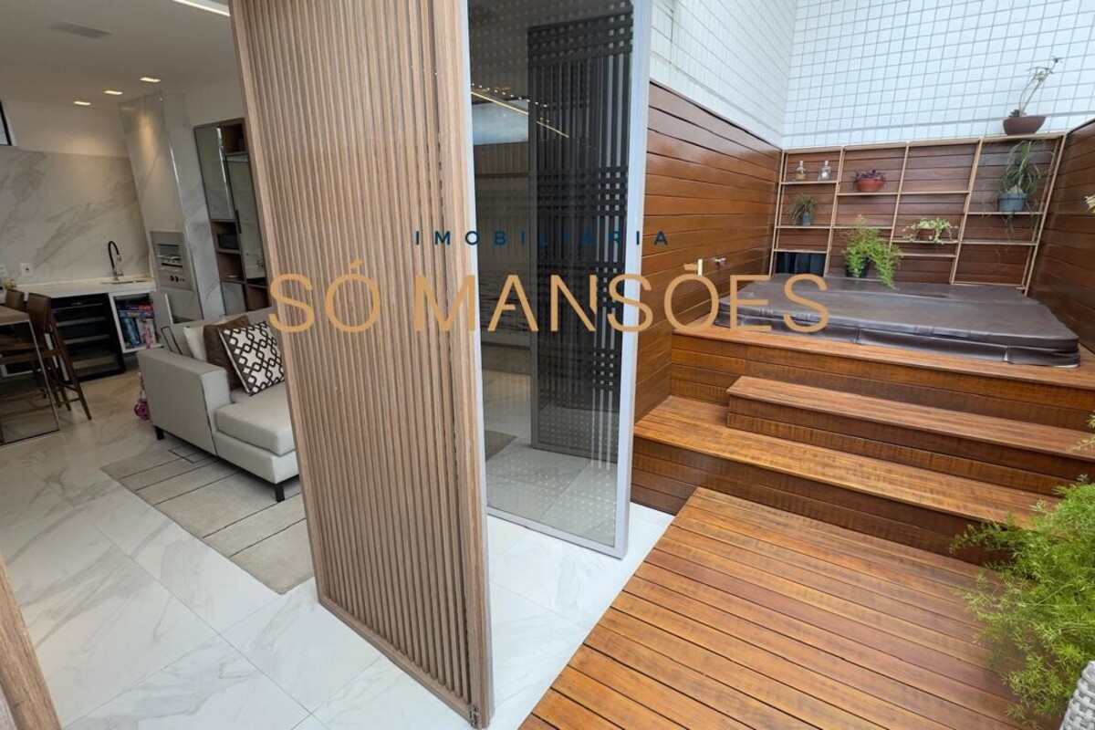 Varanda ampla com deck, spa, churrasqueira e divisórias em madeira