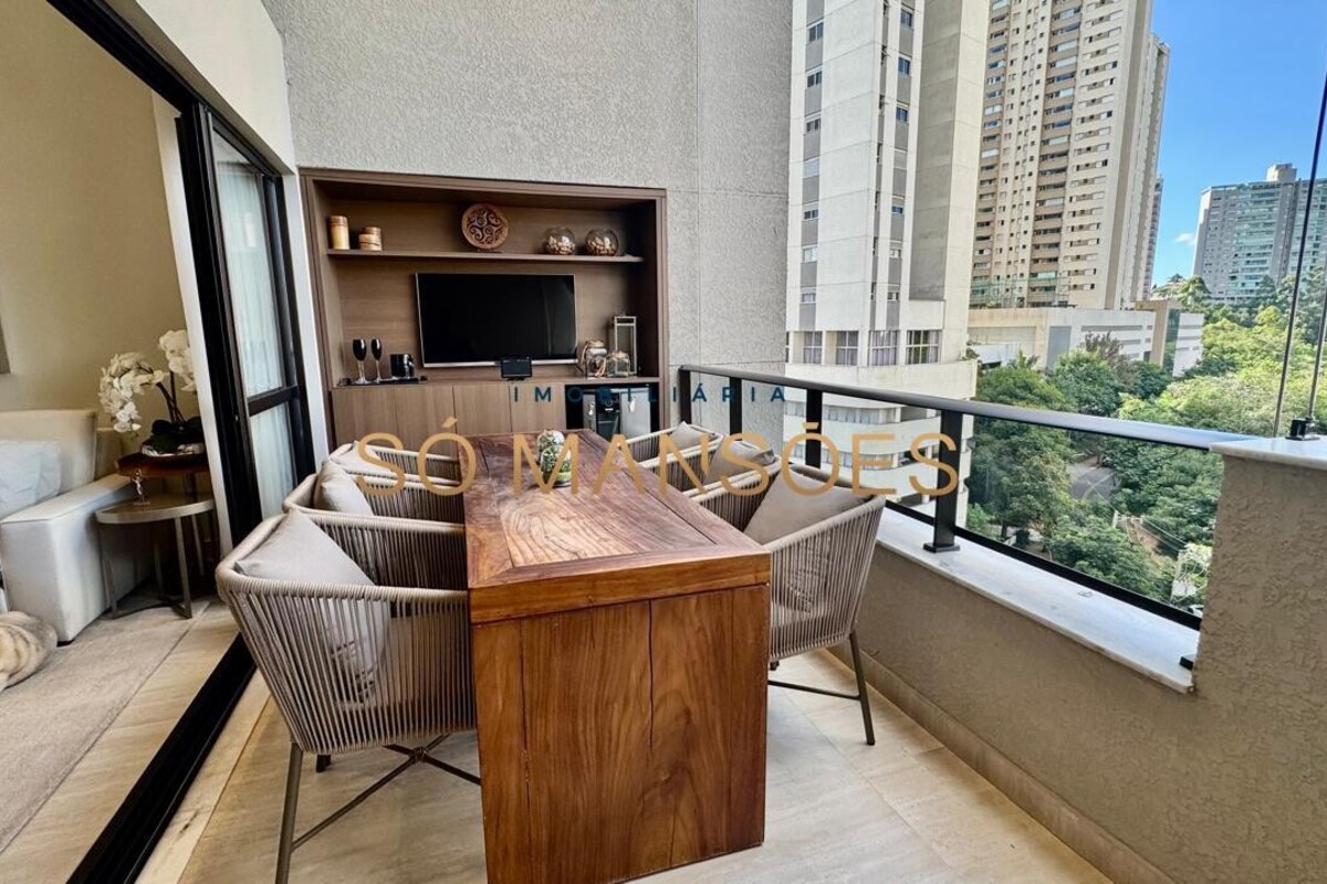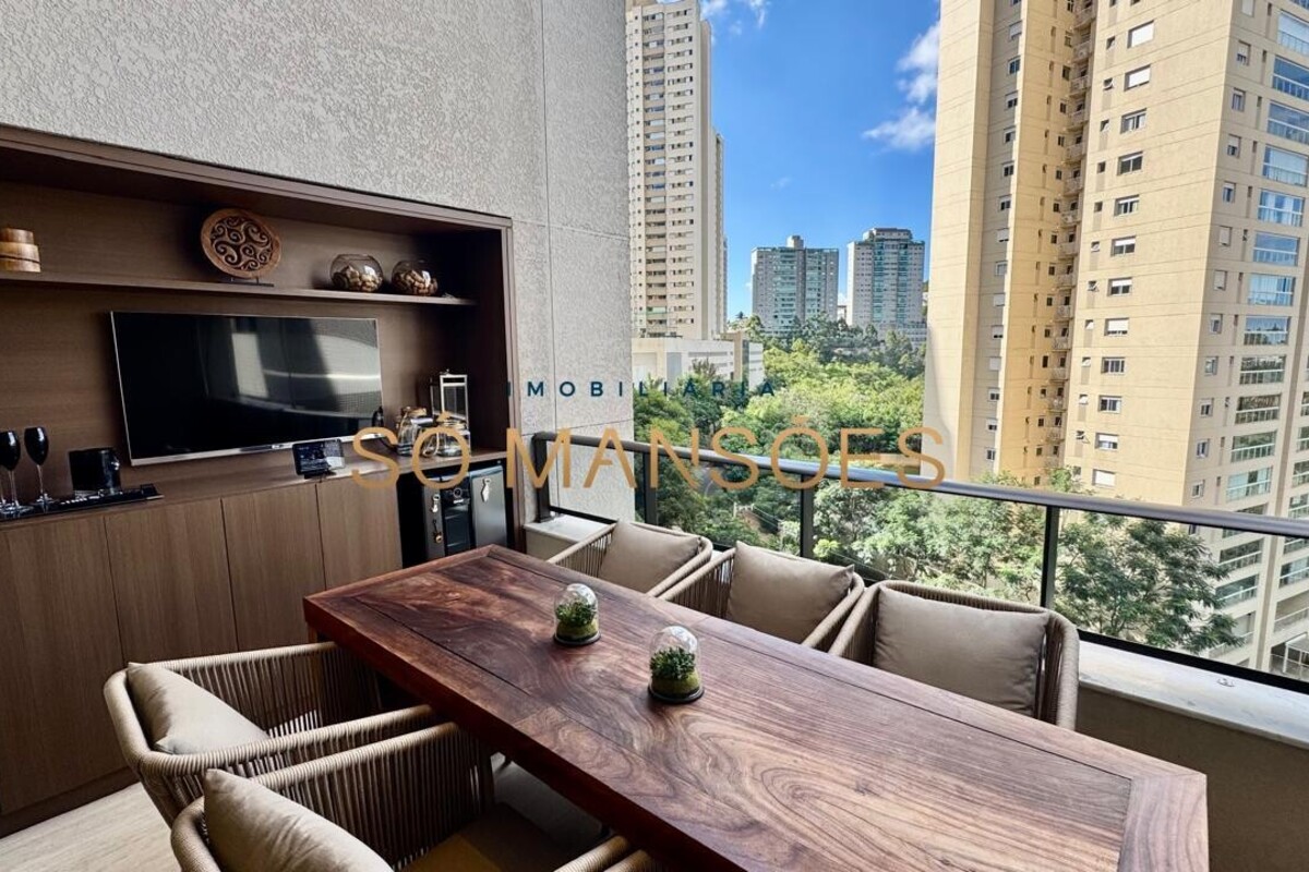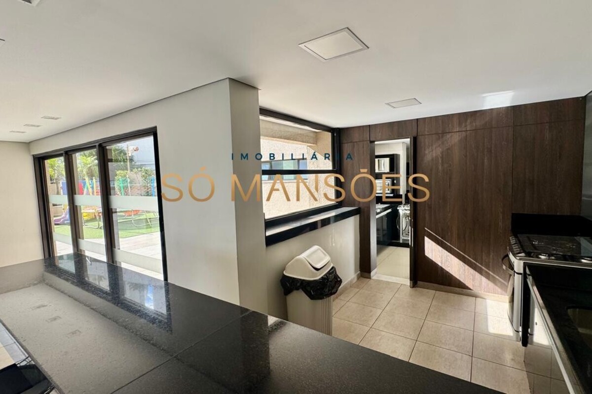 A varanda gourmet é um dos grandes destaques, com teto em madeira Tauari Indusparquet, torre para churrasqueira e pia esculpidas em mármore travertino, além de uma vista espetacular para o Vale do Sereno e Torre Altavila — um espaço ideal para receber com elegância.