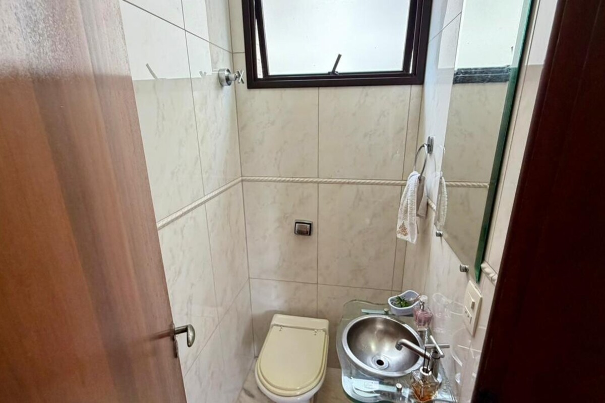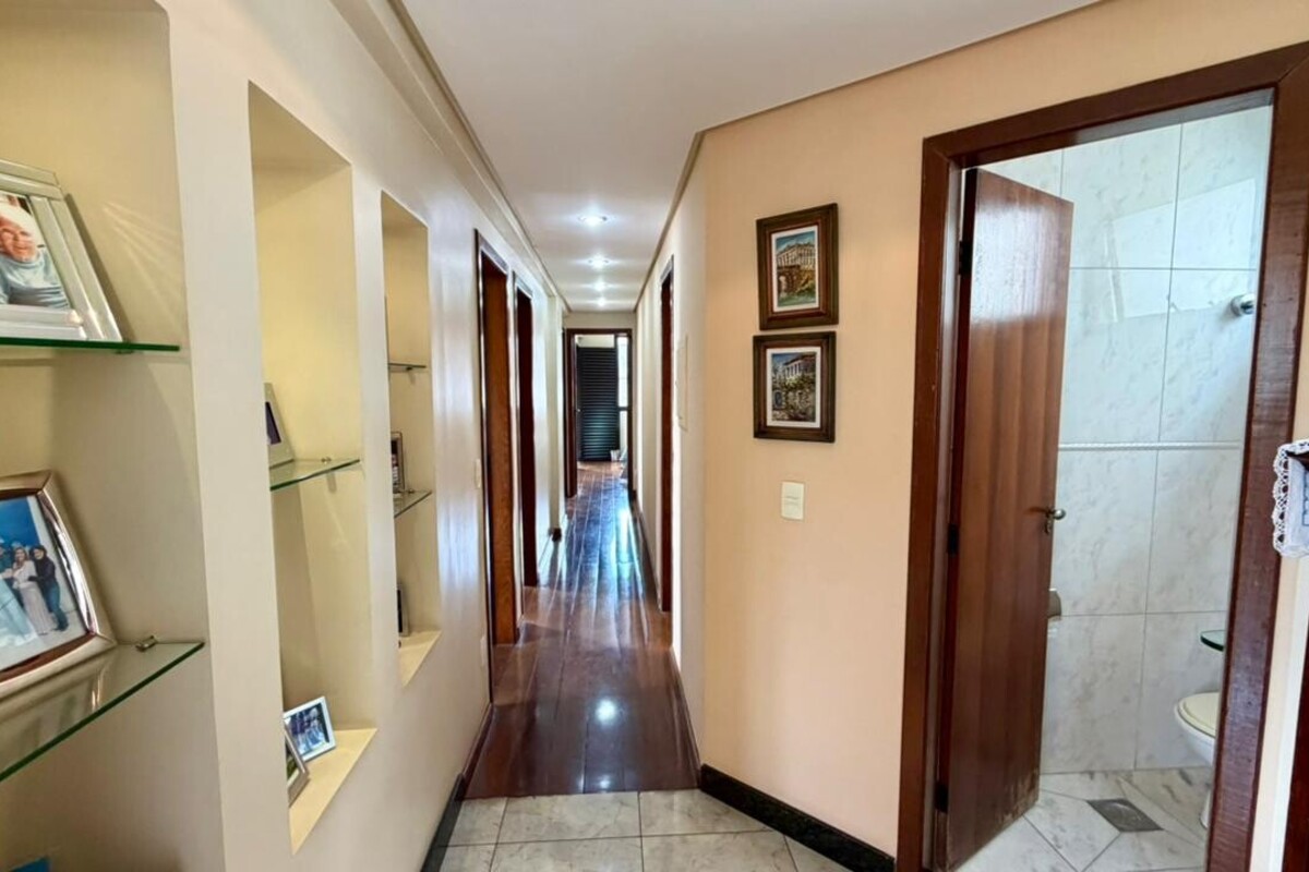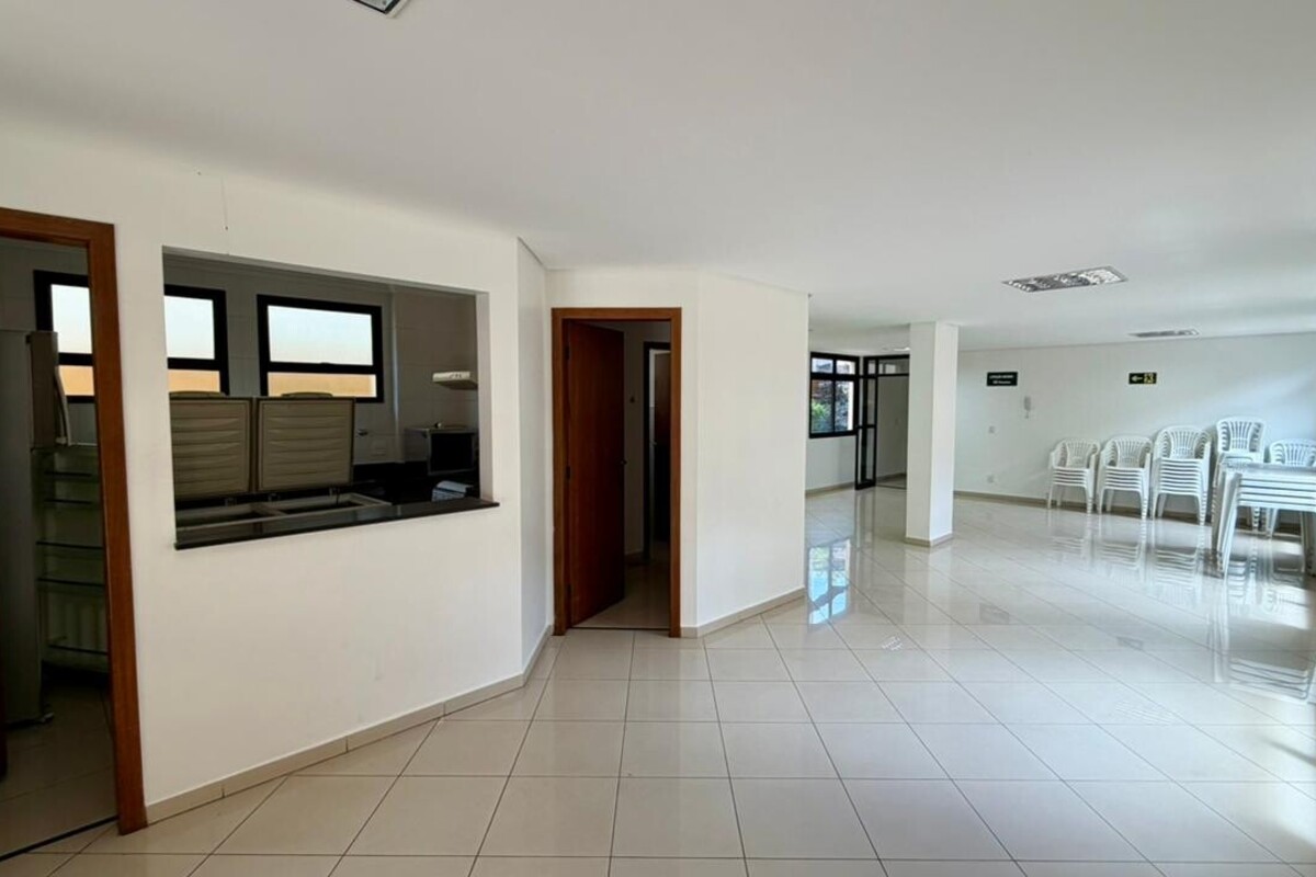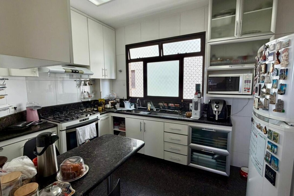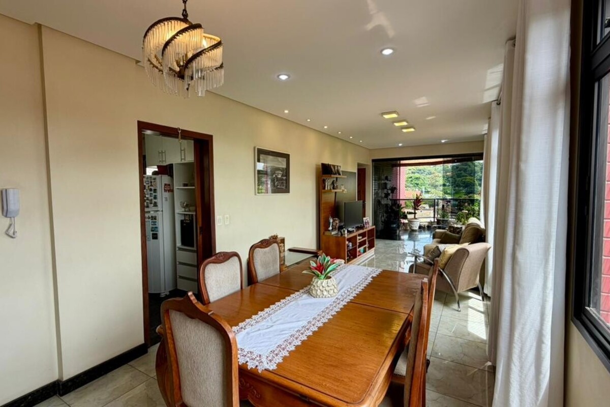 A área social é composta por sala para dois ambientes com varanda integrada, proporcionando boa iluminação e ventilação natural. O apartamento conta ainda com lavabo, cozinha funcional, área de serviço independente e dependência completa de empregada, atendendo bem à rotina do dia a dia.