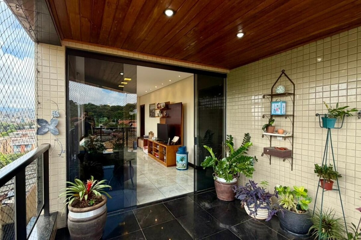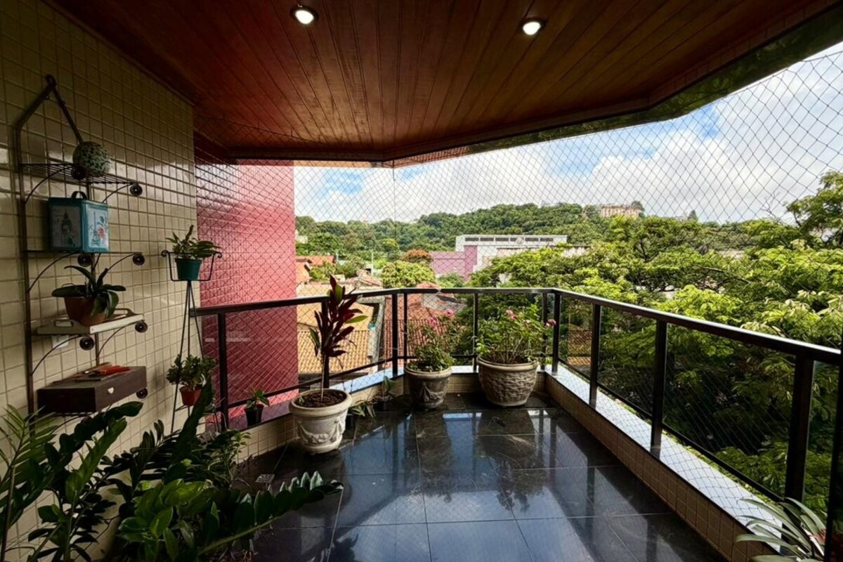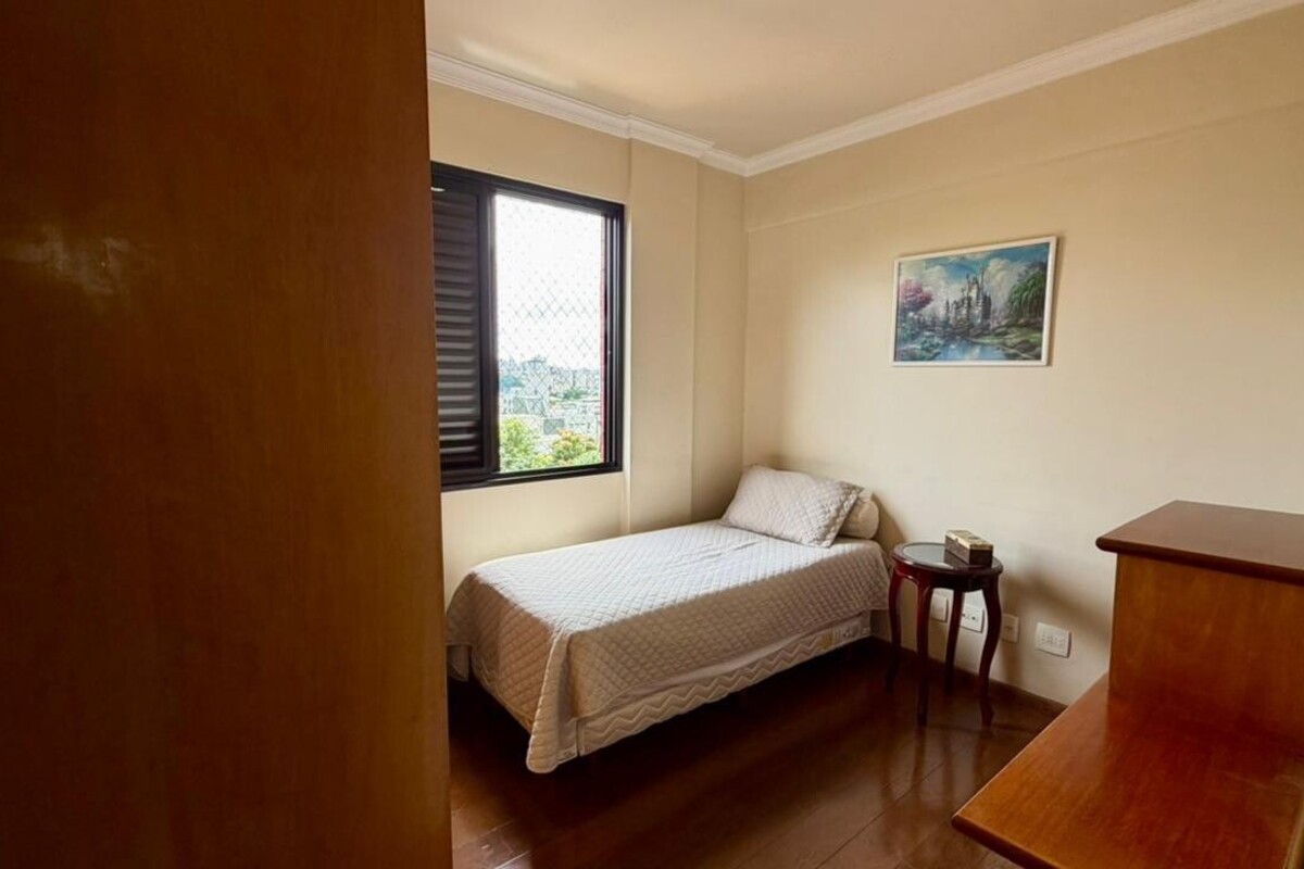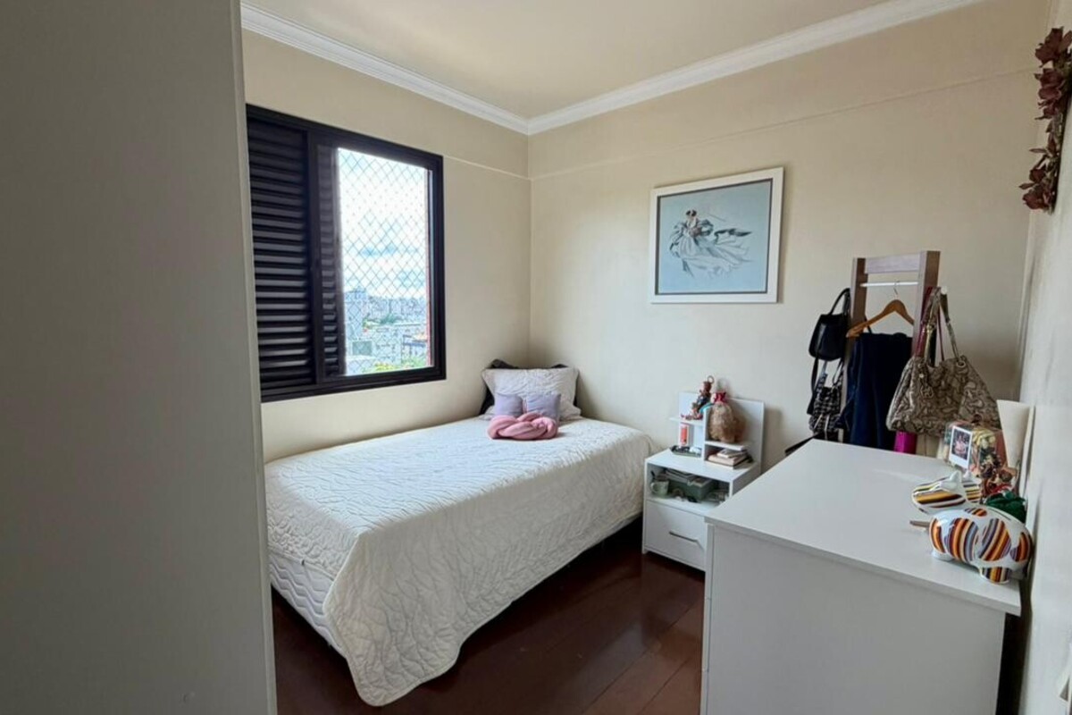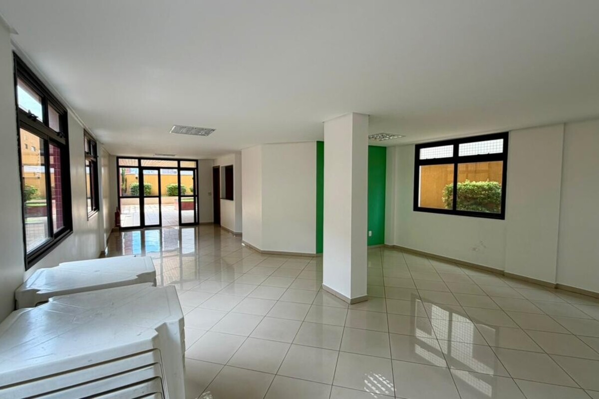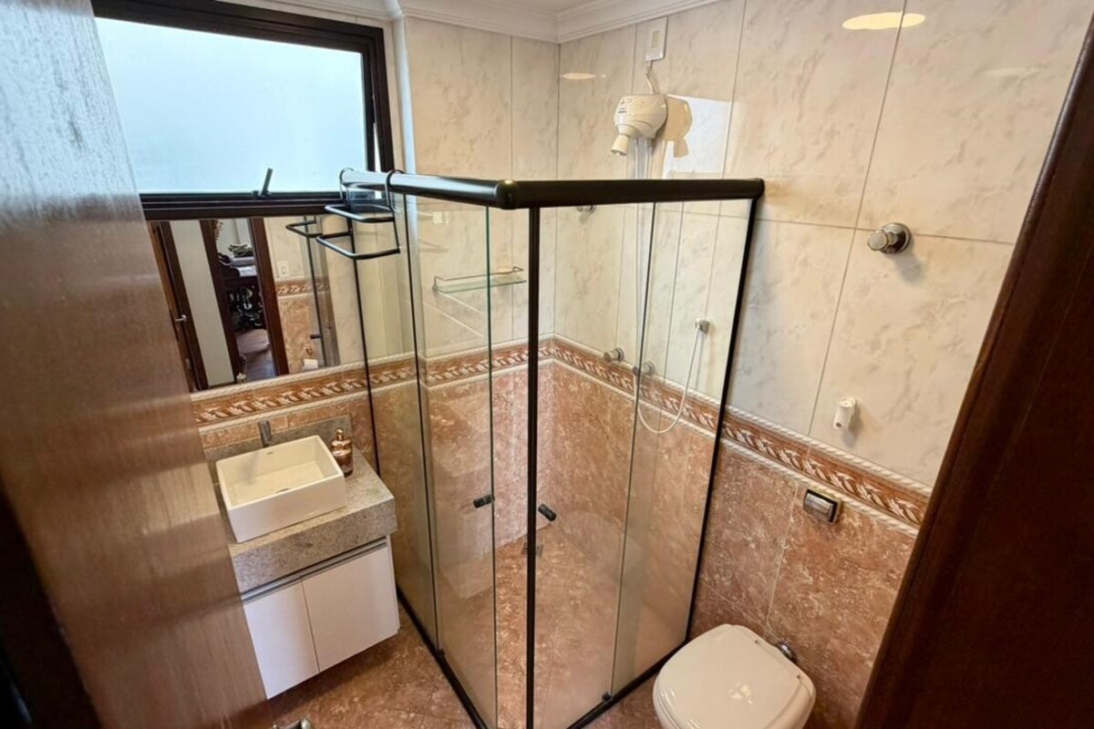 A área social é composta por sala para dois ambientes com varanda integrada, proporcionando boa iluminação e ventilação natural. O apartamento conta ainda com lavabo, cozinha funcional, área de serviço independente e dependência completa de empregada, atendendo bem à rotina do dia a dia.