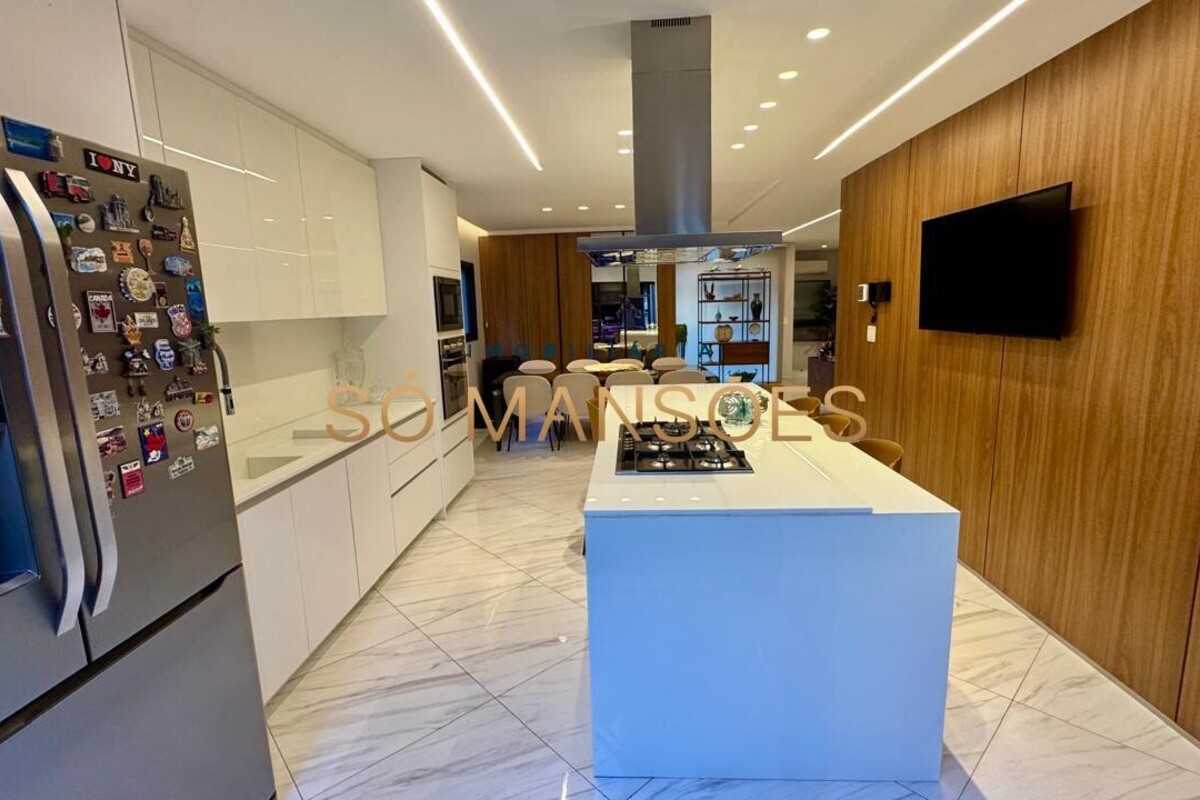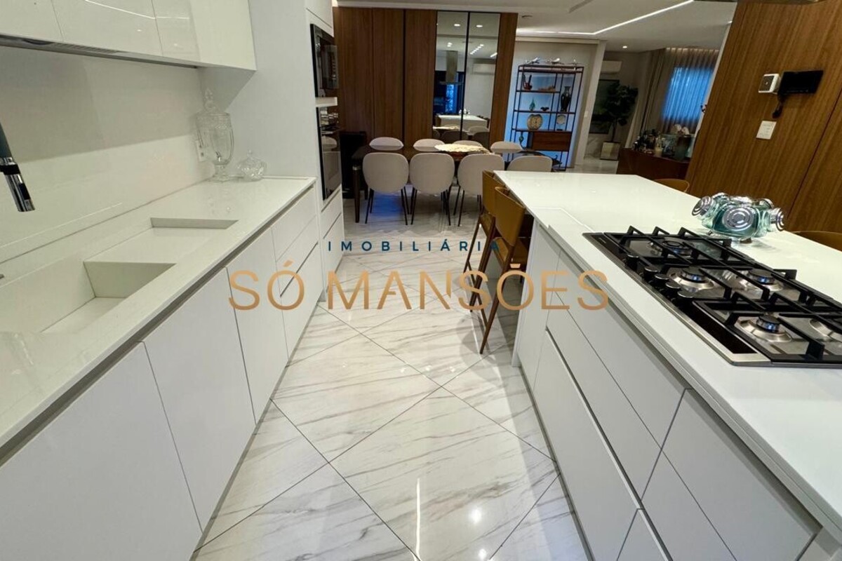 A área social impressiona pela integração e sofisticação. A sala ampla se conecta à cozinha americana, equipada com marcenaria L’Idea e bancadas em Nanoglass, além de uma elegante cristaleira iluminada. O lavabo se destaca pelo acabamento em pedra ônix, trazendo personalidade e requinte ao ambiente.