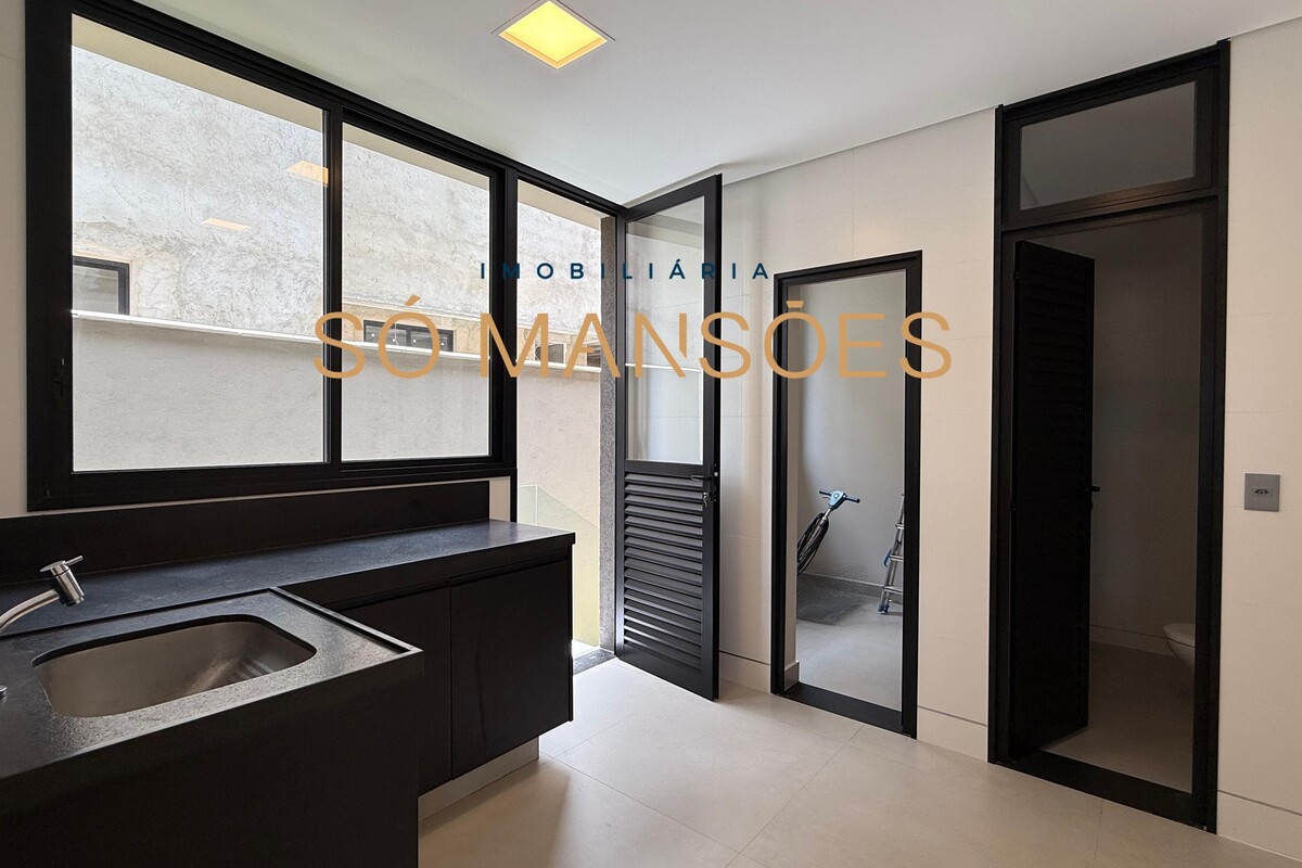 Além de área de serviço independente e DCE, a residência conta com garagem para 3 carros e jardim com paisagismo elaborado, complementando o cenário refinado desta propriedade exclusiva.