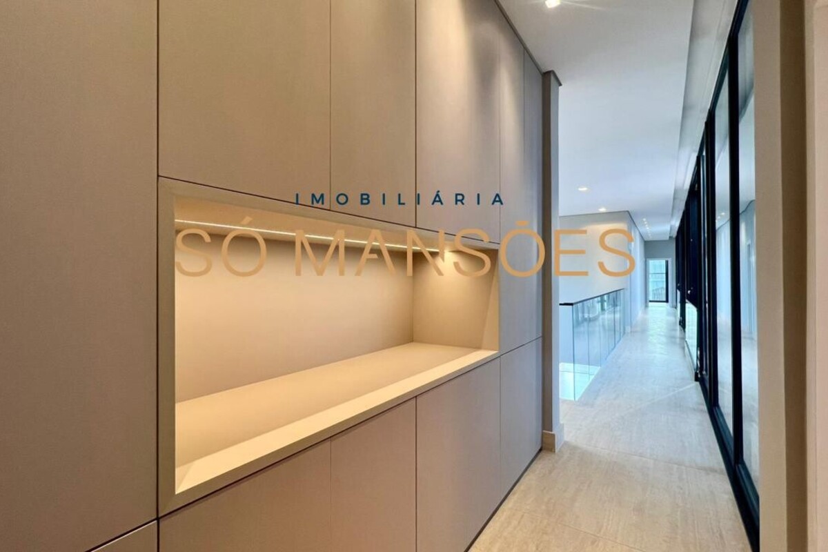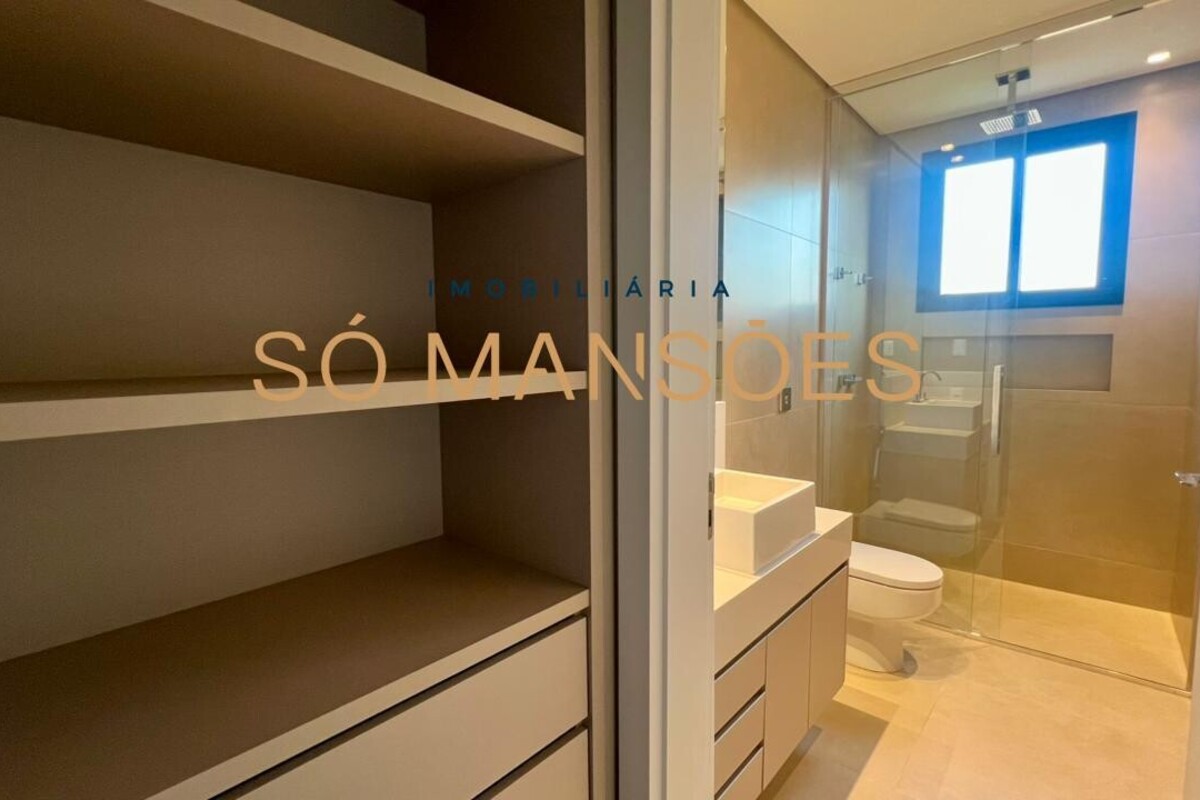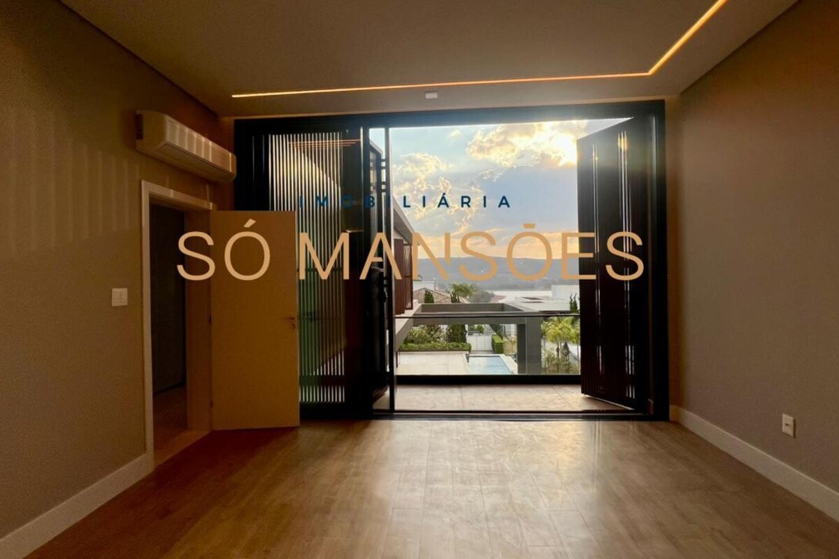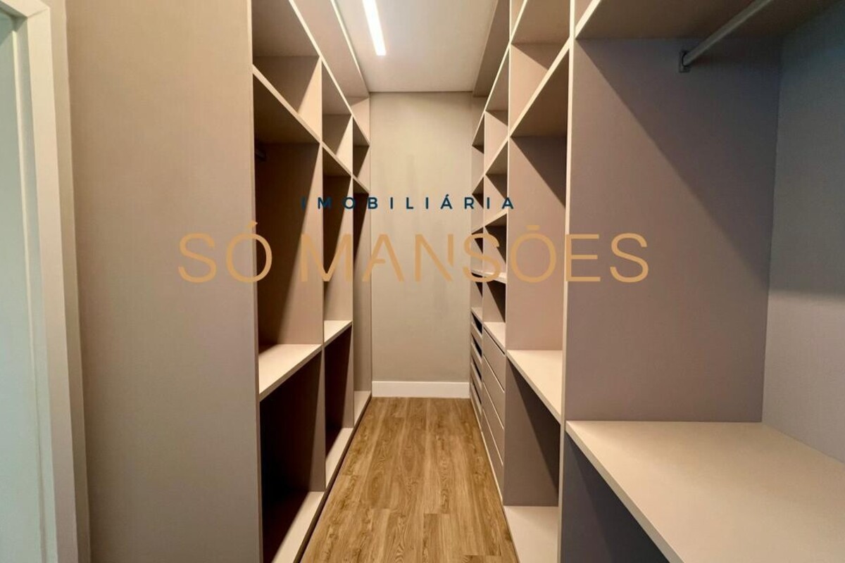 No pavimento superior, a área íntima dispõe de cinco suítes amplas, todas com closets planejados e marcenaria de alta qualidade. As portas piso-teto valorizam a vista e reforçam a sensação de amplitude e conexão com o entorno.