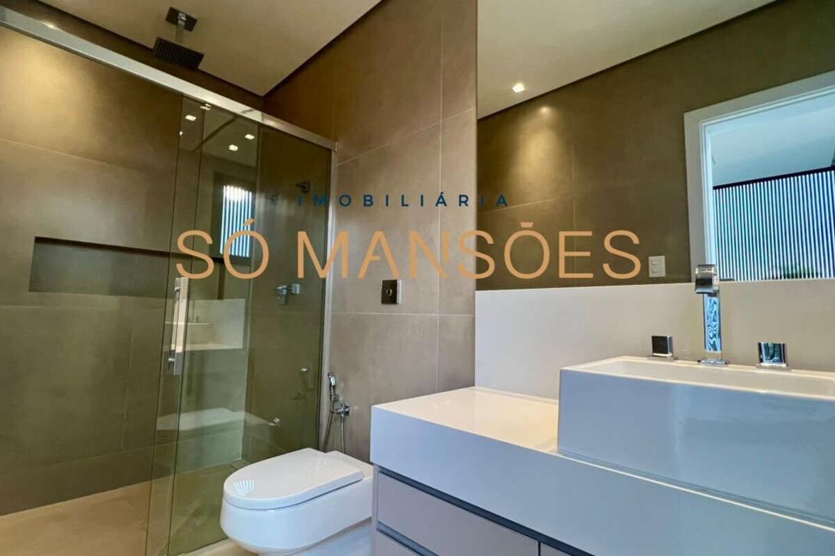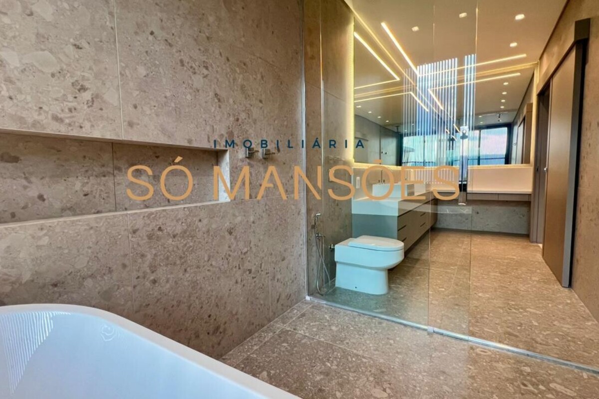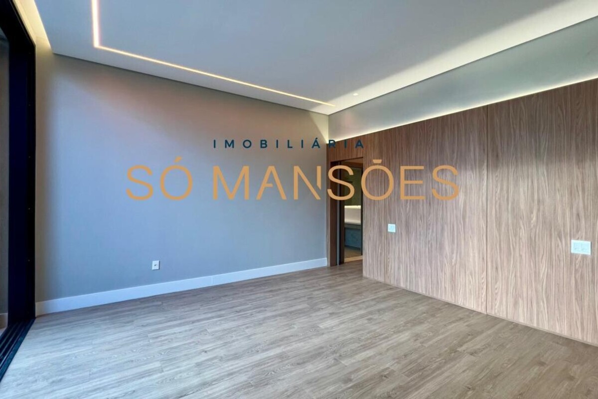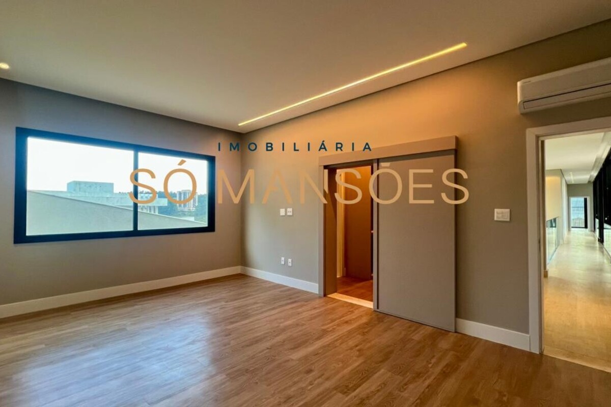 No pavimento superior, a área íntima dispõe de cinco suítes amplas, todas com closets planejados e marcenaria de alta qualidade. As portas piso-teto valorizam a vista e reforçam a sensação de amplitude e conexão com o entorno.