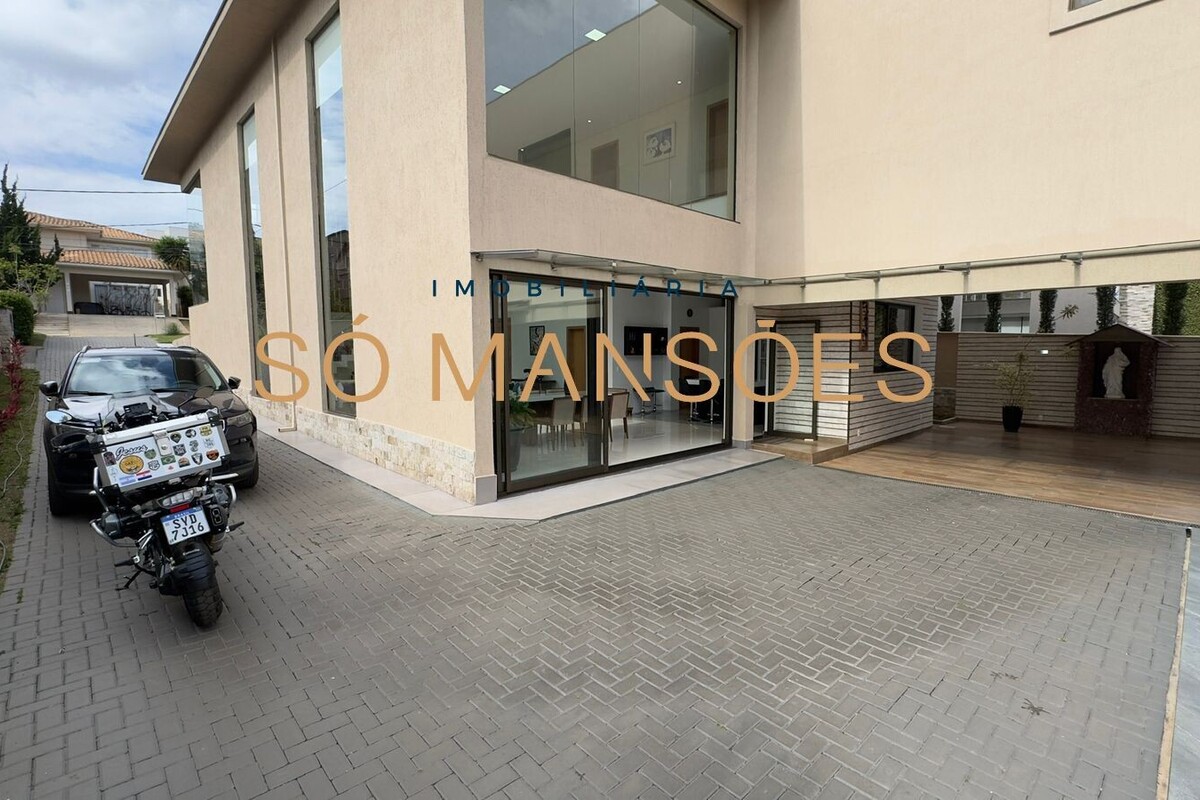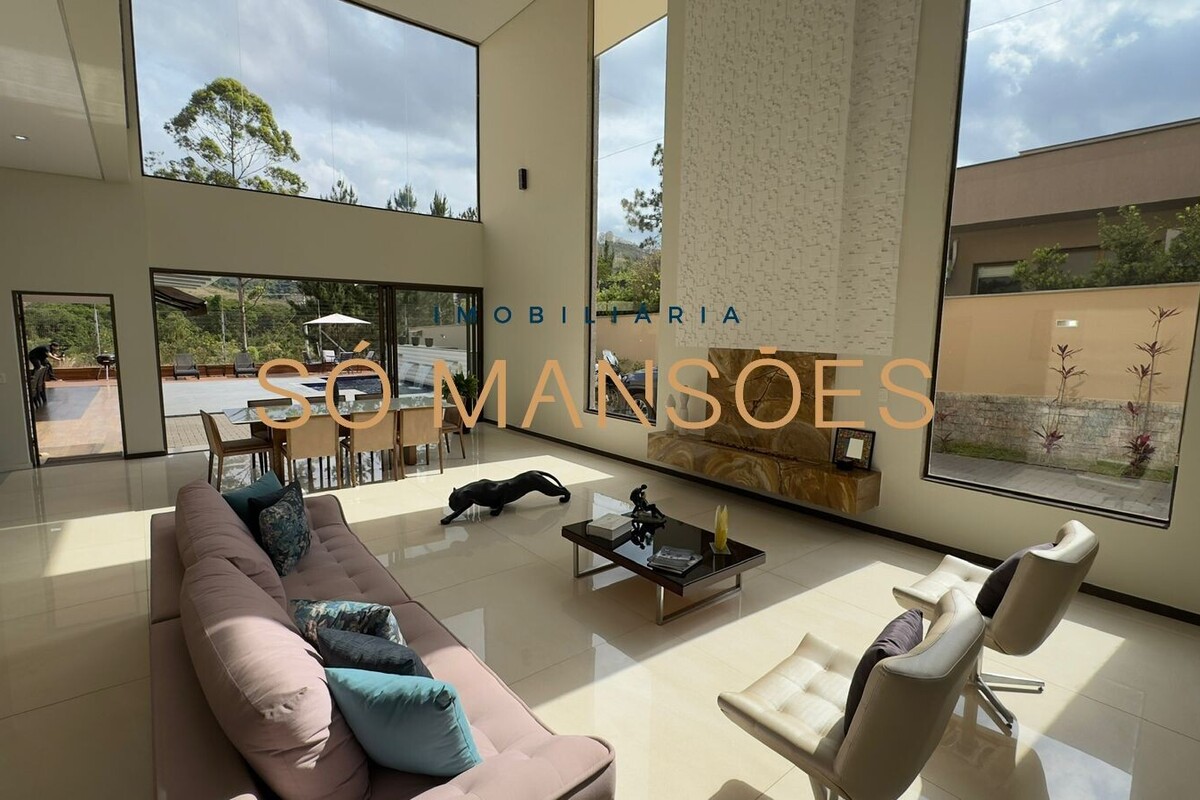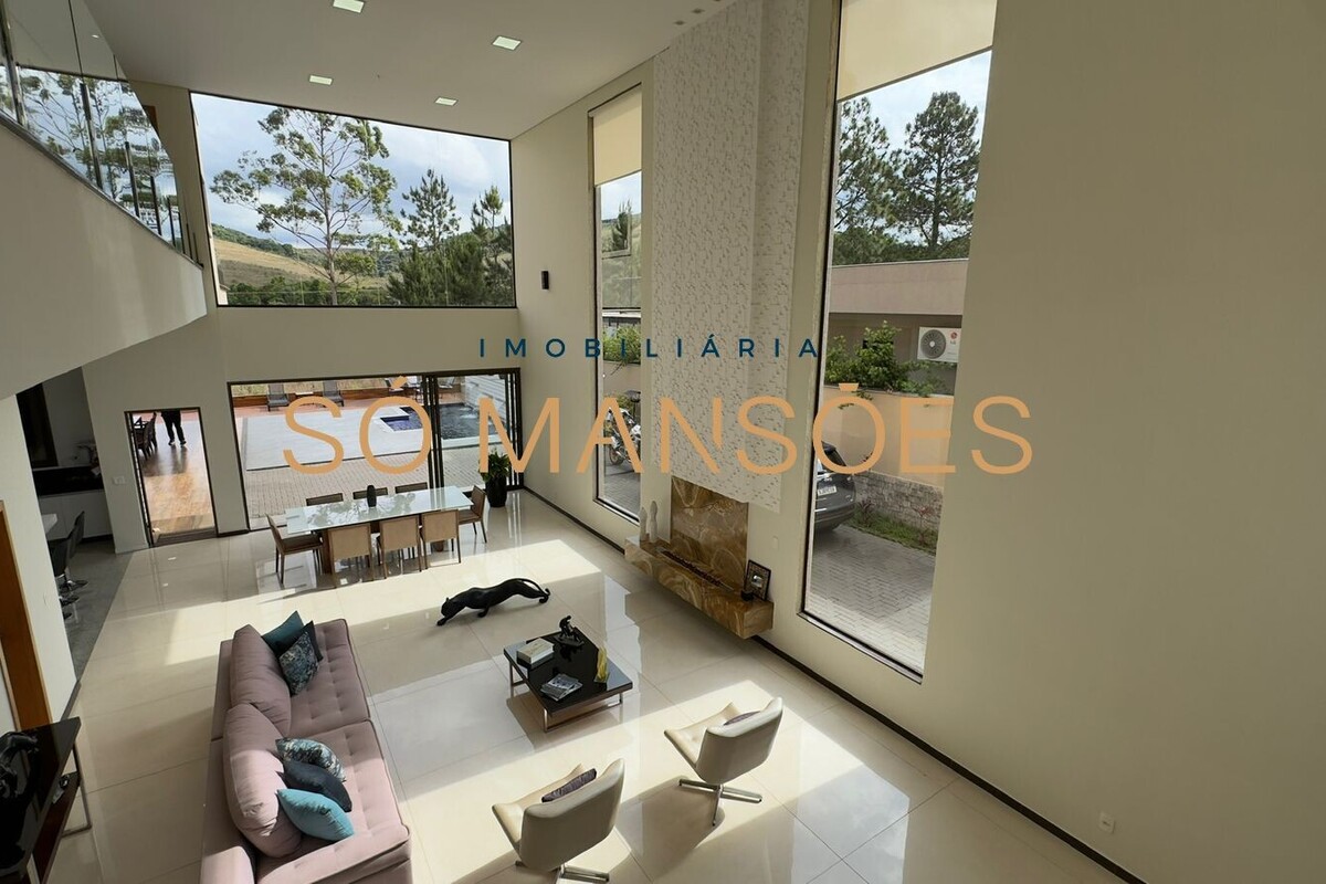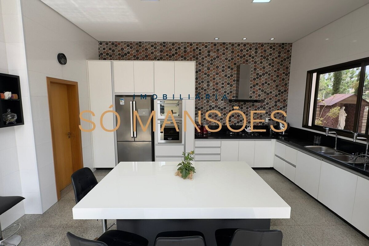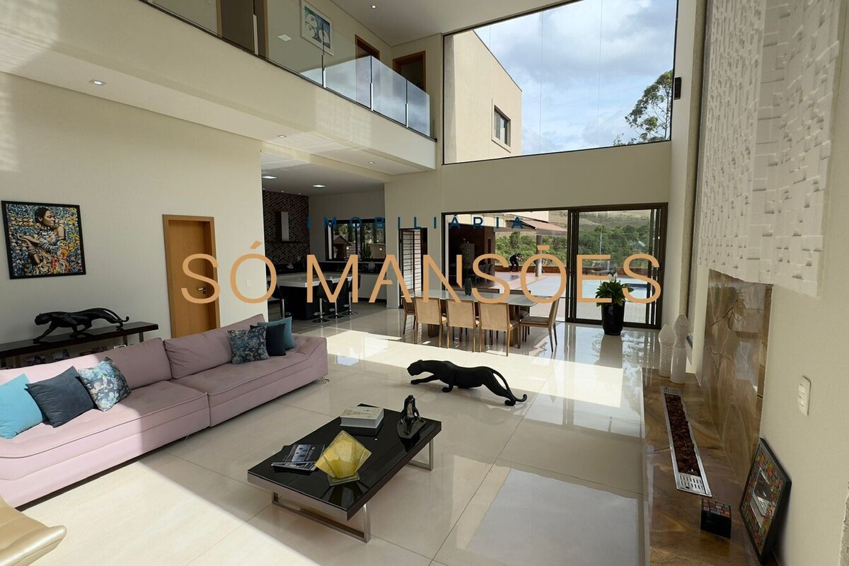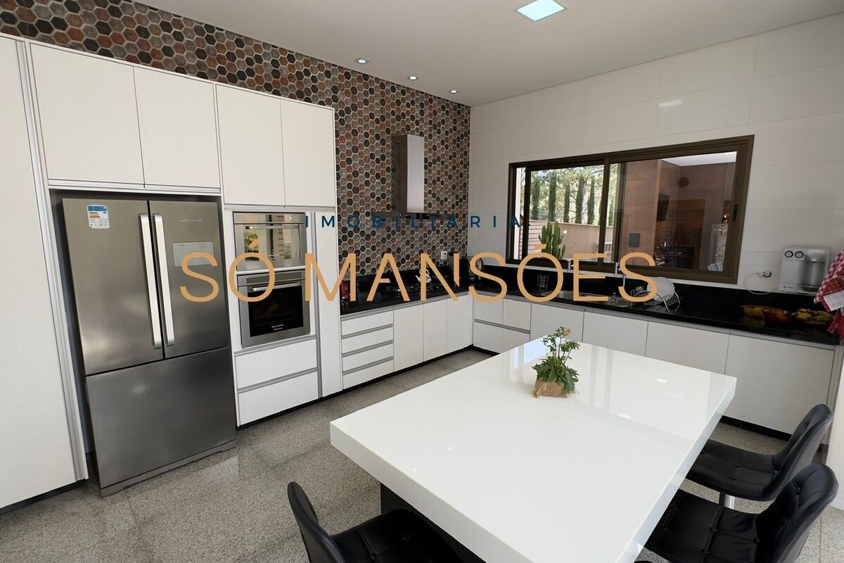 A entrada apresenta pé-direito elevado e ampla iluminação natural. Os ambientes sociais são espaçosos e bem distribuídos, com sala de estar equipada com lareira e vista para o verde. A cozinha gourmet possui bancadas em granito, armários planejados e eletrodomésticos de alto padrão, integrando praticidade e sofisticação no dia a dia.