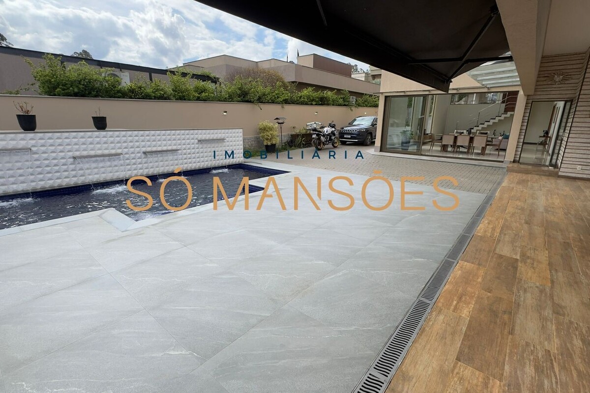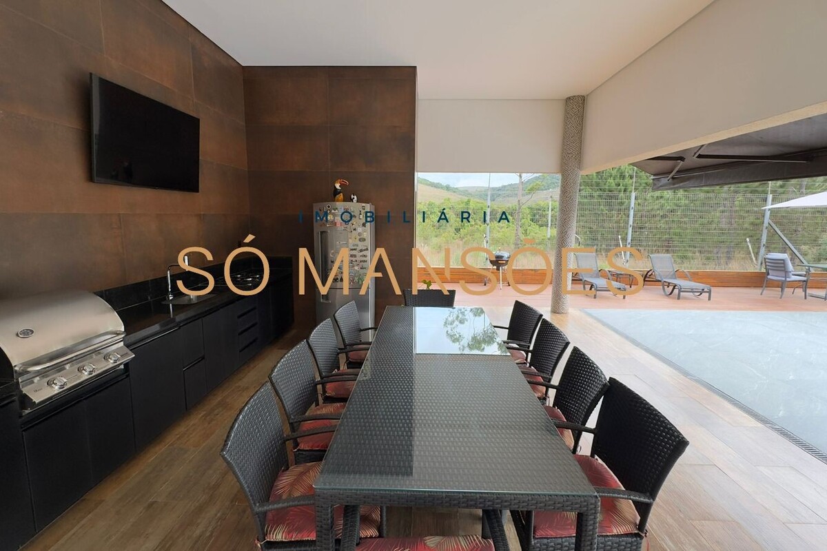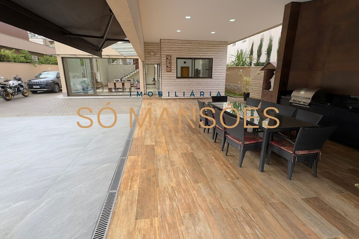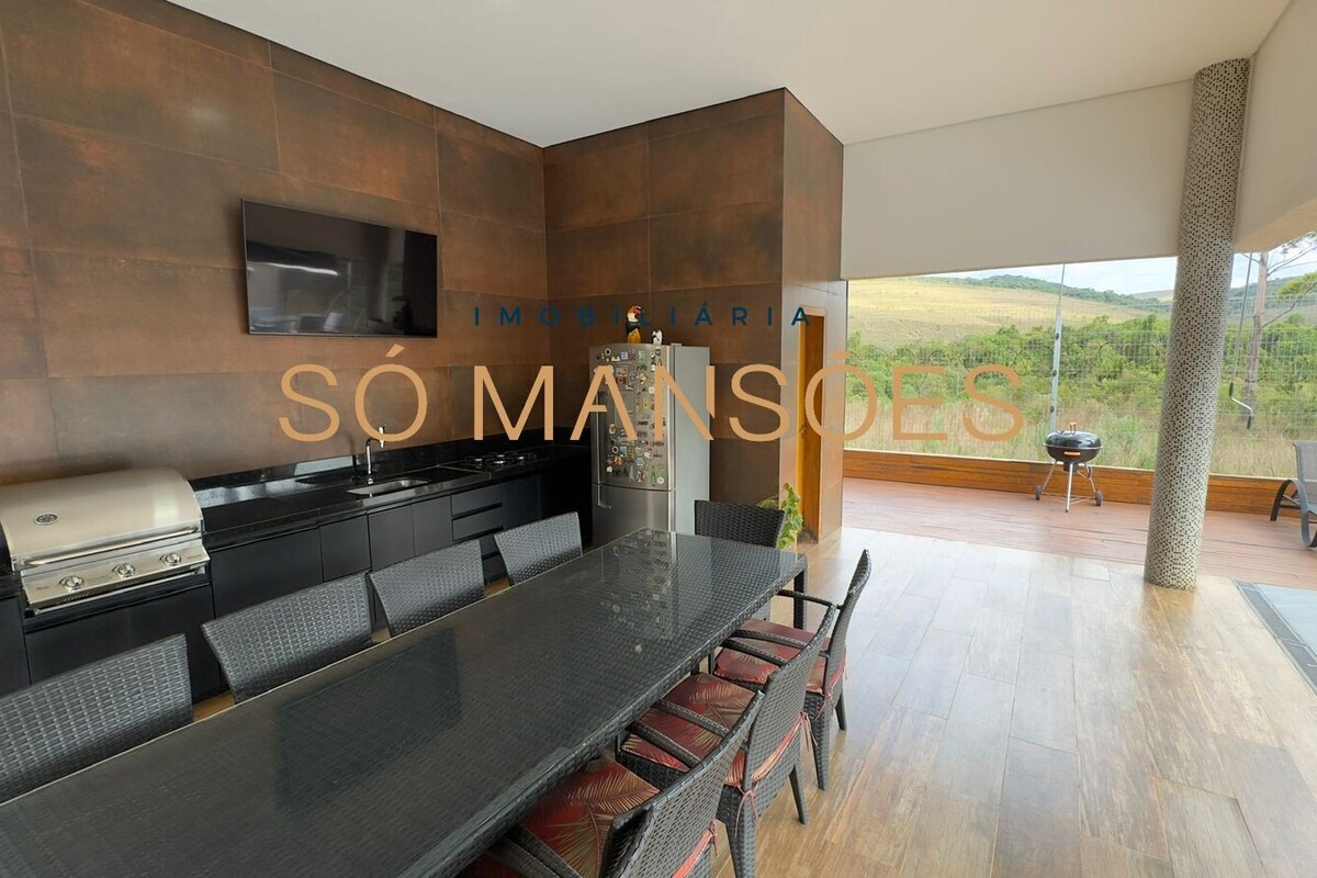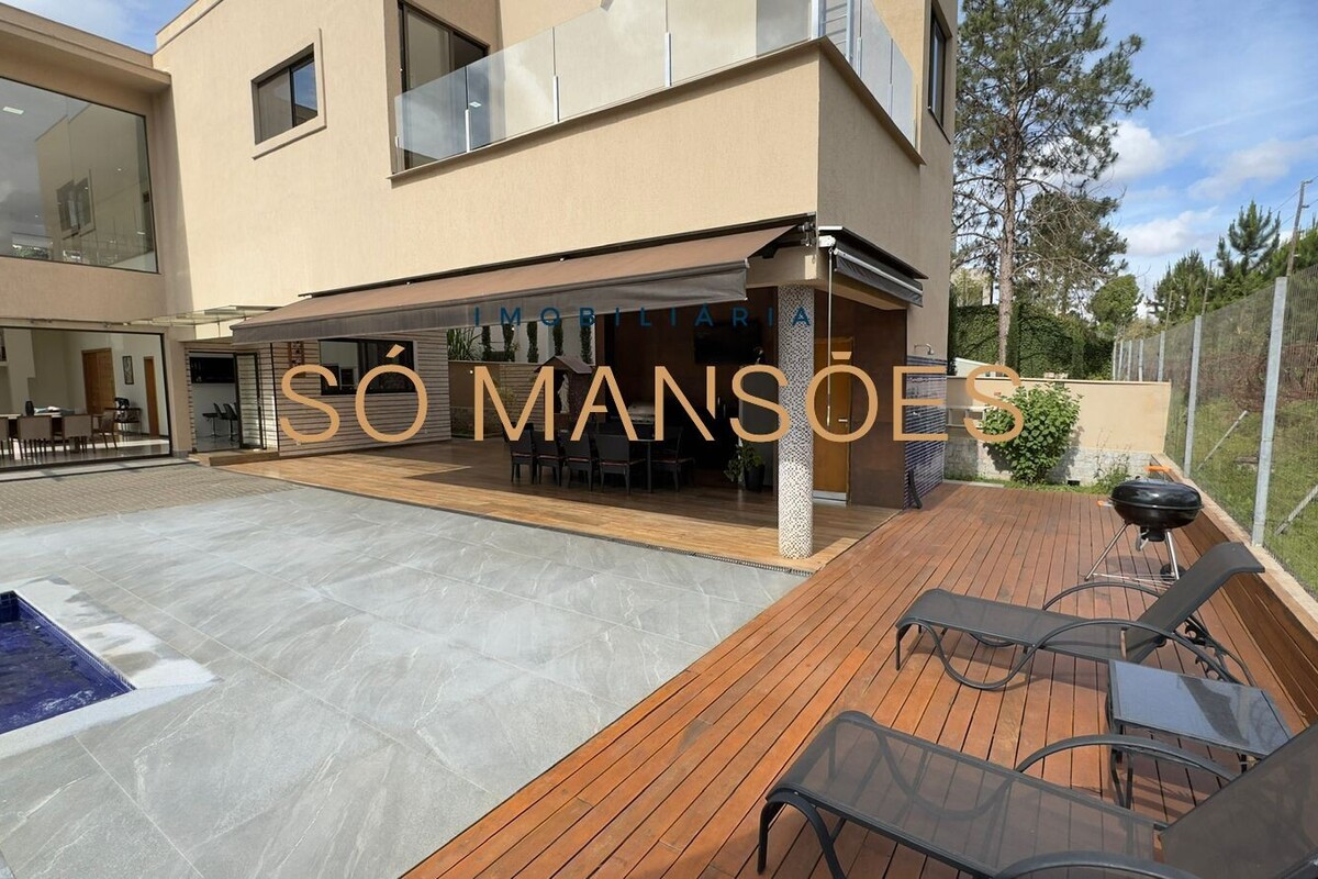 A entrada apresenta pé-direito elevado e ampla iluminação natural. Os ambientes sociais são espaçosos e bem distribuídos, com sala de estar equipada com lareira e vista para o verde. A cozinha gourmet possui bancadas em granito, armários planejados e eletrodomésticos de alto padrão, integrando praticidade e sofisticação no dia a dia.