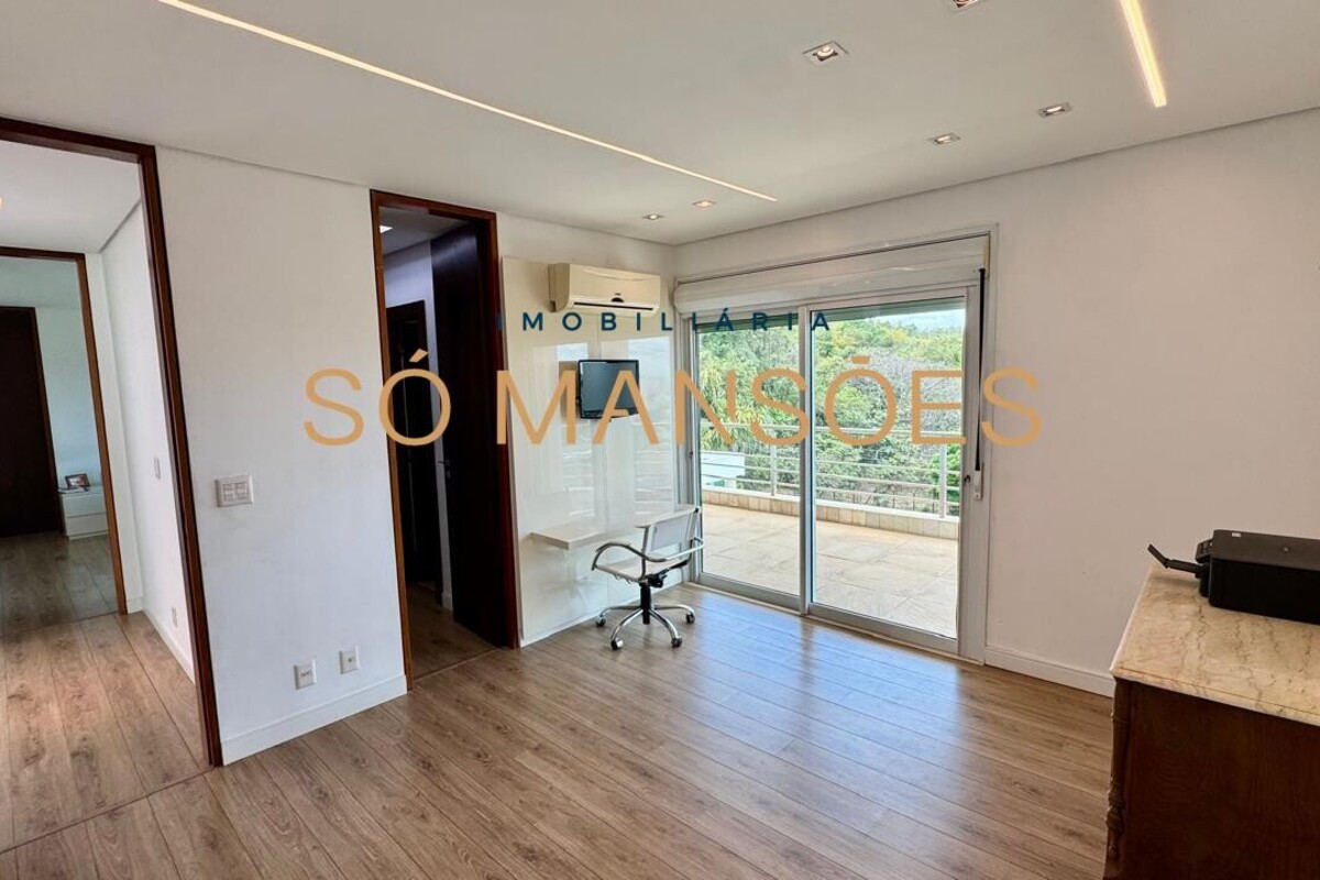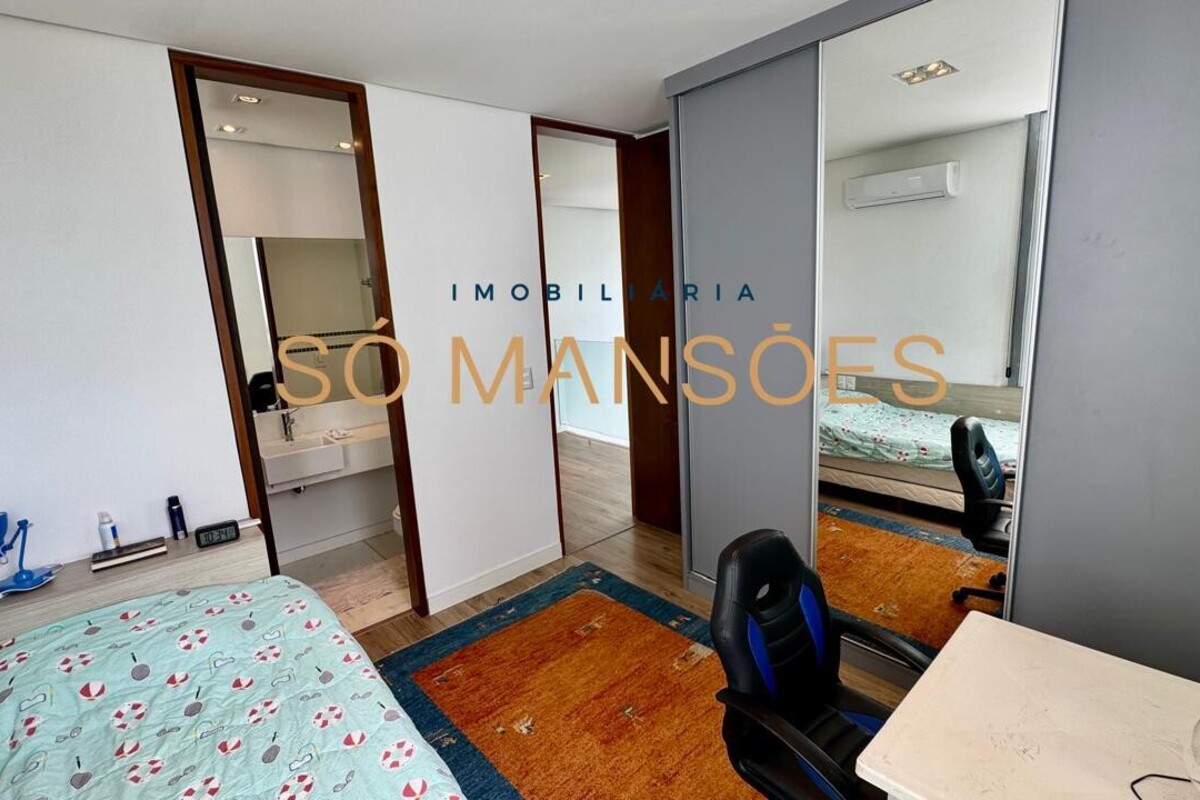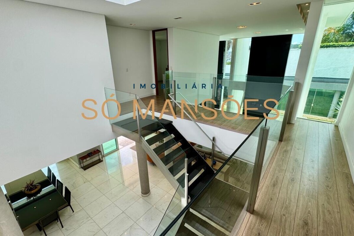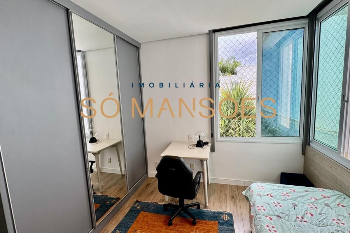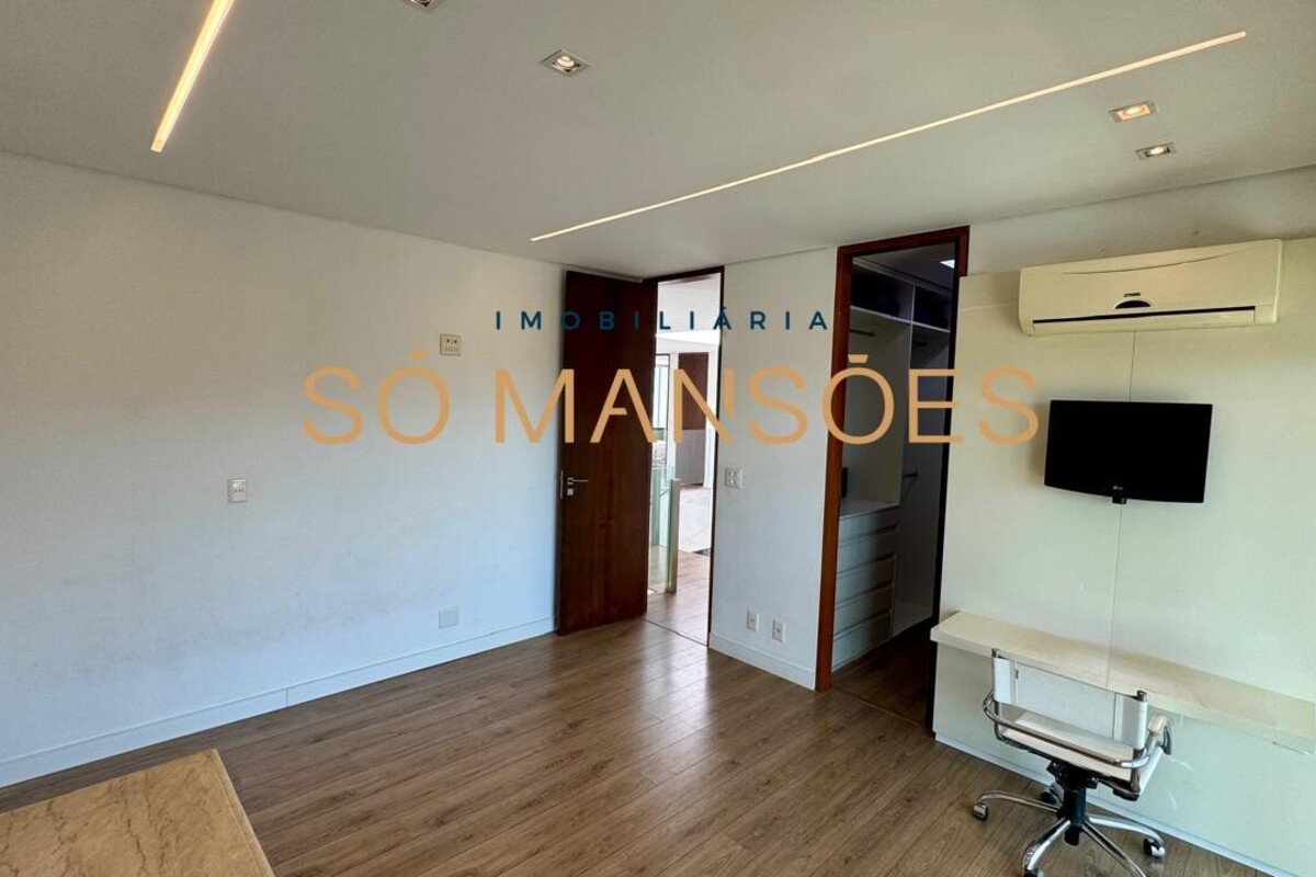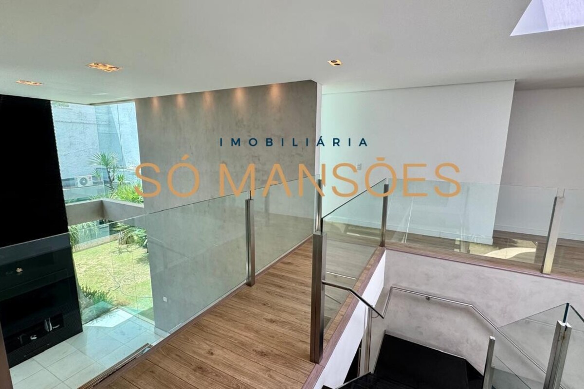 No pavimento superior, o acesso é feito por uma escada moderna em inox e vidro. A área íntima conta com quatro suítes, sendo duas com closet e três com varanda. Há ainda um quarto de apoio que pode ser integrado à suíte master. Todos os ambientes possuem ar-condicionado, armários em ótimo estado e acabamentos conservados.