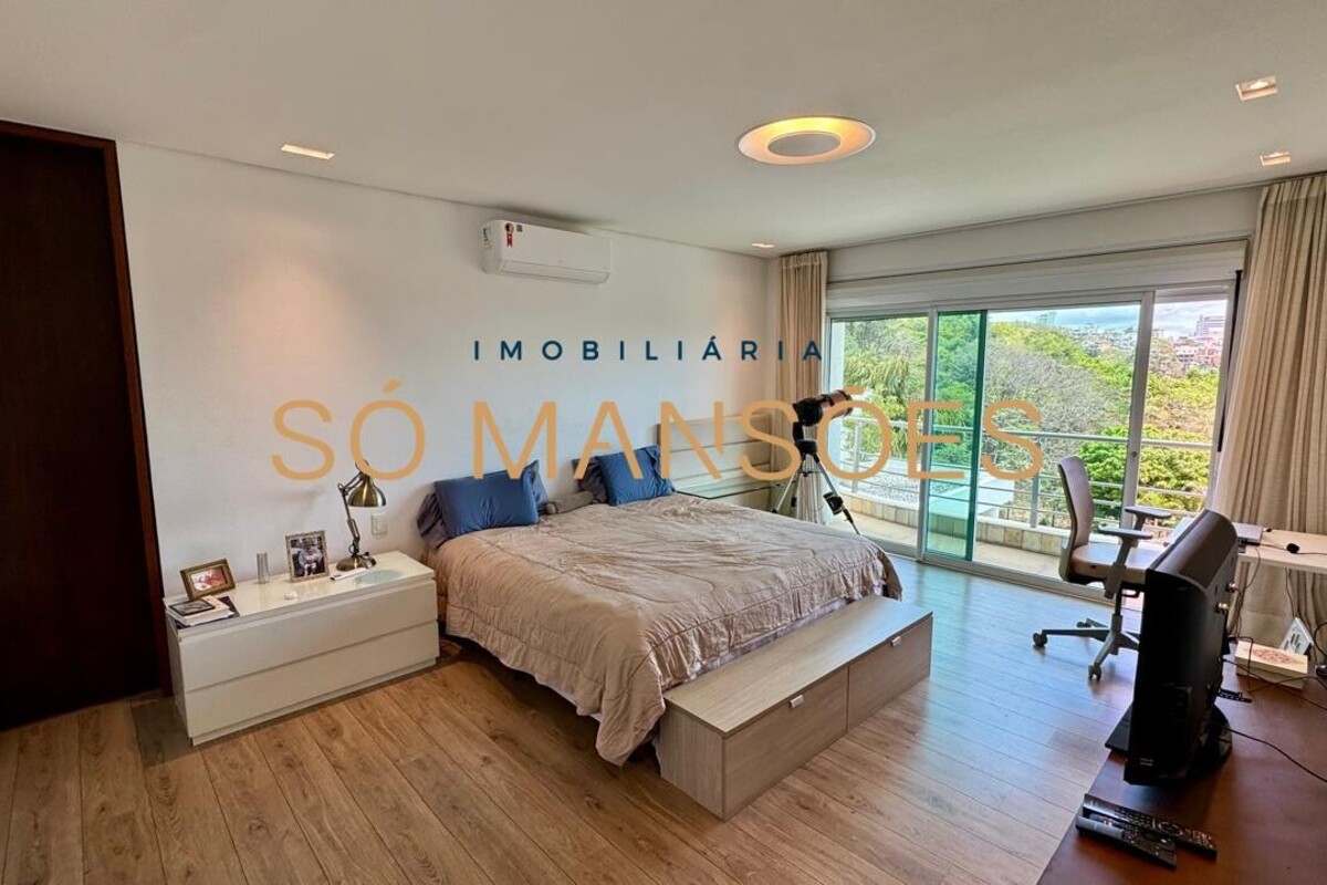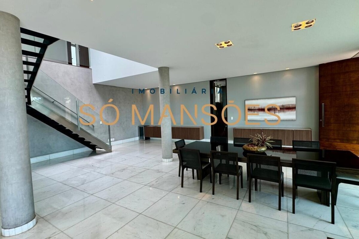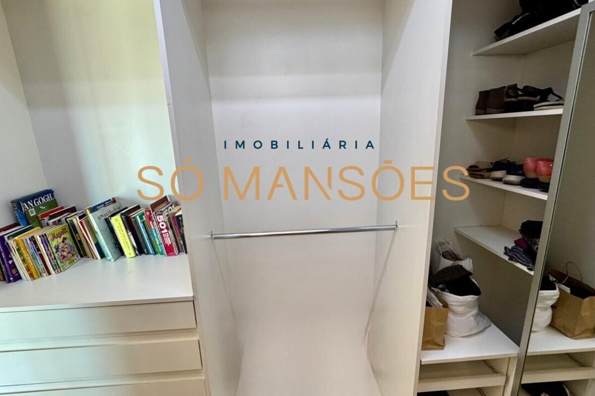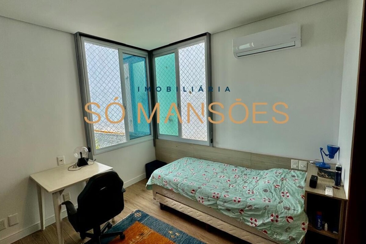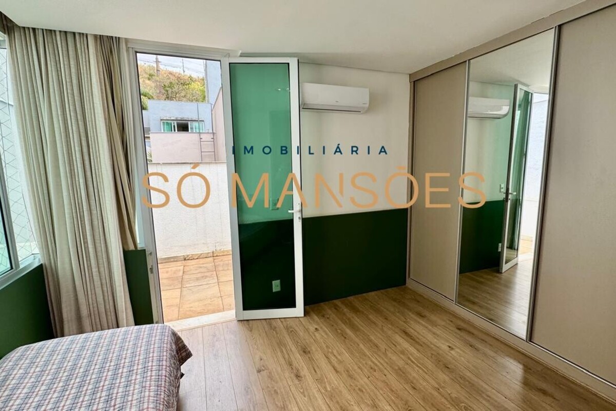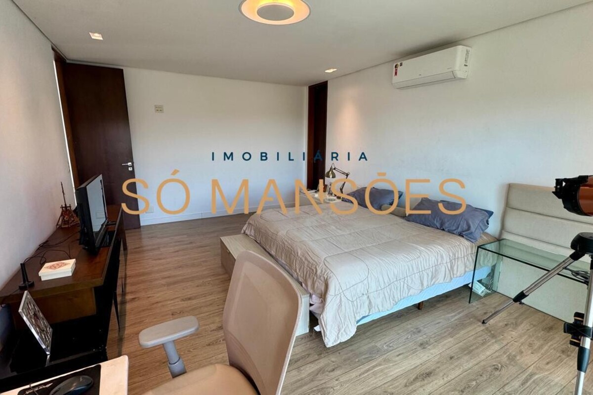 No pavimento superior, o acesso é feito por uma escada moderna em inox e vidro. A área íntima conta com quatro suítes, sendo duas com closet e três com varanda. Há ainda um quarto de apoio que pode ser integrado à suíte master. Todos os ambientes possuem ar-condicionado, armários em ótimo estado e acabamentos conservados.