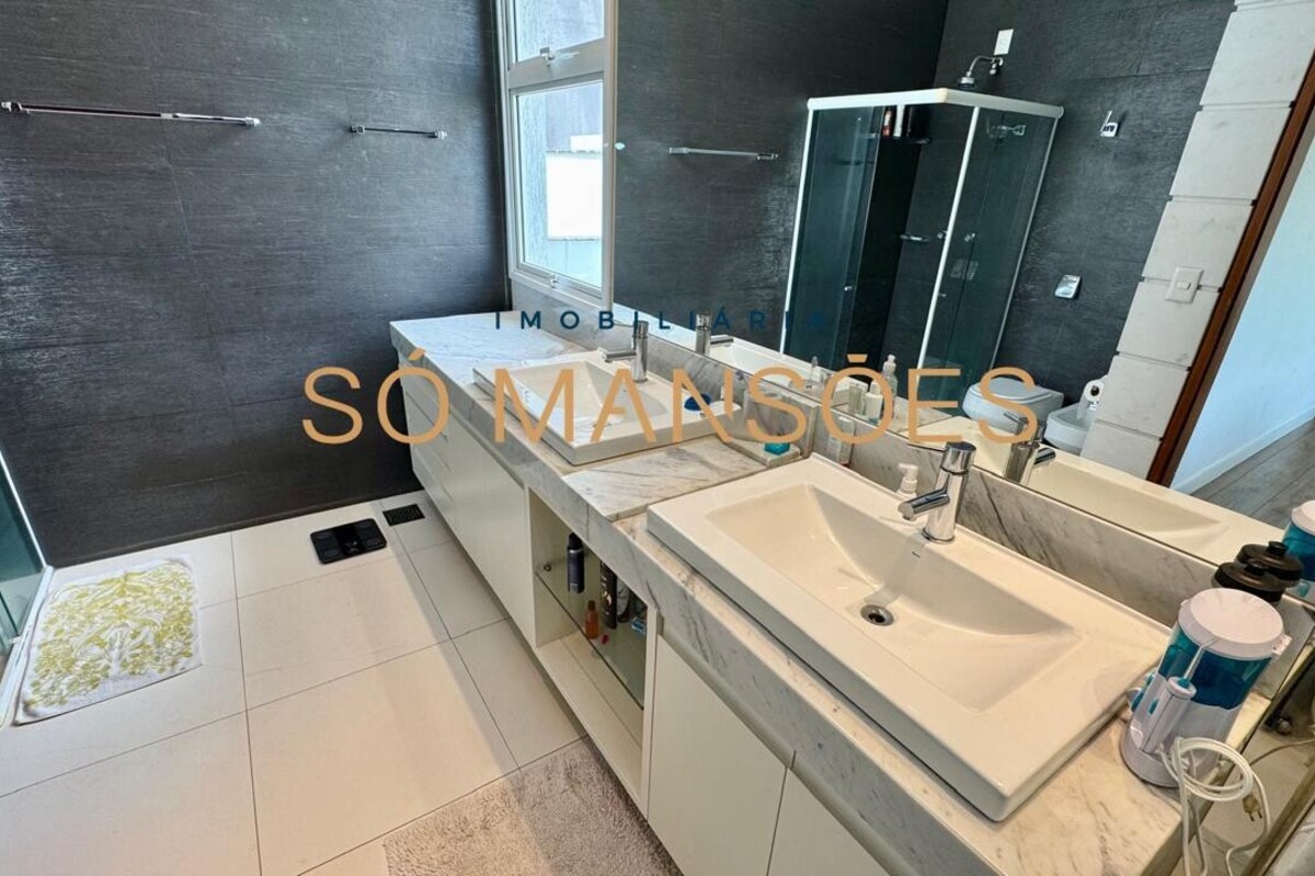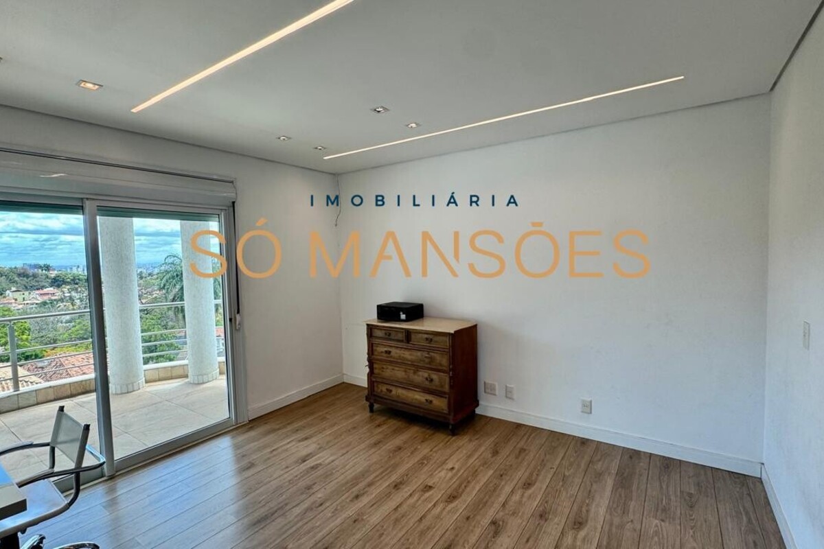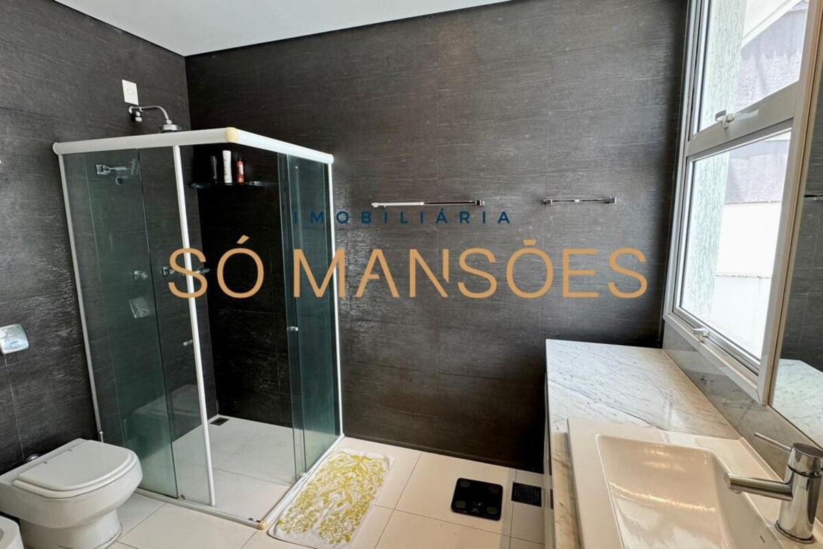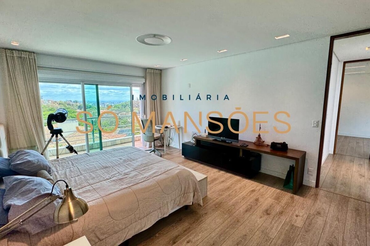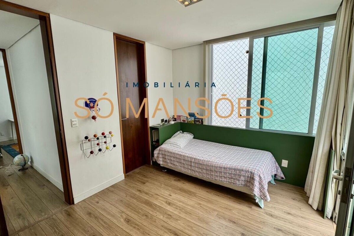 No pavimento superior, o acesso é feito por uma escada moderna em inox e vidro. A área íntima conta com quatro suítes, sendo duas com closet e três com varanda. Há ainda um quarto de apoio que pode ser integrado à suíte master. Todos os ambientes possuem ar-condicionado, armários em ótimo estado e acabamentos conservados.