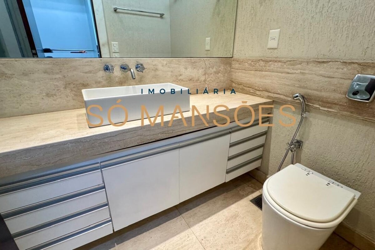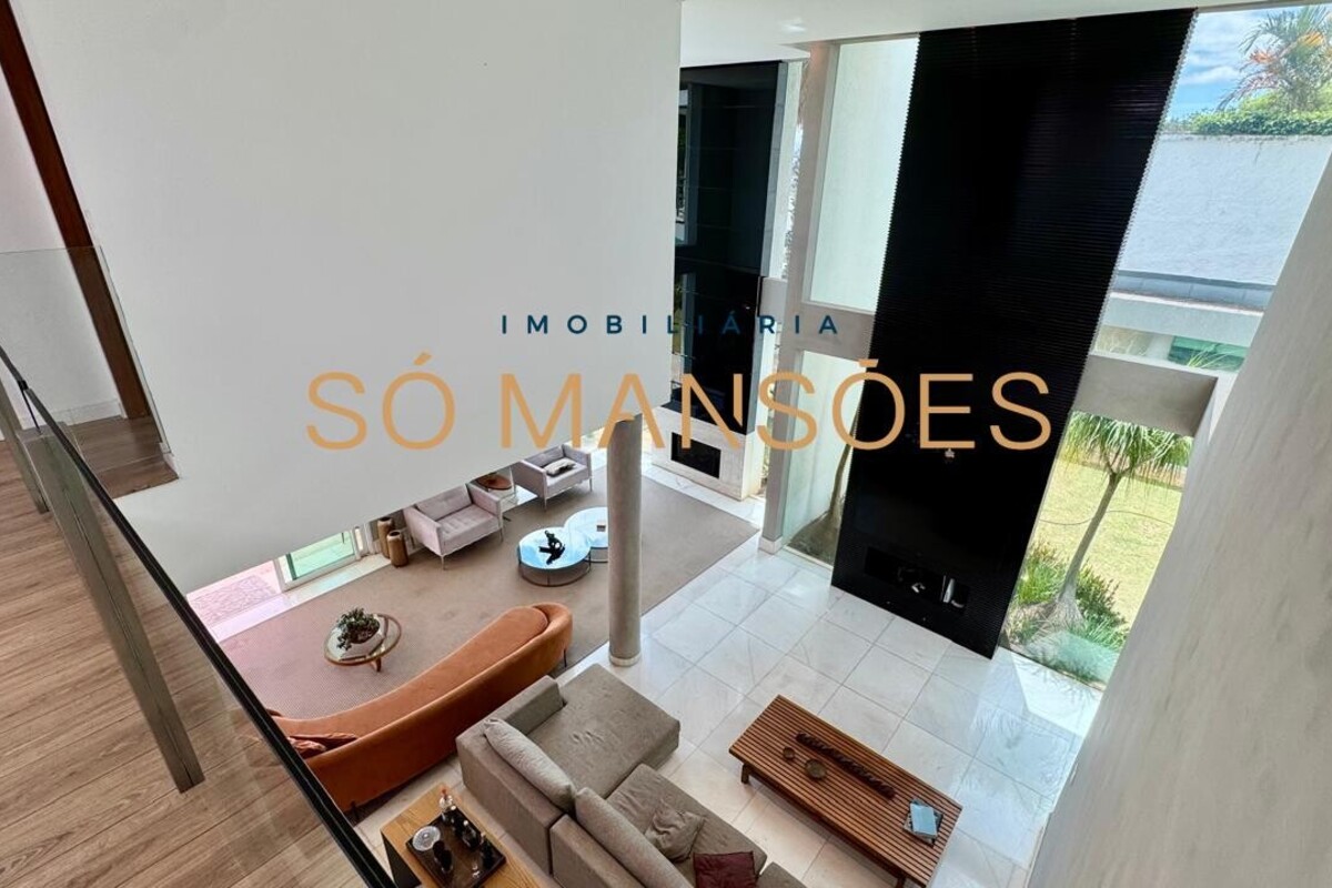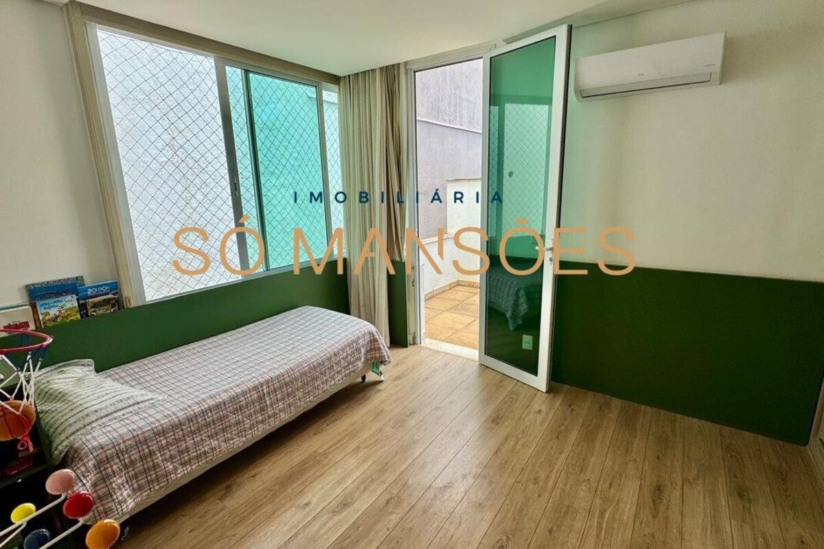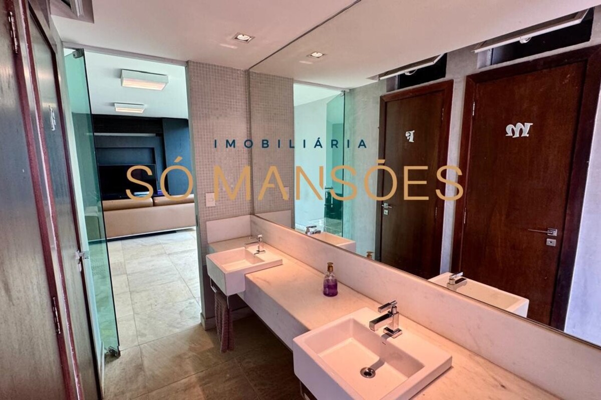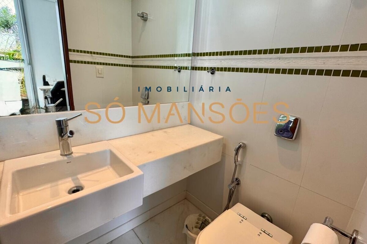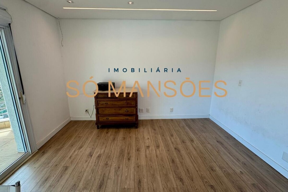 No pavimento superior, o acesso é feito por uma escada moderna em inox e vidro. A área íntima conta com quatro suítes, sendo duas com closet e três com varanda. Há ainda um quarto de apoio que pode ser integrado à suíte master. Todos os ambientes possuem ar-condicionado, armários em ótimo estado e acabamentos conservados.