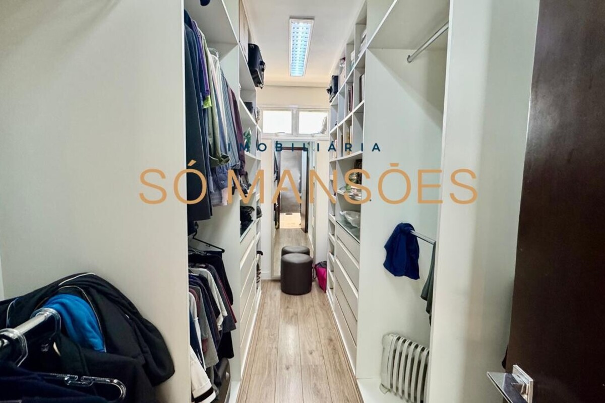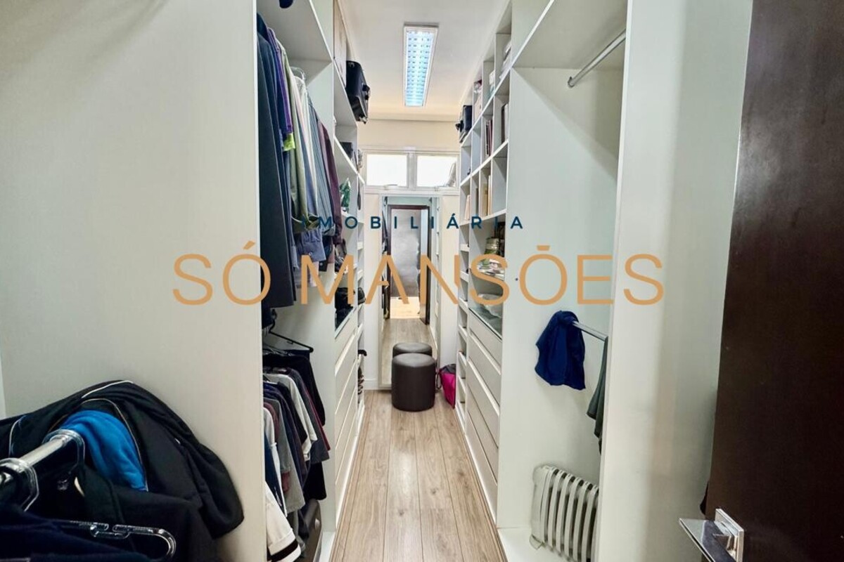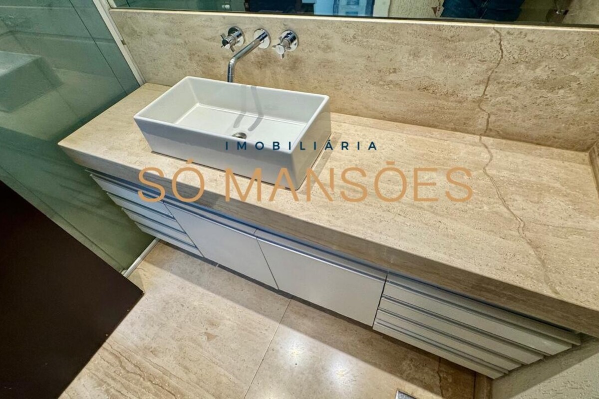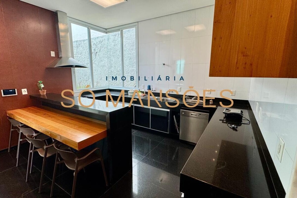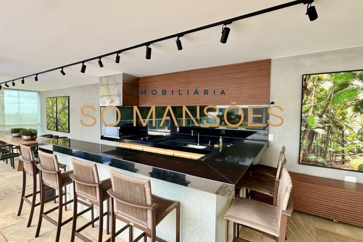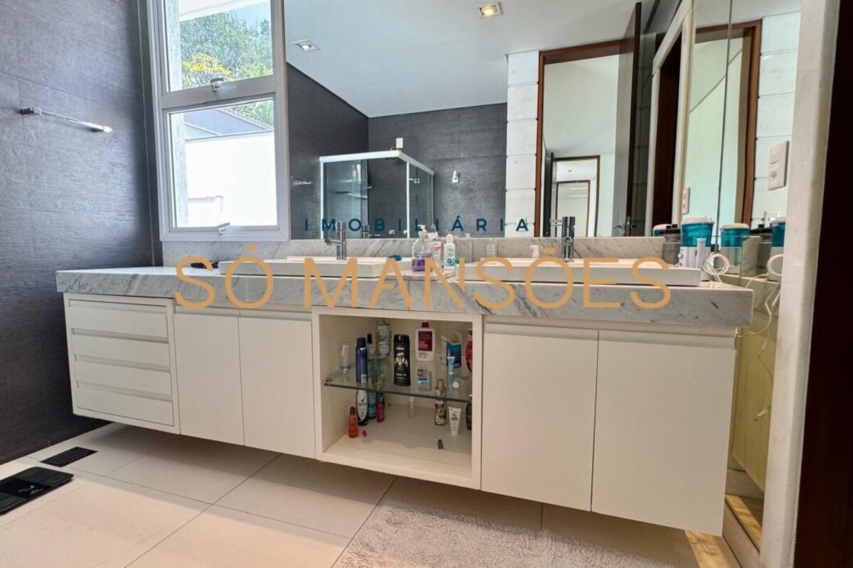 No pavimento superior, o acesso é feito por uma escada moderna em inox e vidro. A área íntima conta com quatro suítes, sendo duas com closet e três com varanda. Há ainda um quarto de apoio que pode ser integrado à suíte master. Todos os ambientes possuem ar-condicionado, armários em ótimo estado e acabamentos conservados.