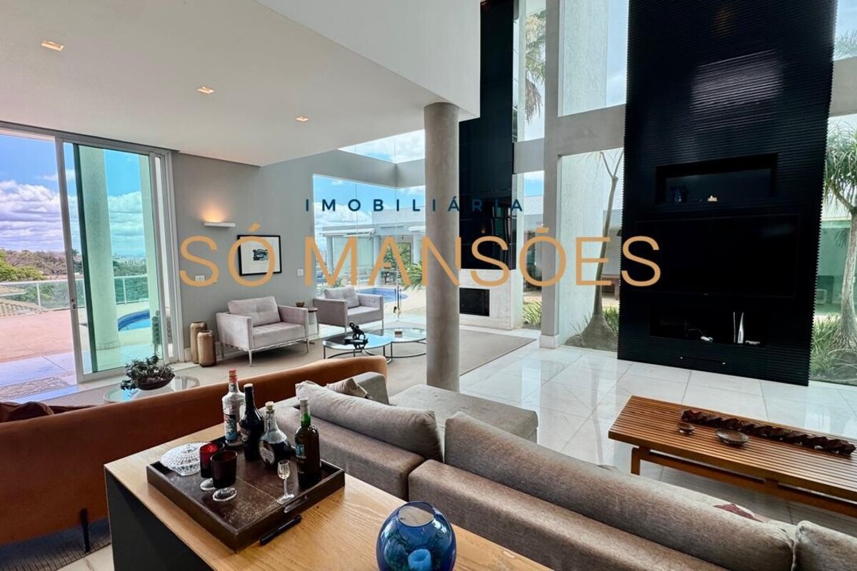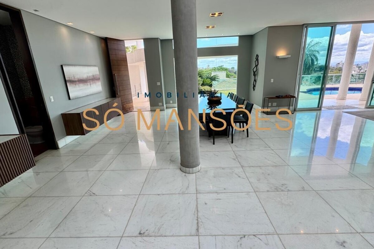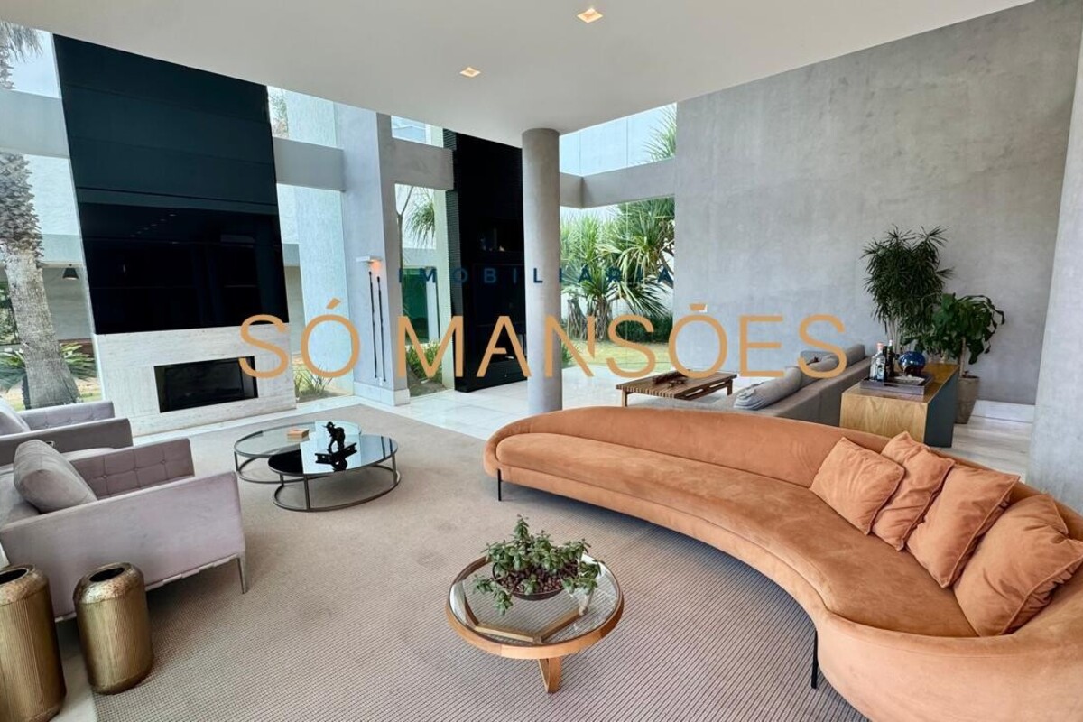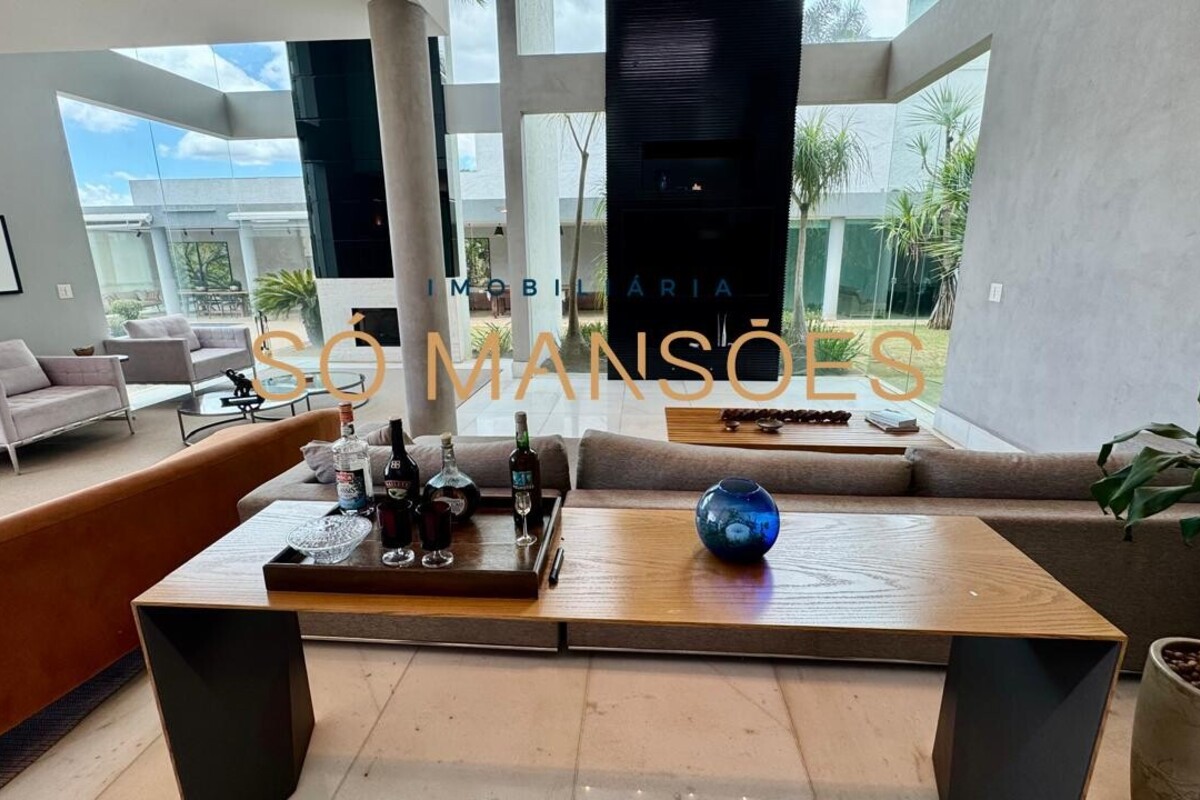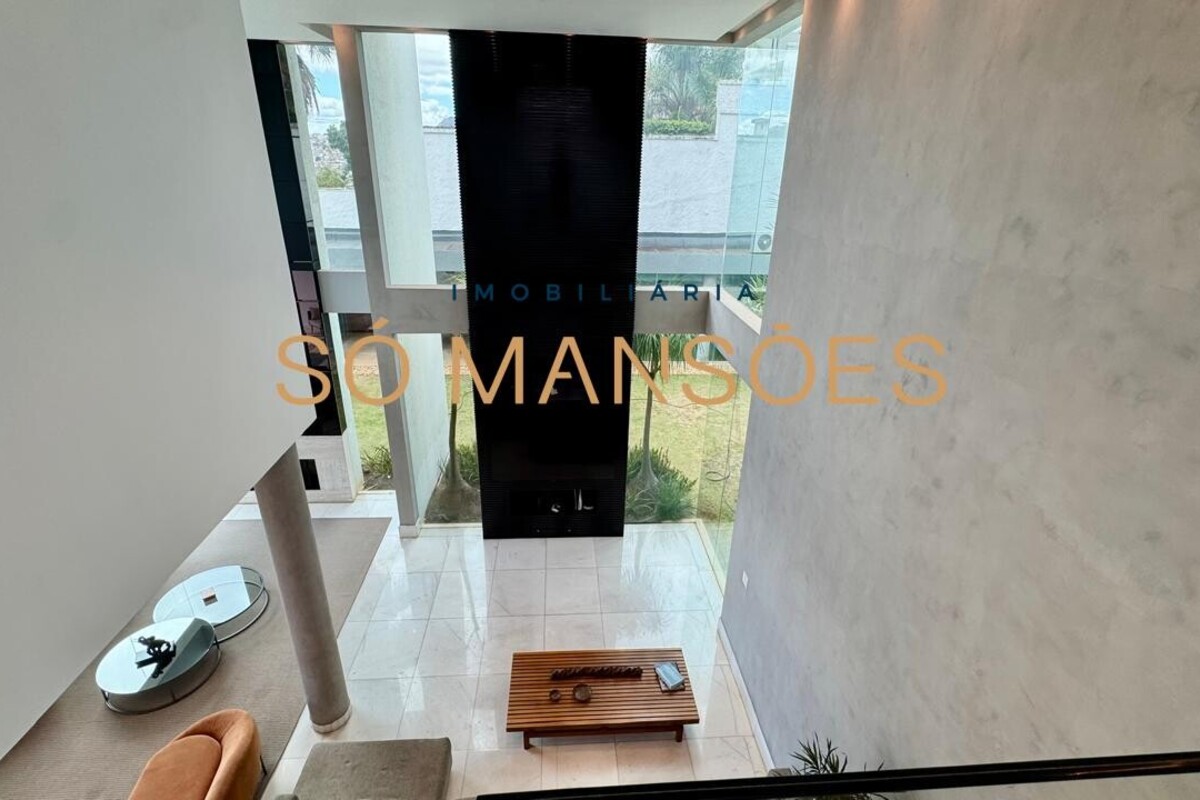 A área social conta com salas amplas e integradas, com pé-direito duplo, piso em mármore e lareira. Grandes aberturas favorecem a entrada de luz natural, enquanto a iluminação planejada valoriza os detalhes do projeto. O lavabo mantém o mesmo padrão de acabamento, com mármore e portas em madeira maciça.