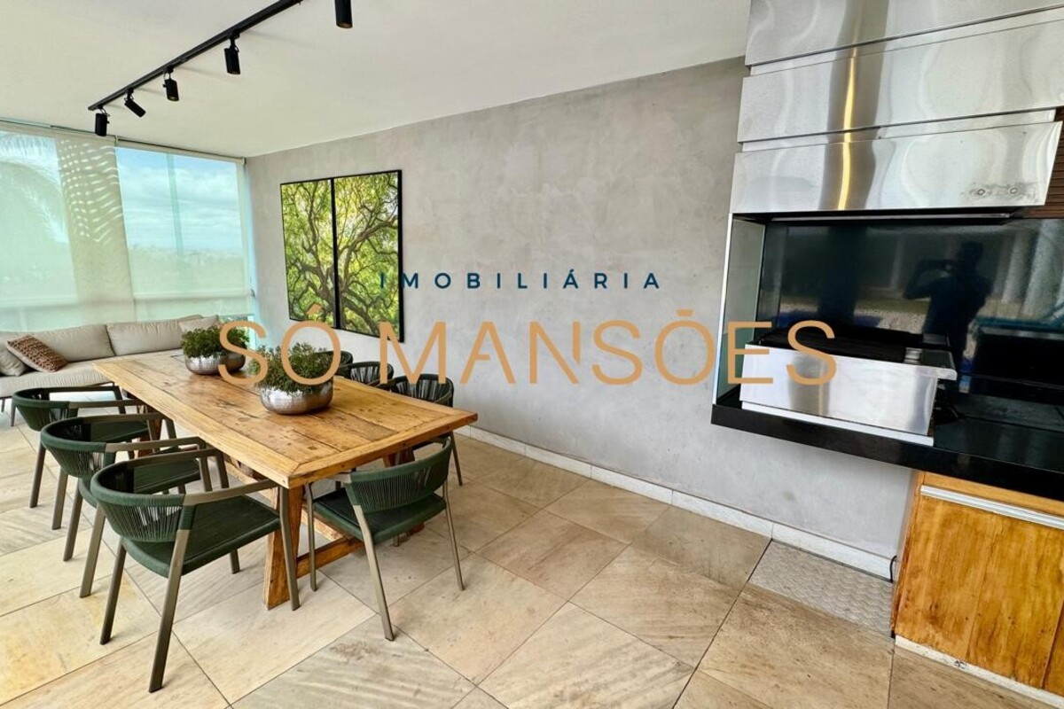 A área externa é um dos destaques, com piscina com raia e aquecimento solar, ideal para momentos de lazer em qualquer época do ano. O espaço gourmet é completo, com churrasqueira, bancada em granito e armário refrigerado. O ambiente é integrado a uma sala de TV, academia e um jardim com árvores maduras, que contribuem para uma atmosfera tranquila e agradável.