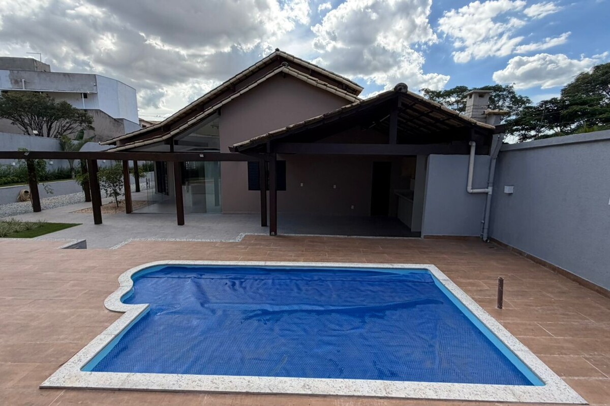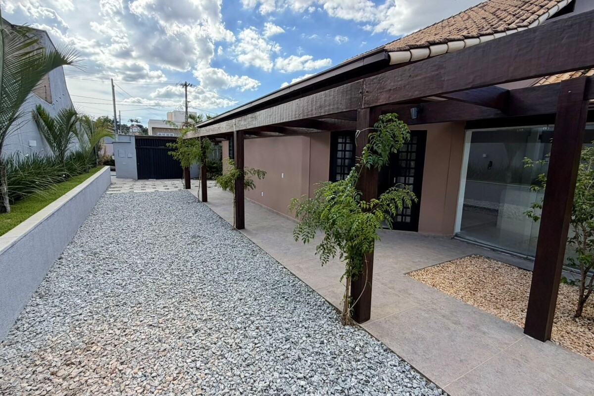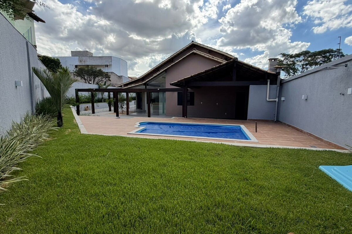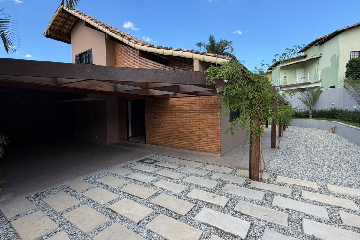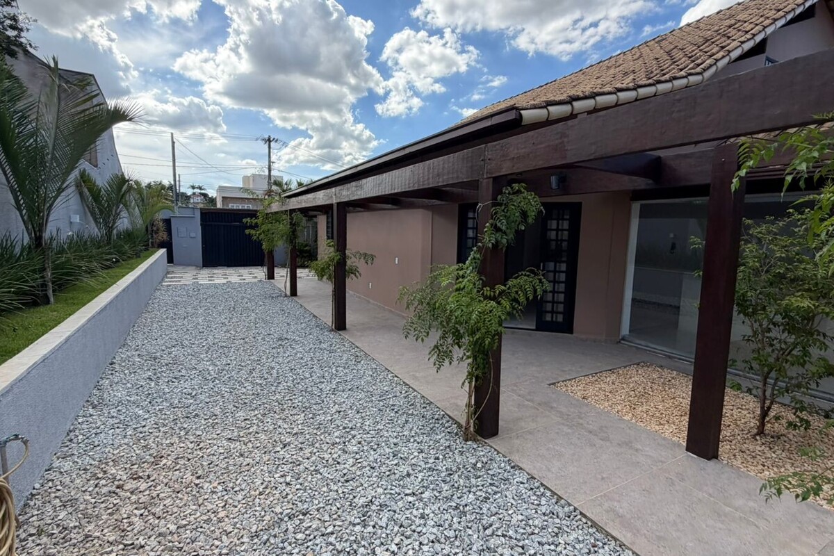 A casa possui também lavabo, garagem com capacidade para mais de cinco veículos e sistema de energia solar fotovoltaica, agregando eficiência energética e redução de custos.
