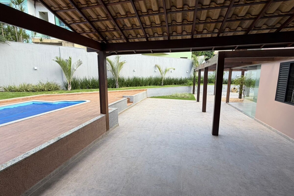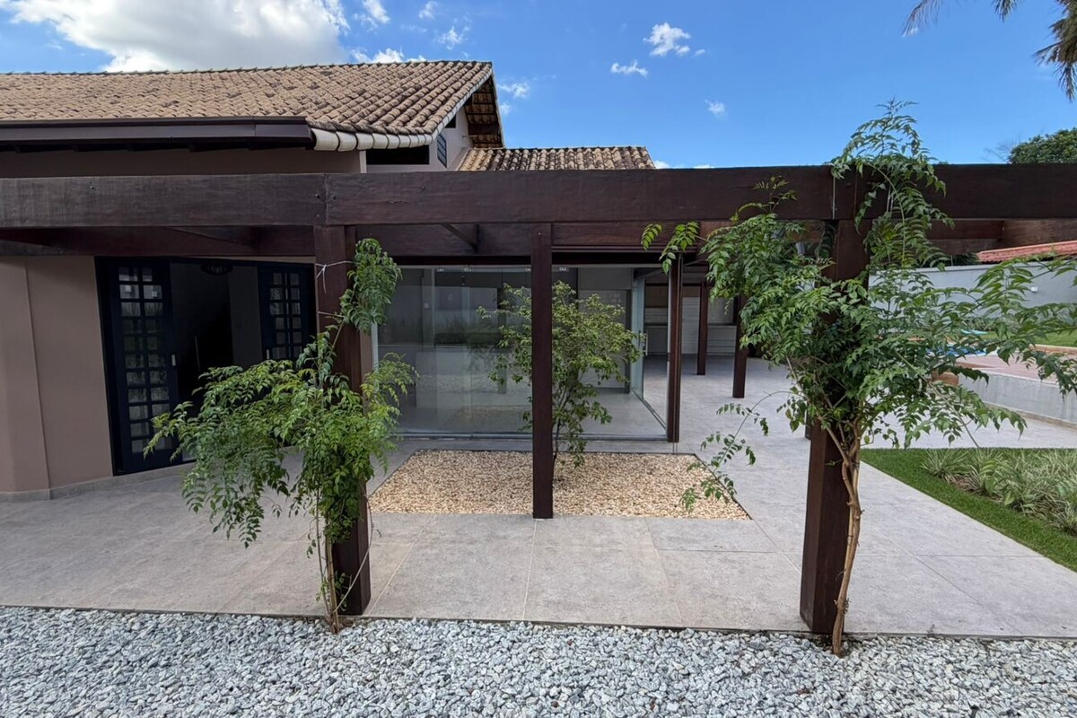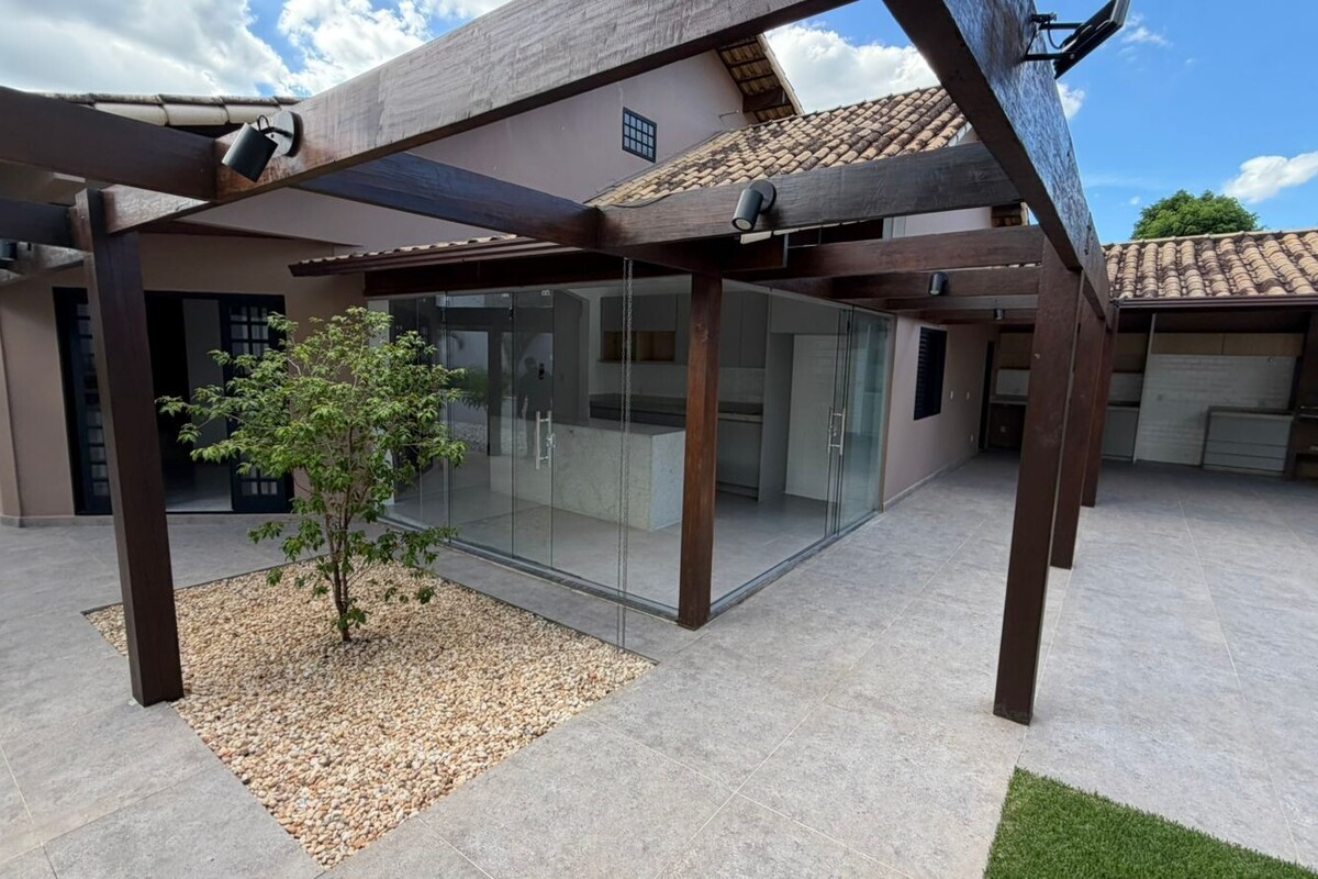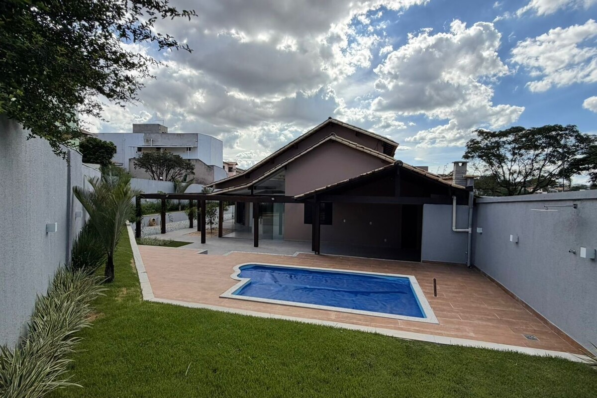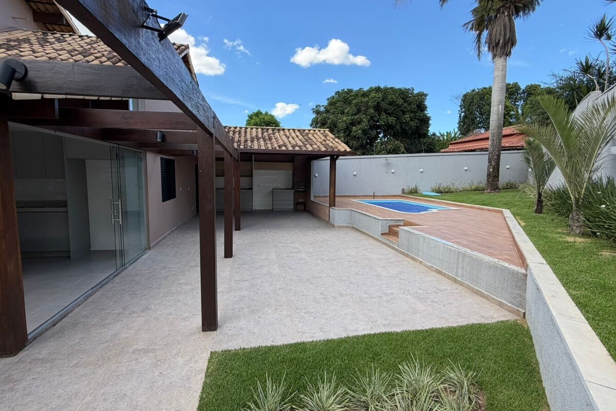 A casa possui também lavabo, garagem com capacidade para mais de cinco veículos e sistema de energia solar fotovoltaica, agregando eficiência energética e redução de custos.