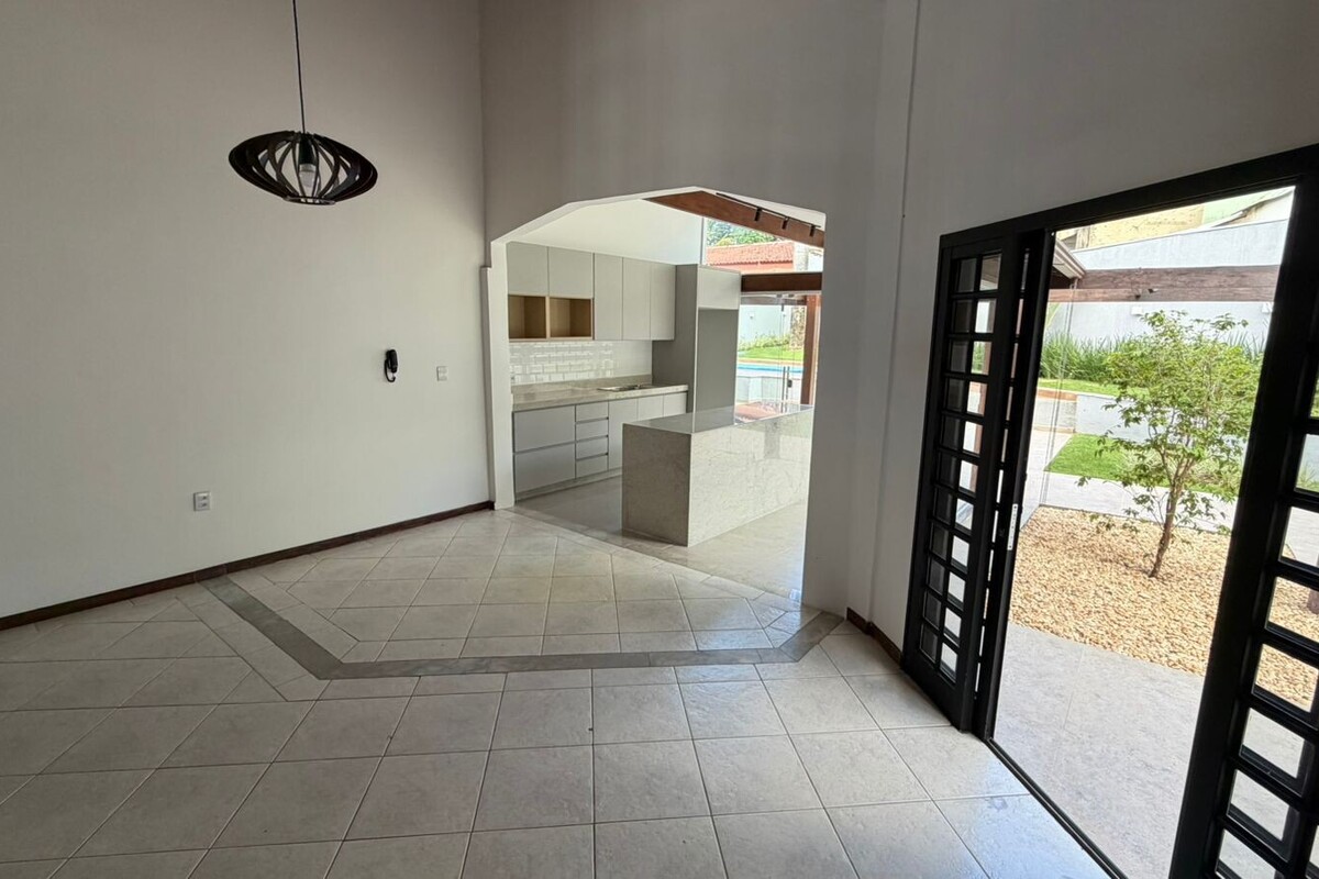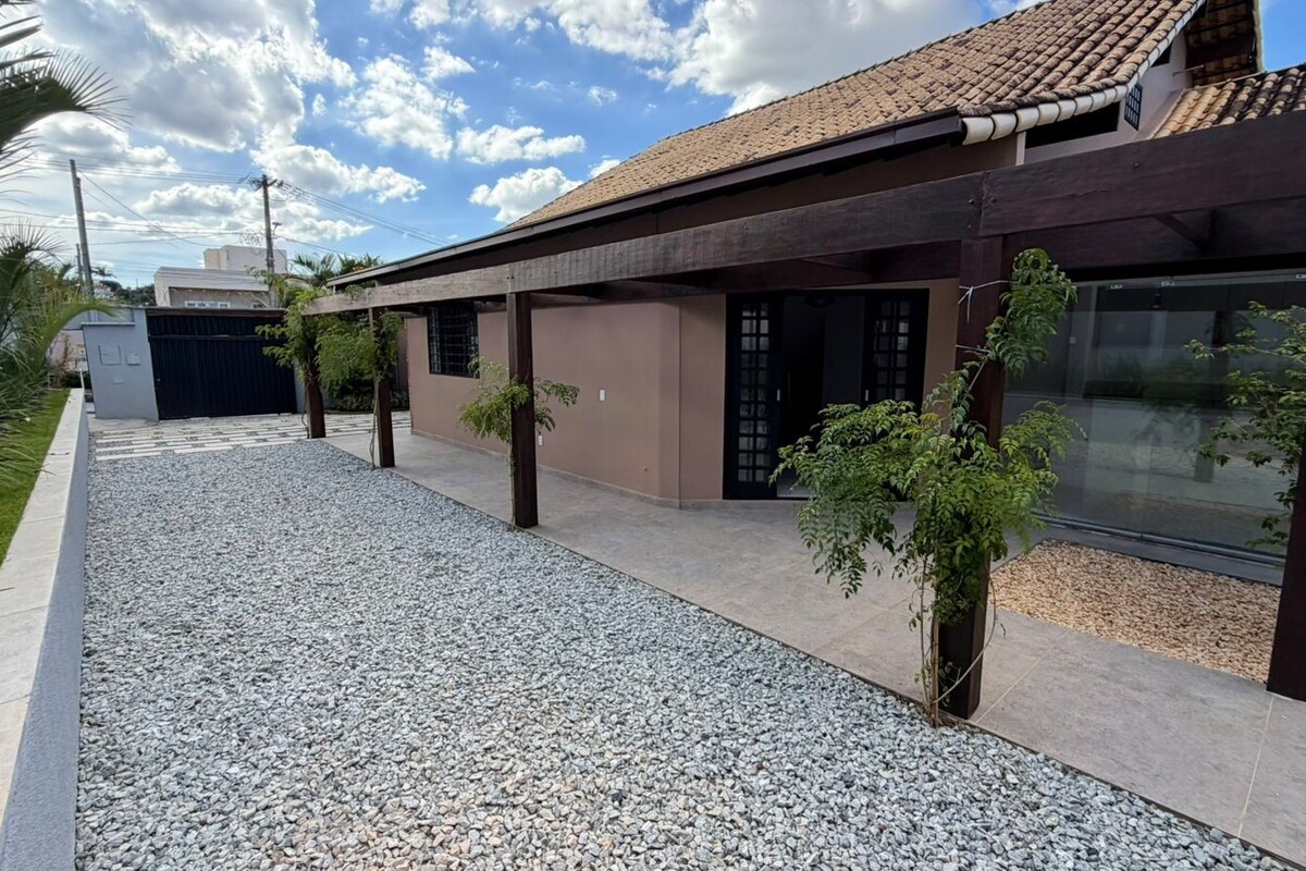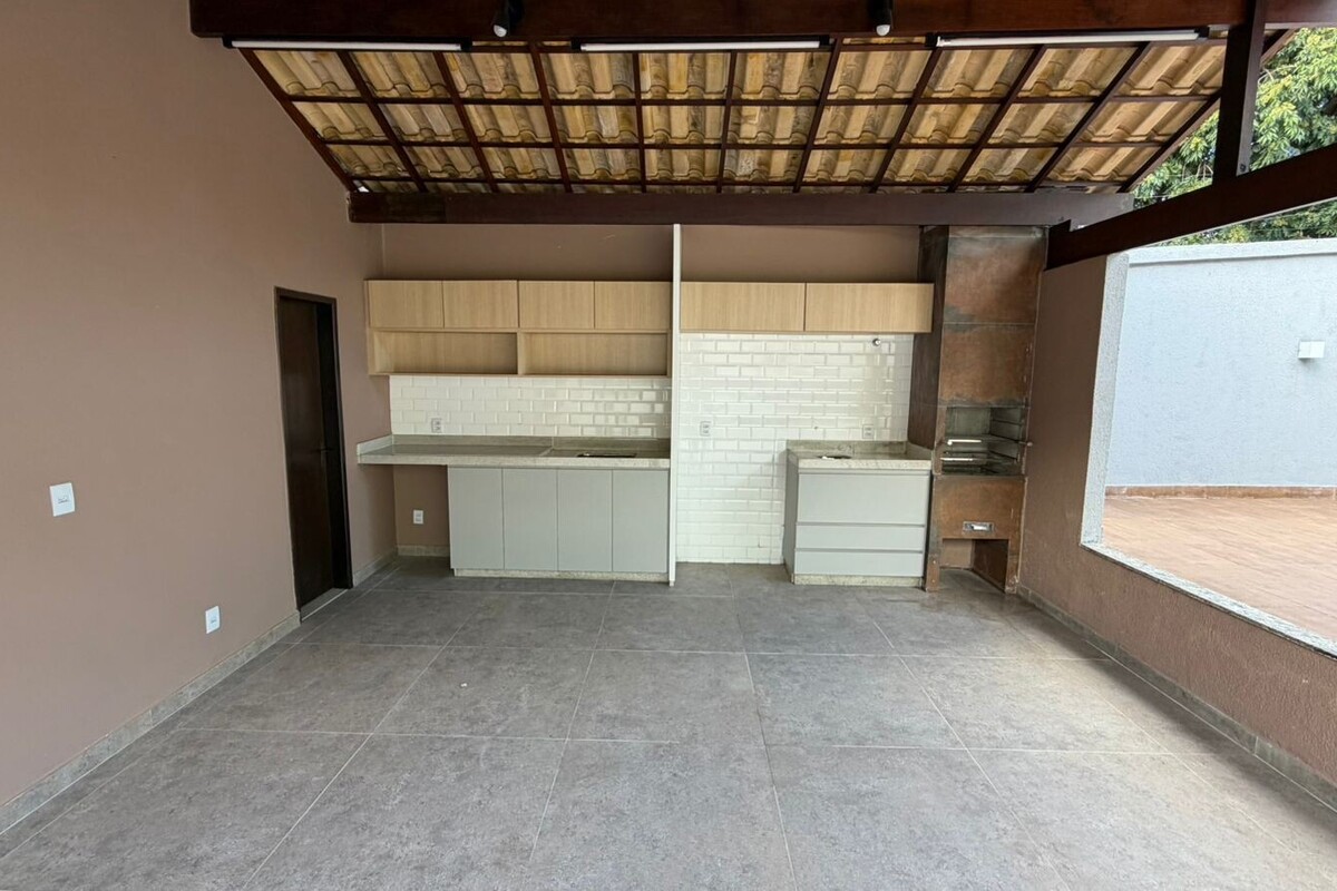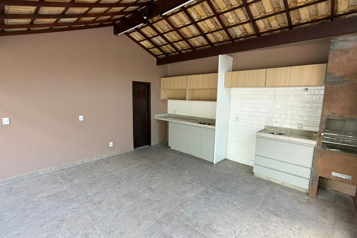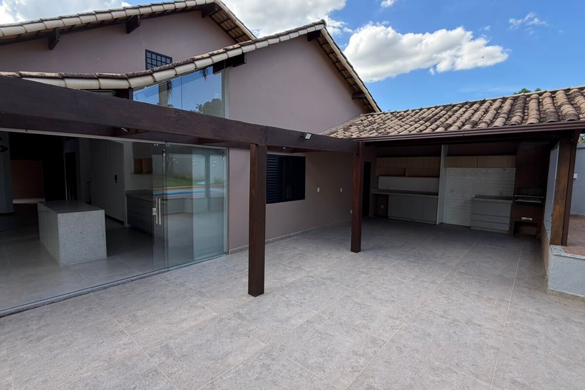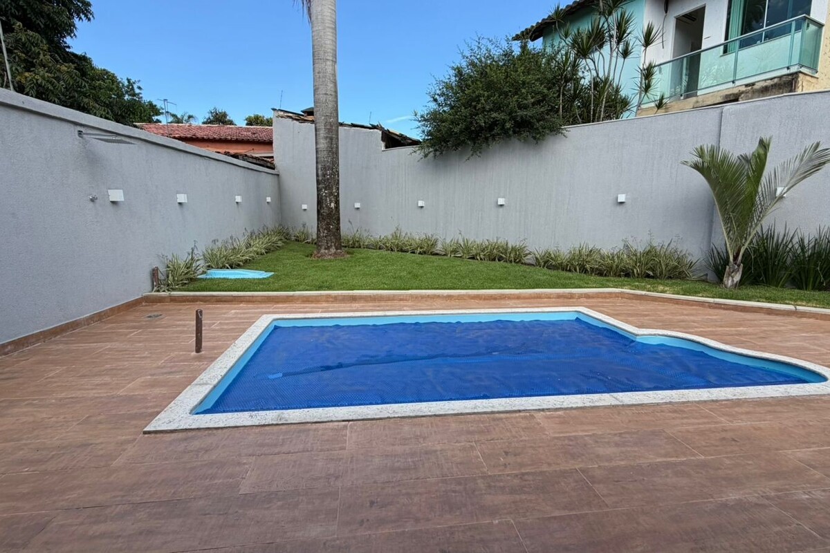 A casa possui também lavabo, garagem com capacidade para mais de cinco veículos e sistema de energia solar fotovoltaica, agregando eficiência energética e redução de custos.