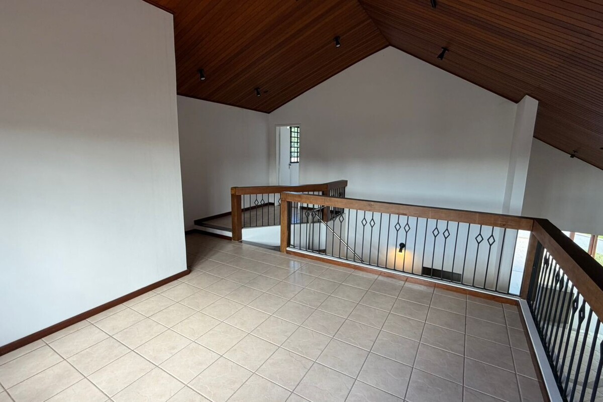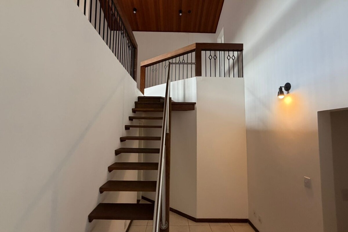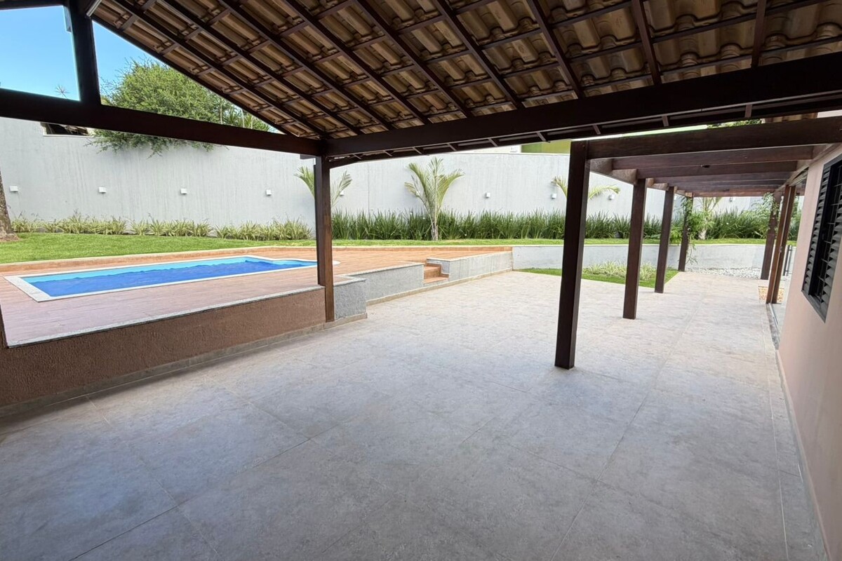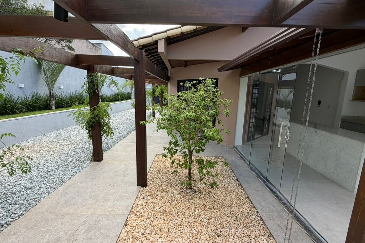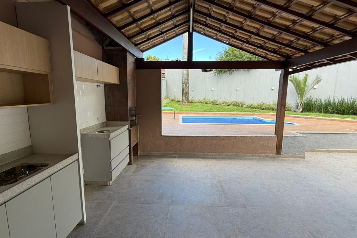 A casa possui também lavabo, garagem com capacidade para mais de cinco veículos e sistema de energia solar fotovoltaica, agregando eficiência energética e redução de custos.