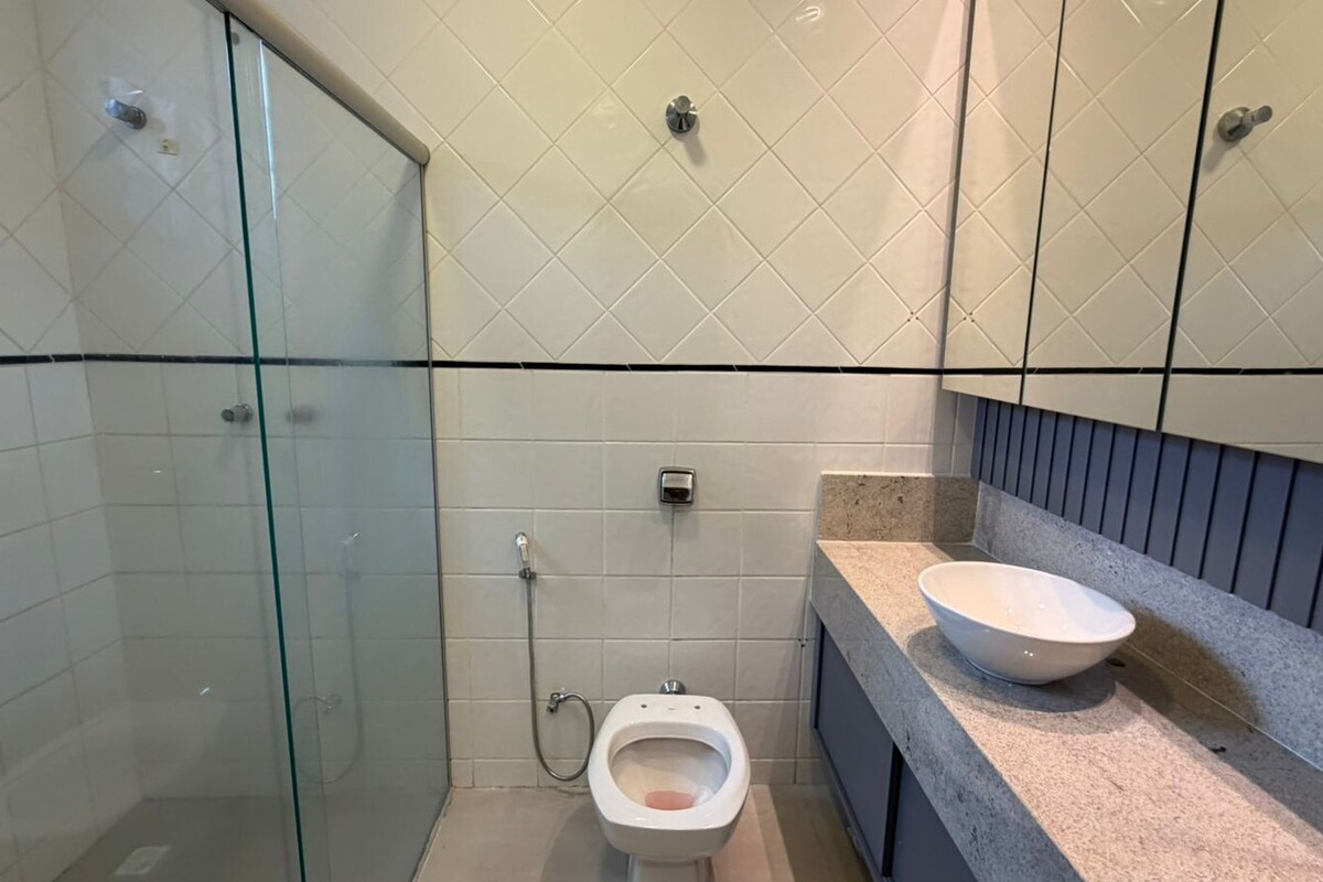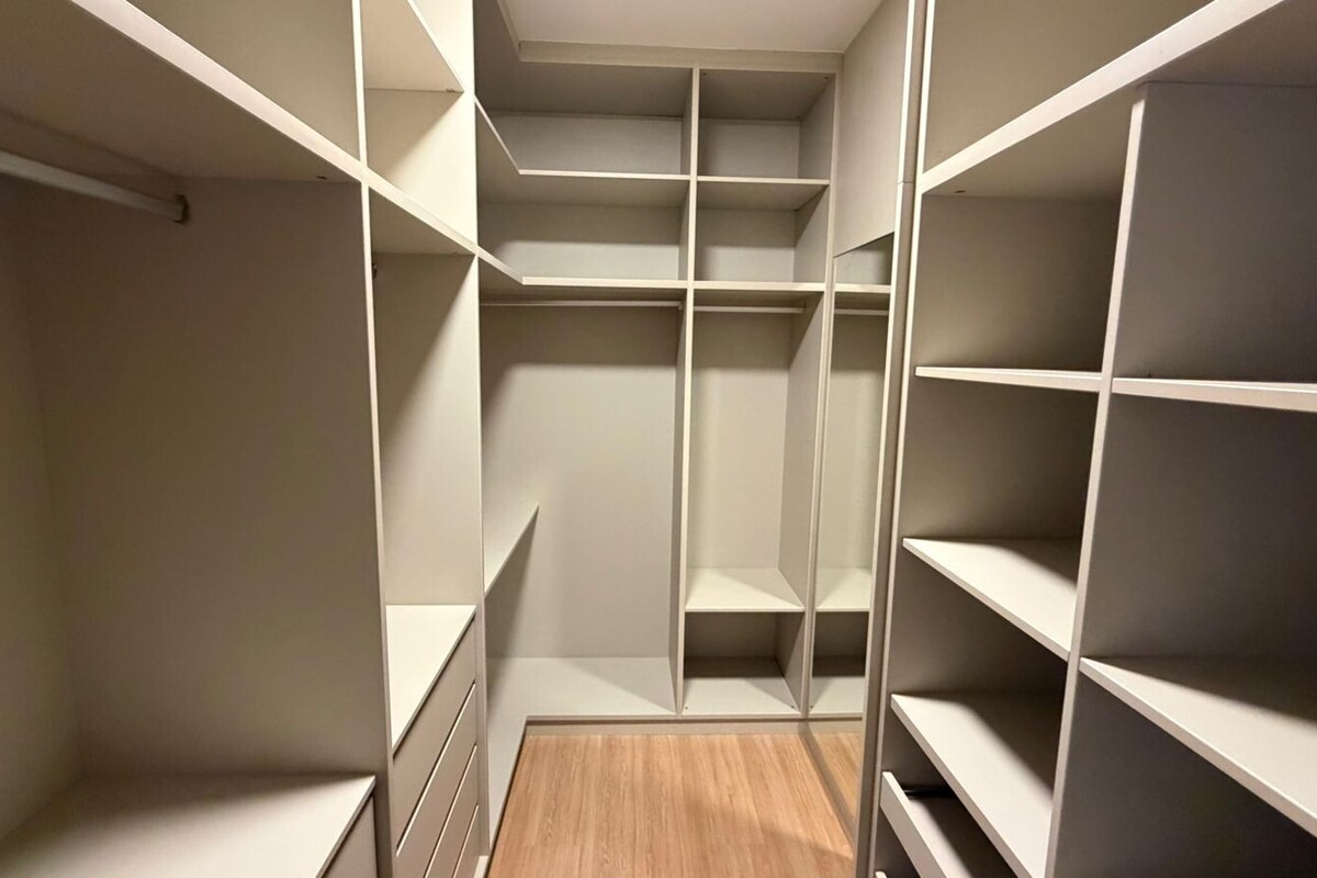 A área íntima conta com três suítes amplas, todas com marcenaria planejada. A suíte principal se destaca pelo closet generoso e pelos acabamentos que proporcionam conforto e privacidade. O imóvel dispõe ainda de um escritório reservado, ideal para quem busca um ambiente tranquilo para trabalho ou estudos, além de dependência completa que atende às necessidades da rotina da casa.