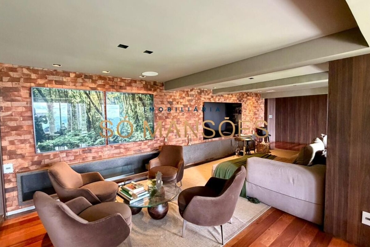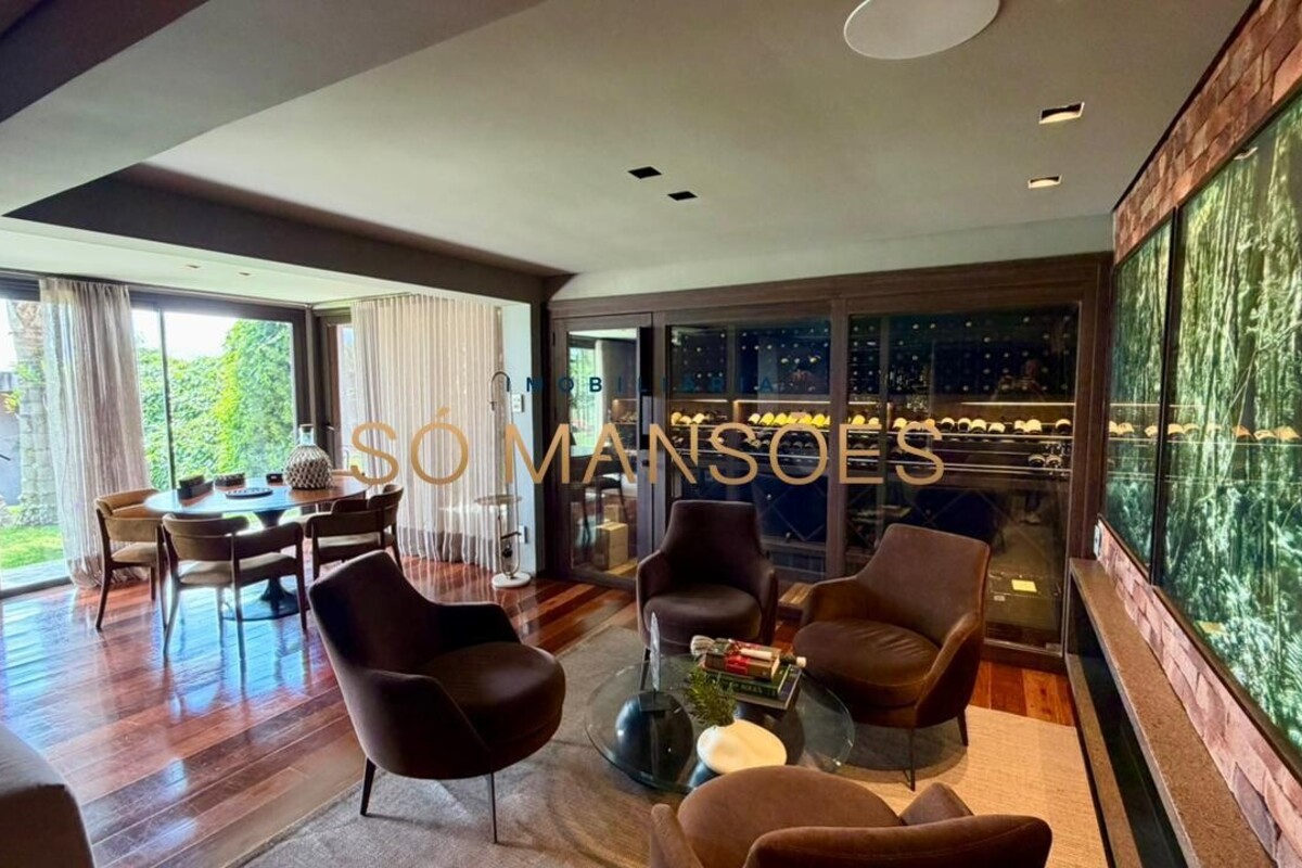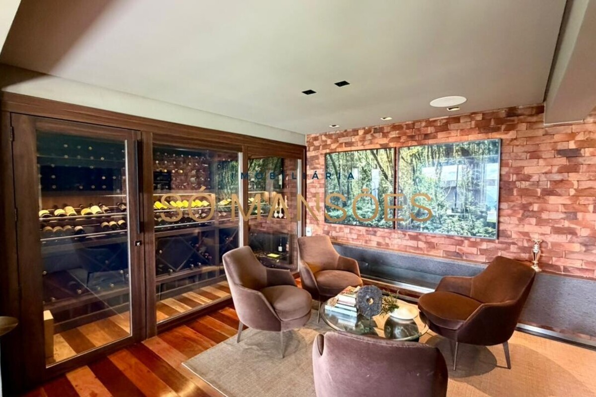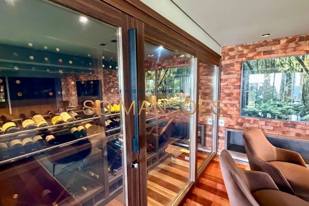 No pavimento inferior, a área social oferece uma ampla sala para quatro ambientes, com lareira e adega, criando um espaço acolhedor e ideal para receber. A cozinha é funcional, com despensa, e se integra à varanda gourmet, além de contar com lavabo de apoio.