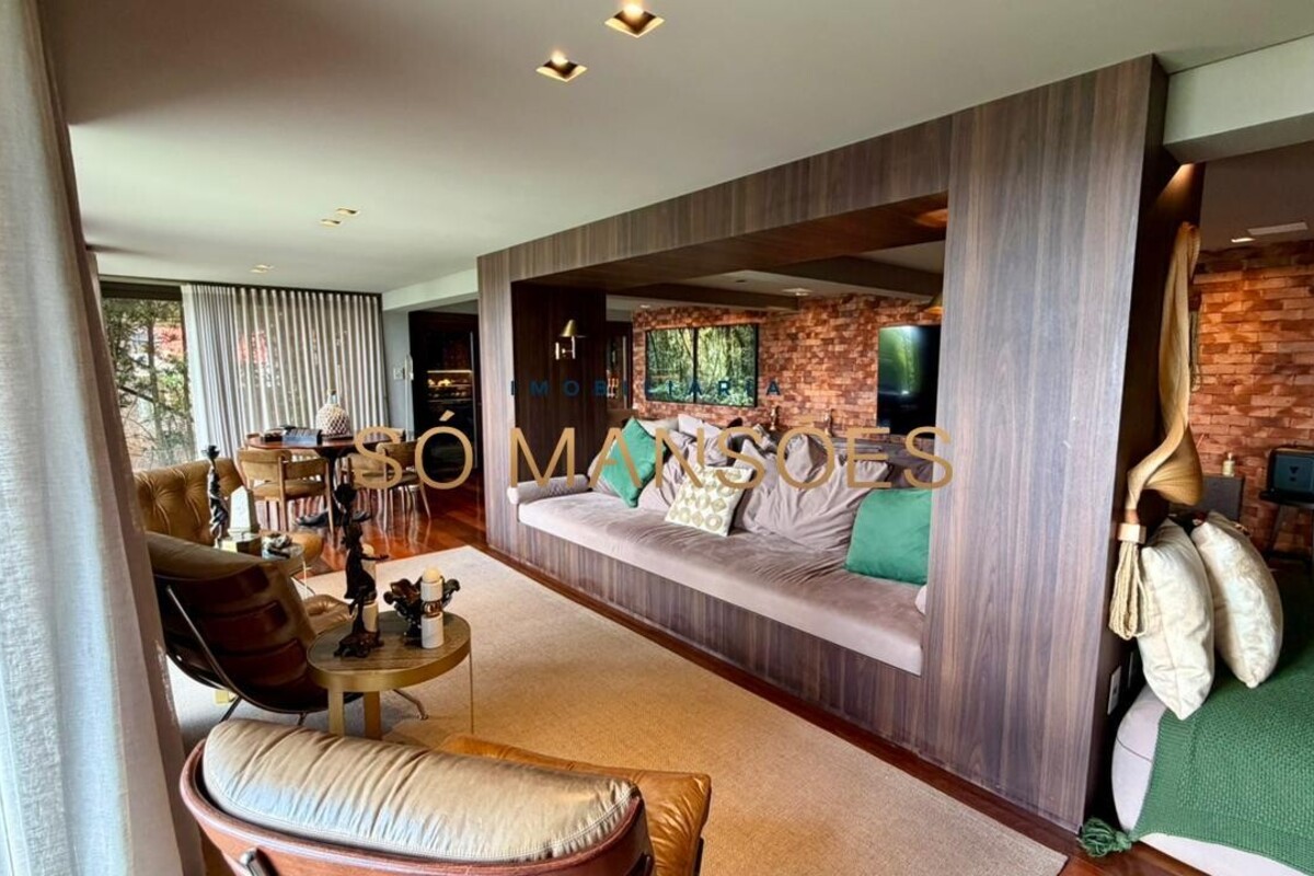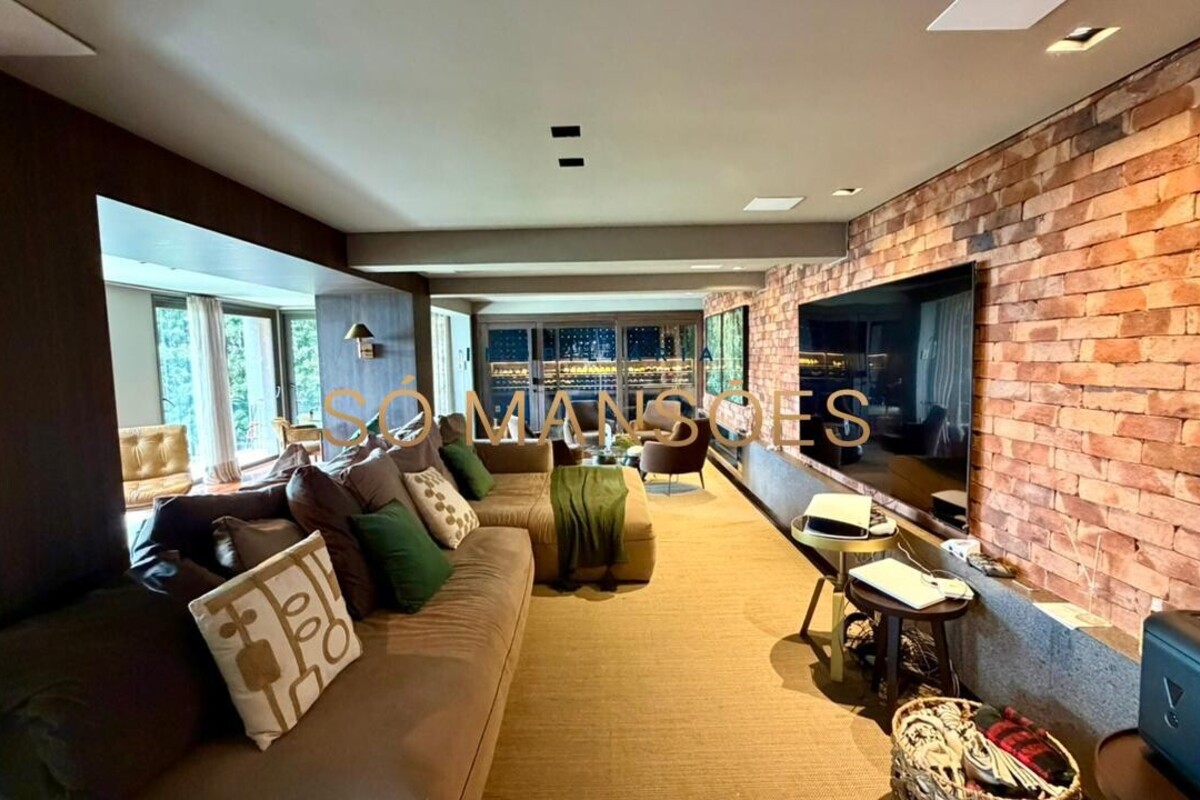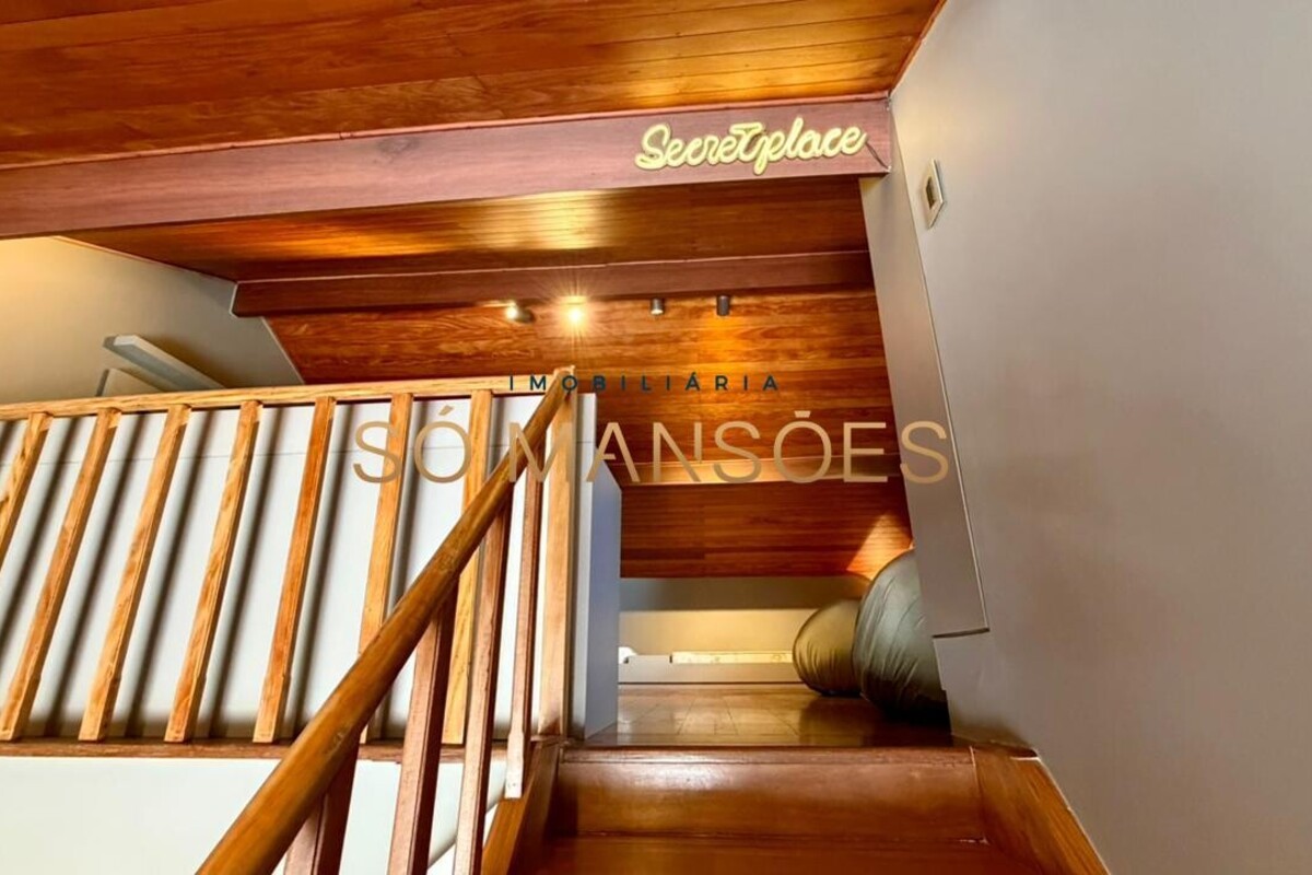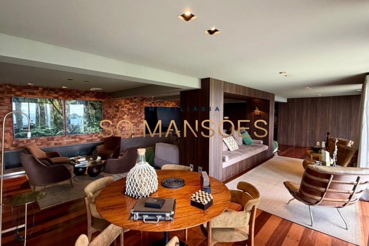 No pavimento inferior, a área social oferece uma ampla sala para quatro ambientes, com lareira e adega, criando um espaço acolhedor e ideal para receber. A cozinha é funcional, com despensa, e se integra à varanda gourmet, além de contar com lavabo de apoio.