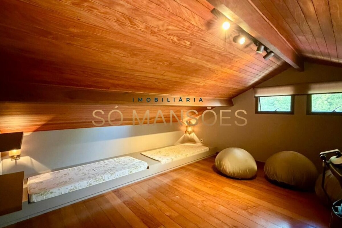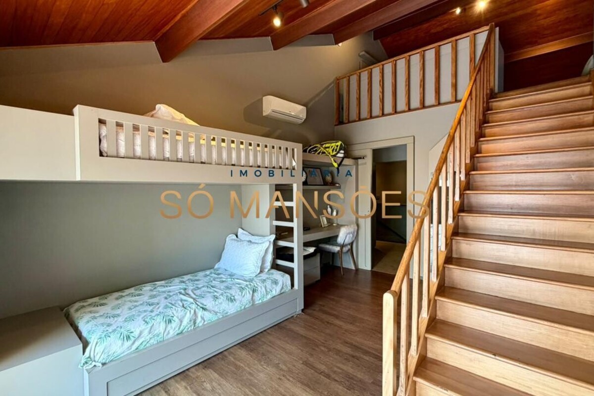 Construída em dois pavimentos, a casa possui no primeiro nível a área íntima, composta por quatro suítes, sendo três com closet e varanda. O pavimento conta ainda com rouparia e copa de apoio, garantindo maior comodidade para a rotina dos moradores.