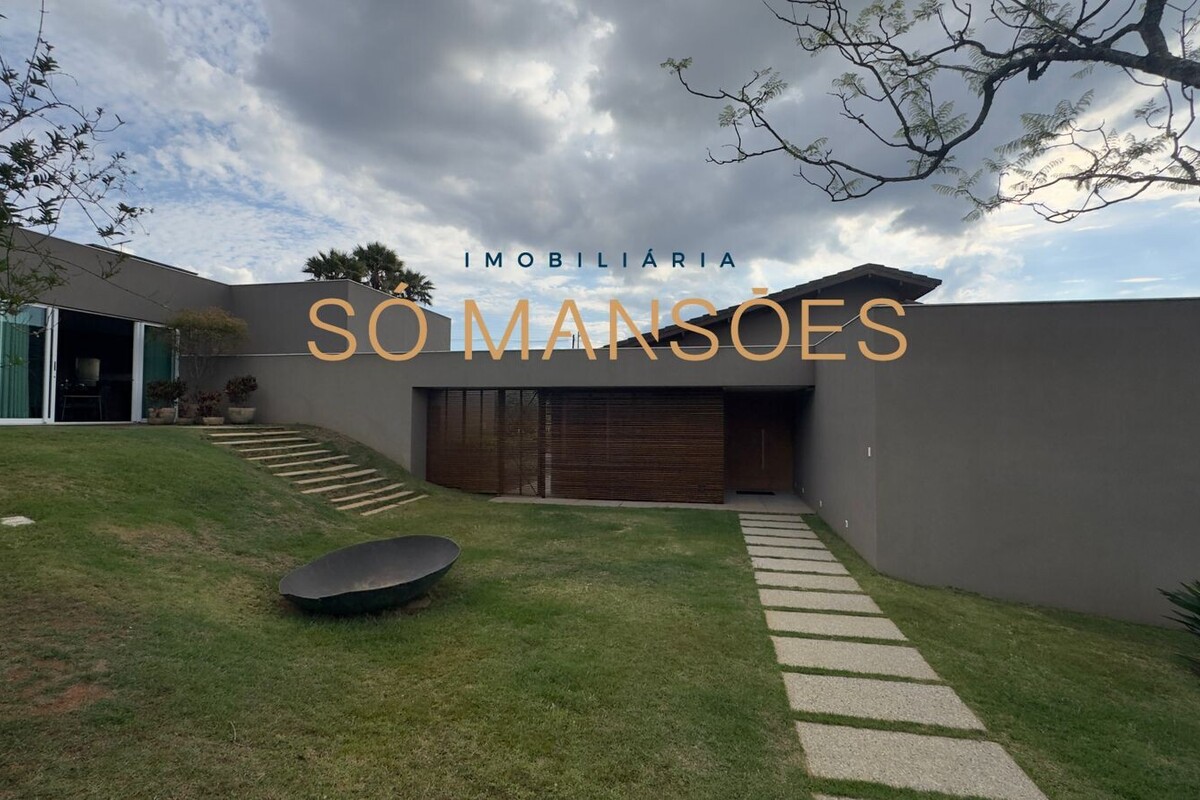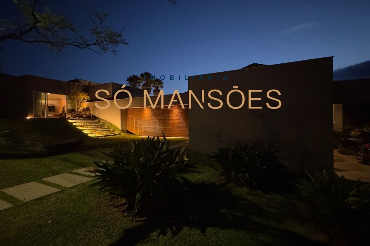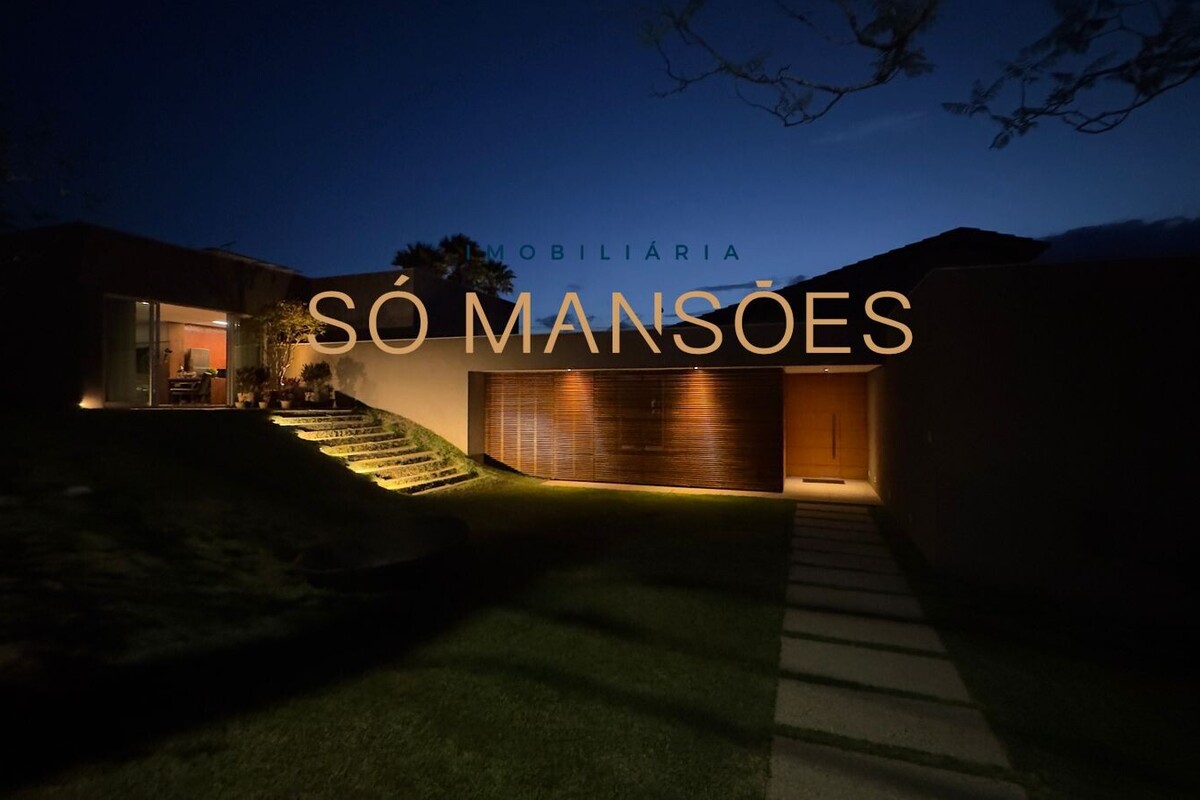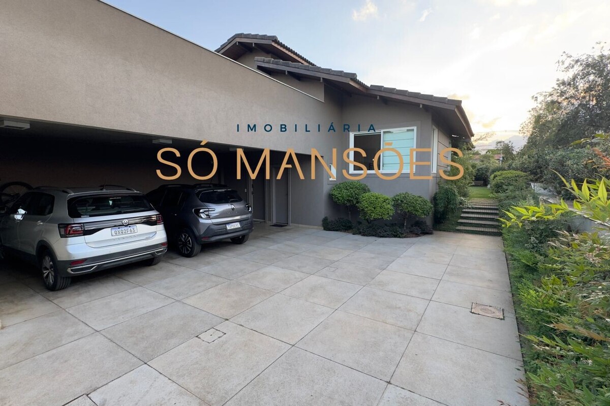 A fachada apresenta linhas imponentes e a garagem acomoda quatro carros, sendo dois cobertos. O paisagismo e a escolha dos materiais reforçam o cuidado em cada detalhe da residência.