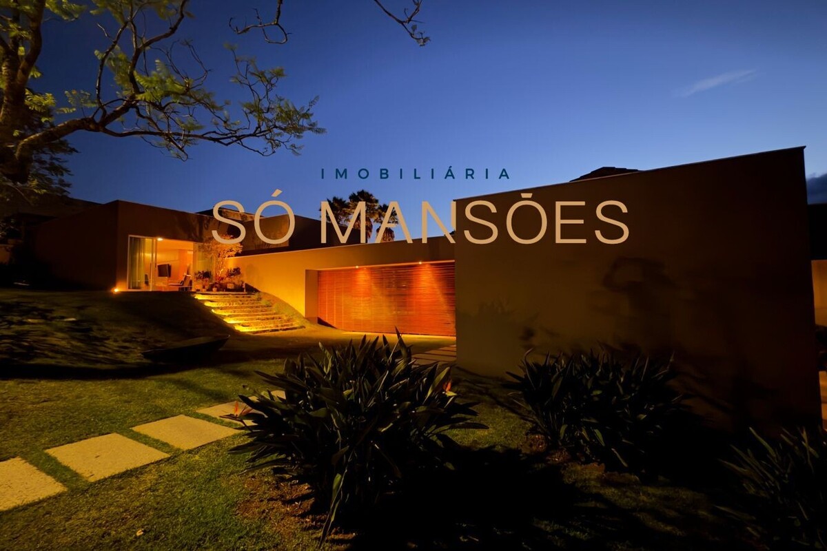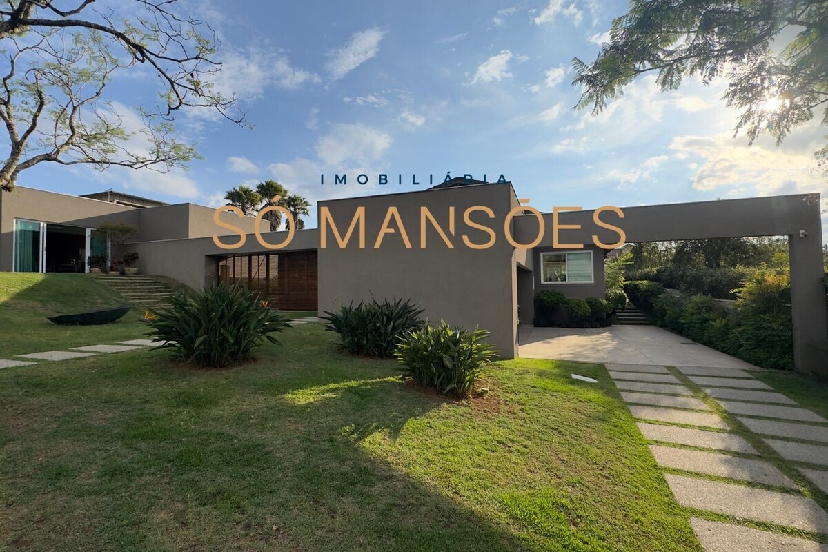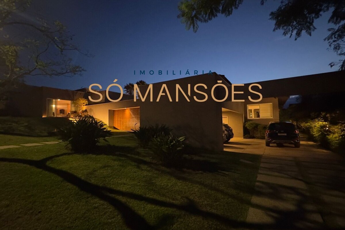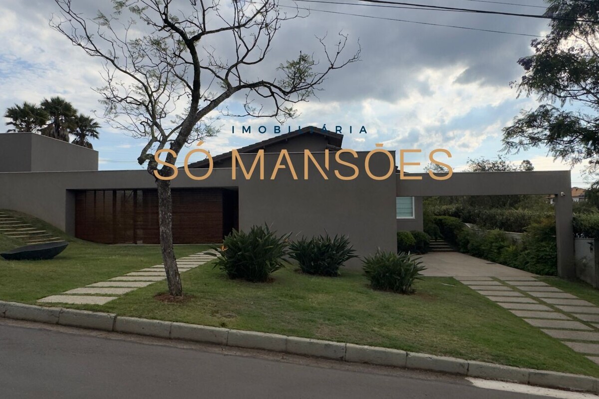 A fachada apresenta linhas imponentes e a garagem acomoda quatro carros, sendo dois cobertos. O paisagismo e a escolha dos materiais reforçam o cuidado em cada detalhe da residência.