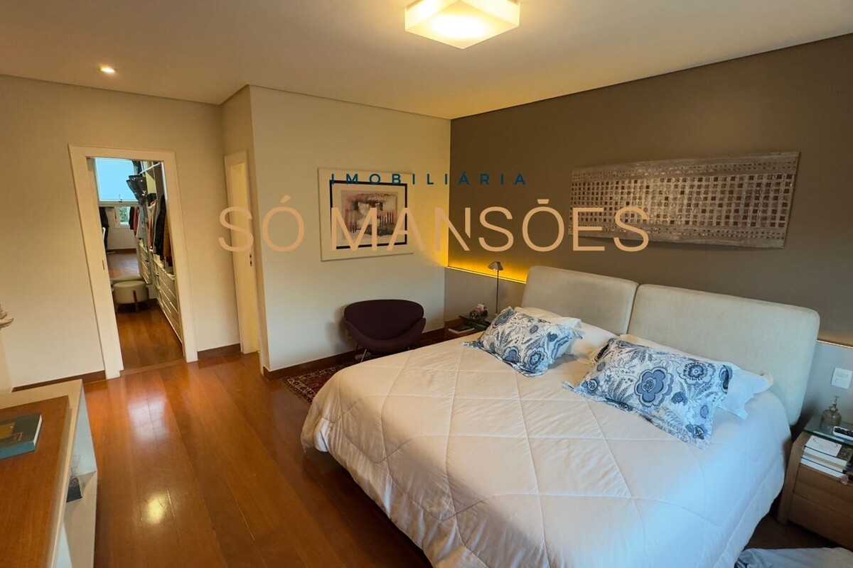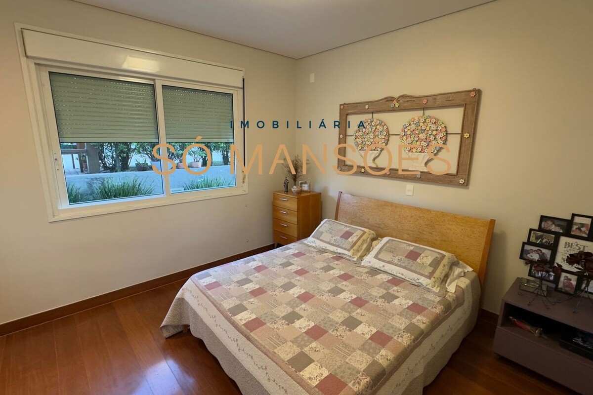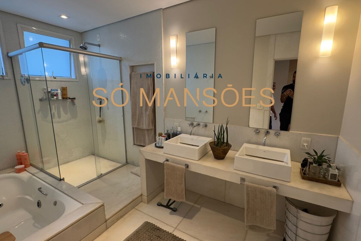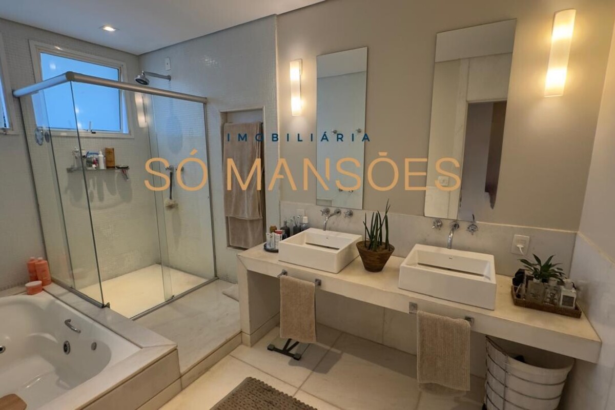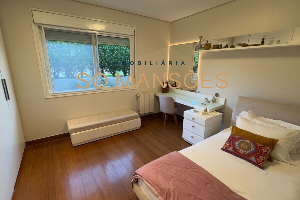 A área íntima conta com 4 suítes, todas com armários. A suíte master se destaca pela metragem generosa, banheiro em mármore com cubas duplas, banheira de hidromassagem, closet bem planejado e acesso direto ao jardim. Um espaço pensado para oferecer tranquilidade no dia a dia.