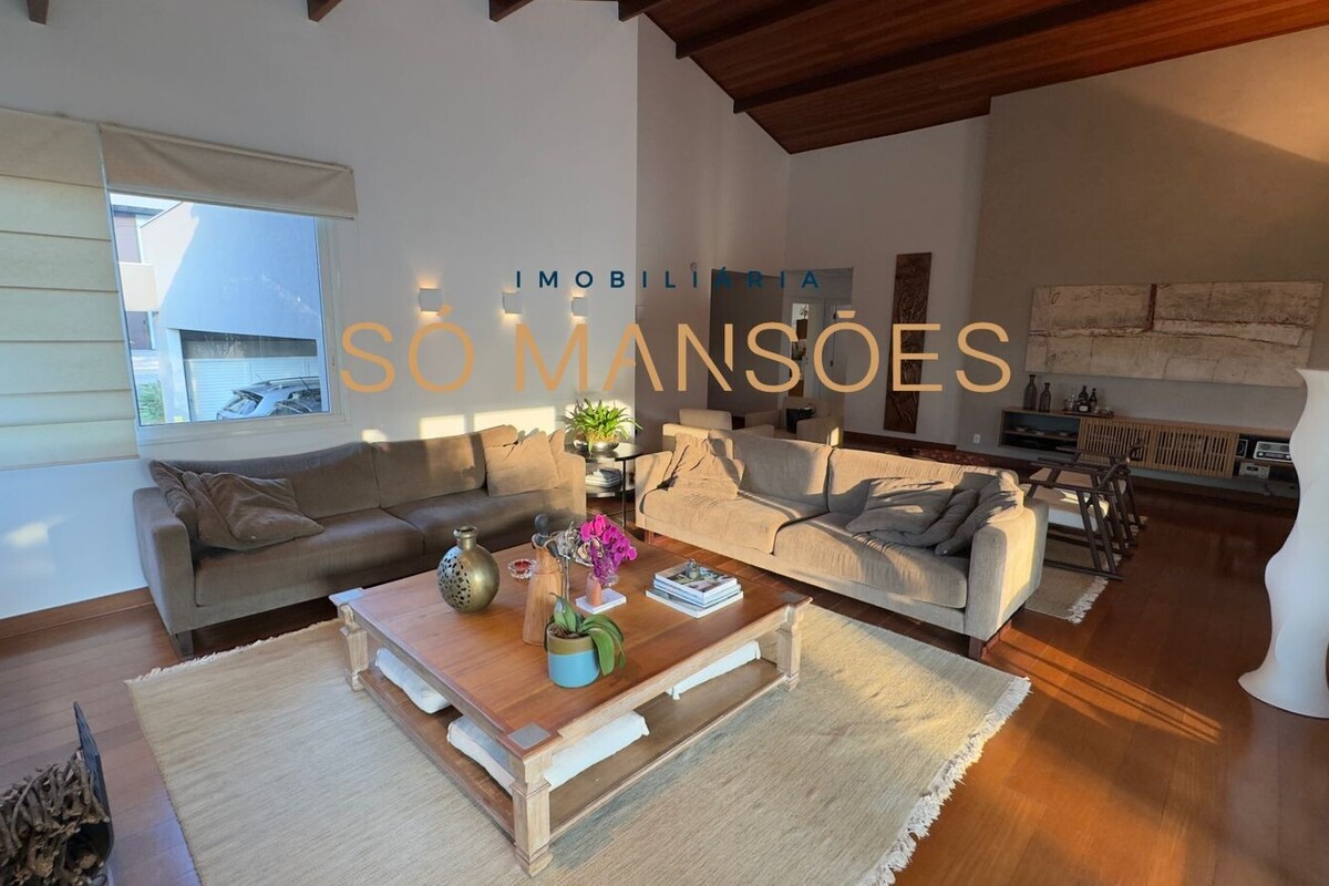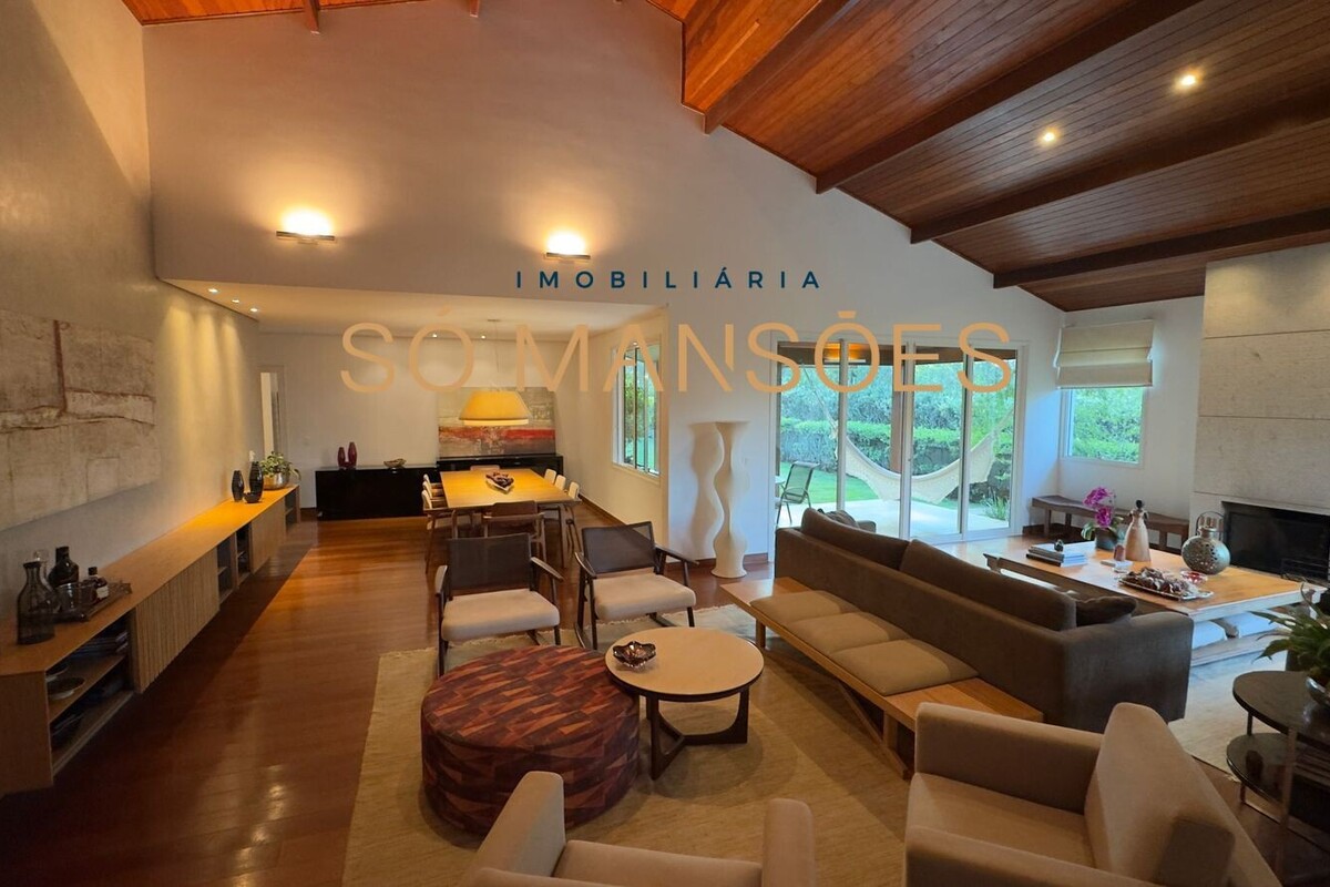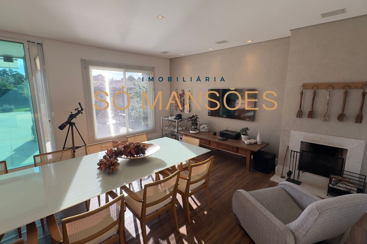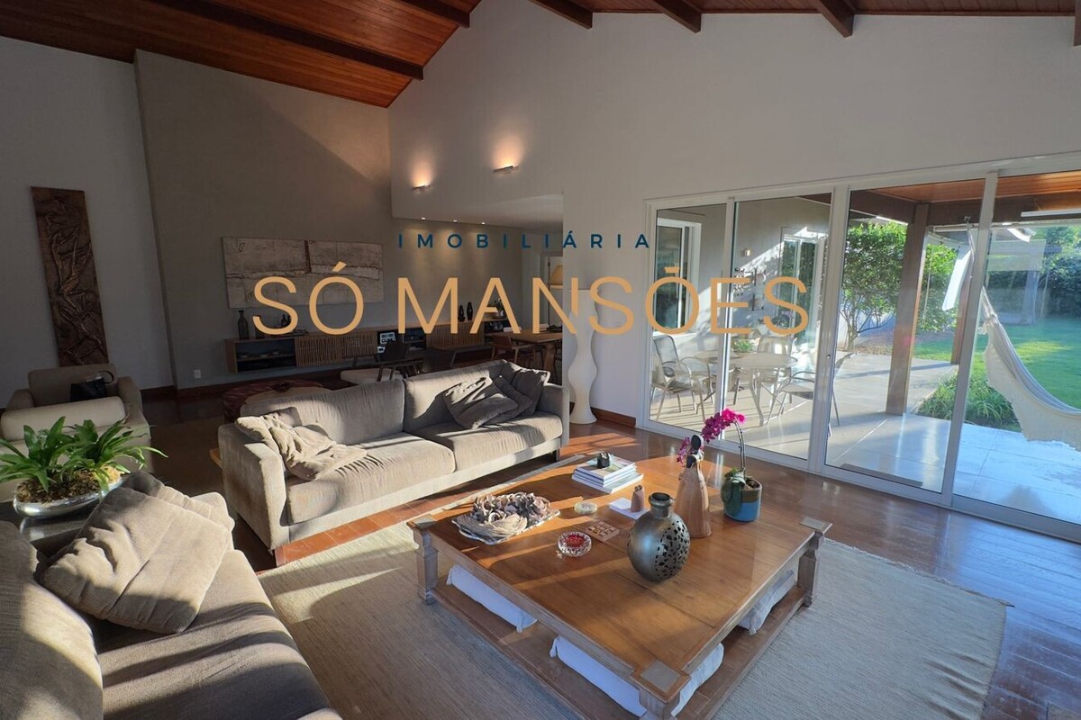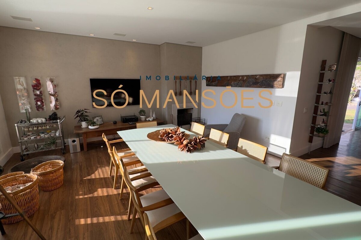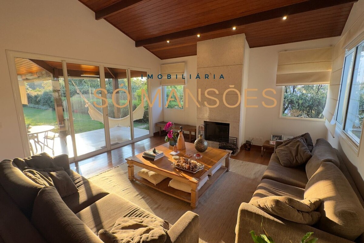 Em um lote de 2.000 m², a casa apresenta uma construção ampla, com ambientes integrados e ótima iluminação natural. O living, com pé-direito elevado, reúne sala de estar com lareira, jantar, sala de TV, escritório e varanda voltada para o verde. A sensação é de amplitude e acolhimento desde a entrada.