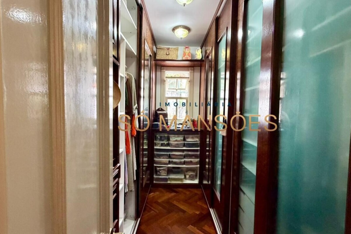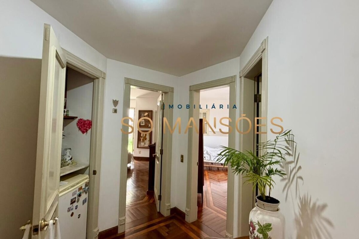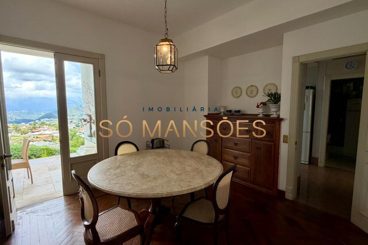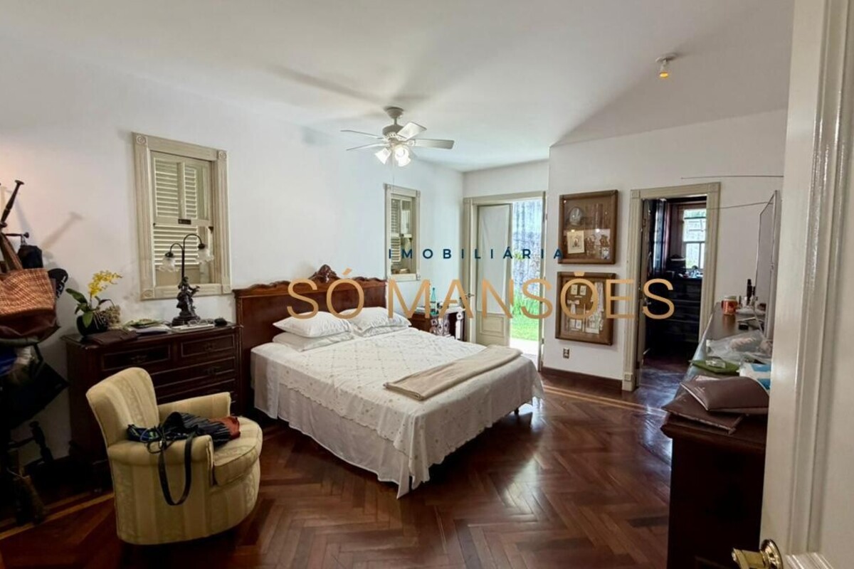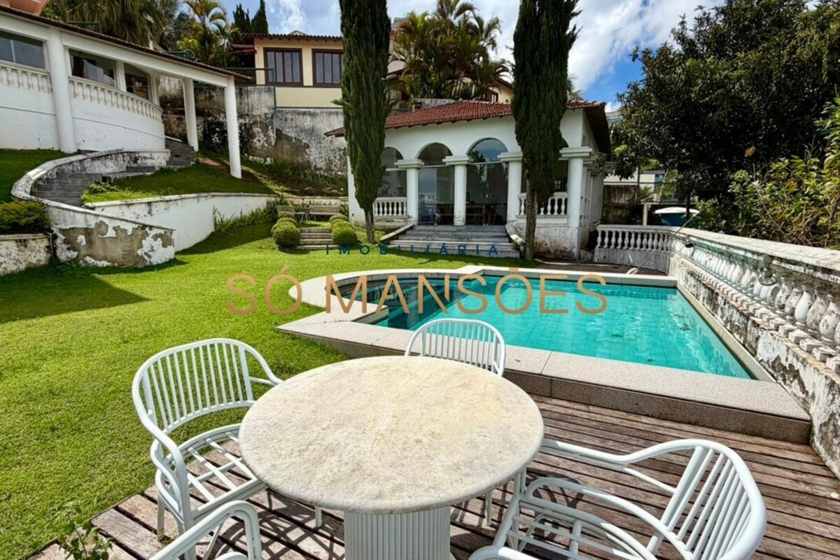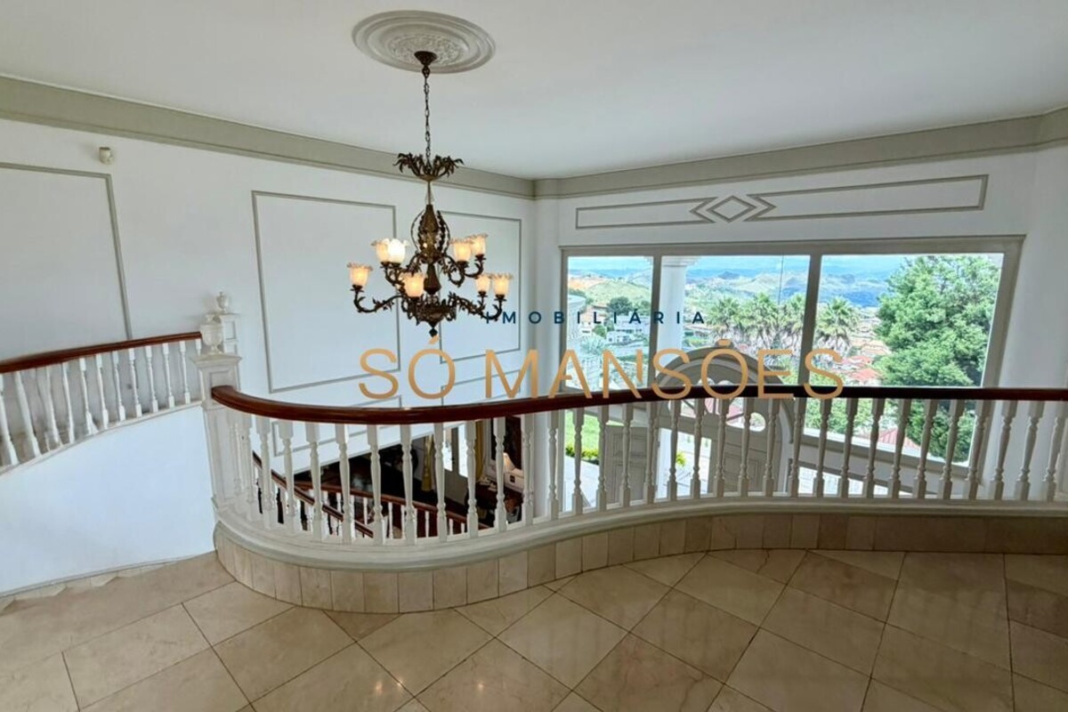 No primeiro pavimento, a casa conta com amplo hall de entrada. À direita, há um escritório com varanda, além de dois quartos com varanda e banheiro social. No lado esquerdo, o imóvel oferece estar íntimo com lareira, ponto de apoio com frigobar e pia, rouparia e três suítes, sendo duas delas com closet e banheiro com hidromassagem. Duas suítes possuem varanda e a suíte master conta com acesso direto ao jardim, que dispõe de cascata, proporcionando integração e conforto.