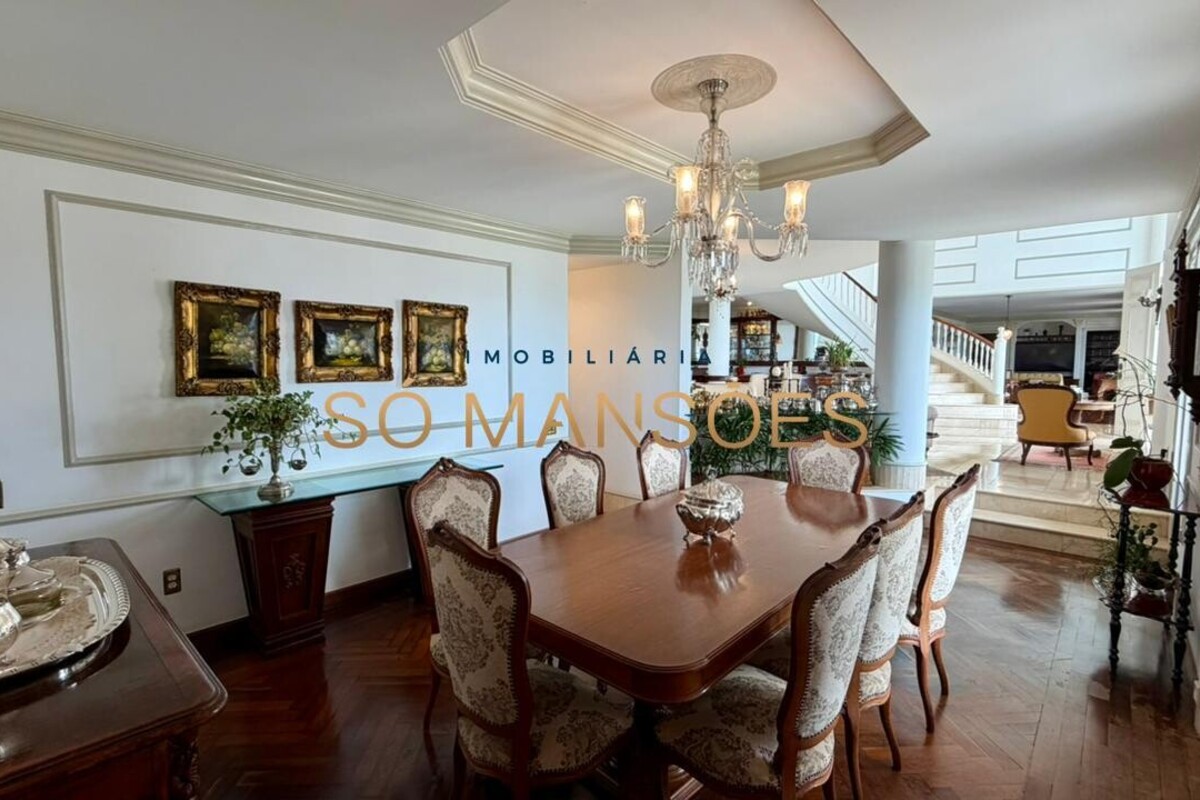 No pavimento inferior, a casa abriga ampla sala de visitas com bar, sala de jantar, lavabo, ampla sala de TV e videoteca. Antes do acesso à cozinha, há uma copa, que se conecta à cozinha com despensa, área de serviço, dependência completa de empregados, dois depósitos e acesso à garagem com capacidade para cinco veículos.