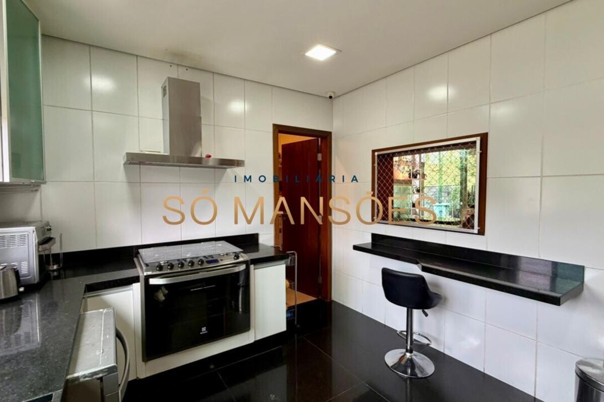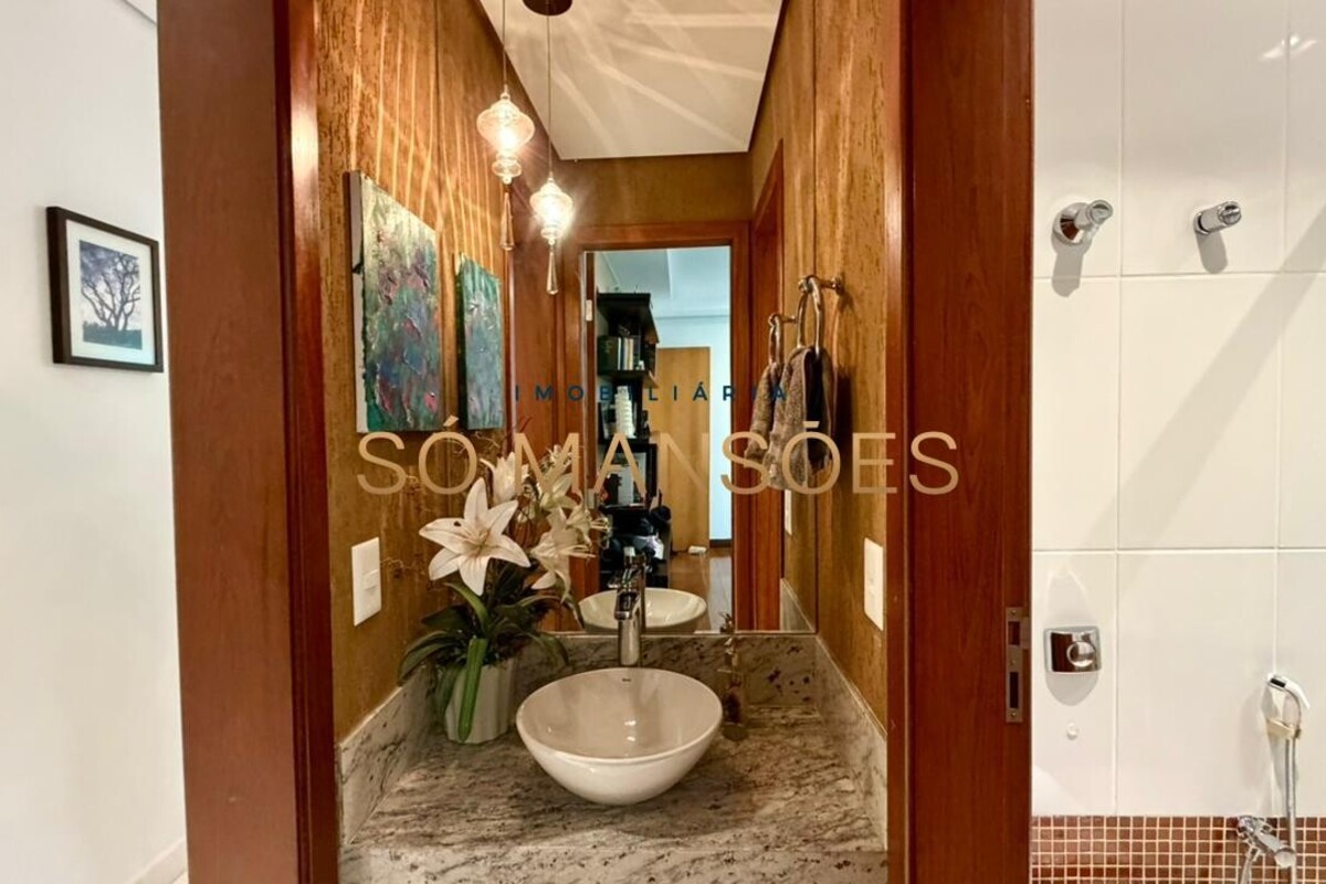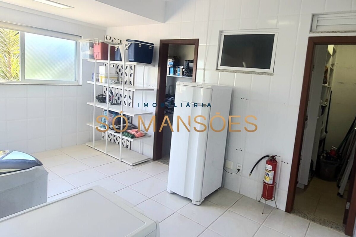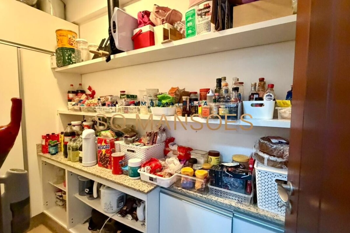 A garagem comporta quatro veículos, sendo duas vagas cobertas e duas descobertas. A área de serviço é ampla e funcional, contando com lavanderia, dois quartos de despejo e dependência completa de empregada.