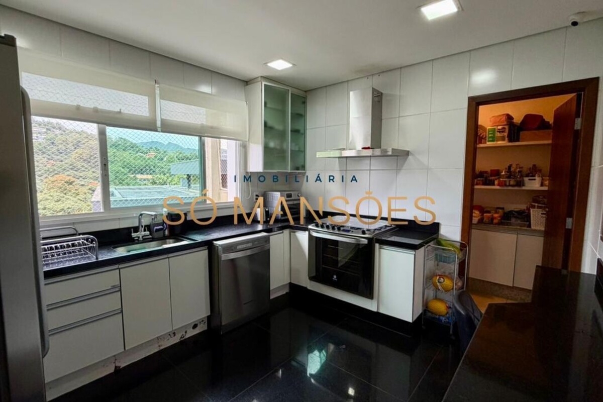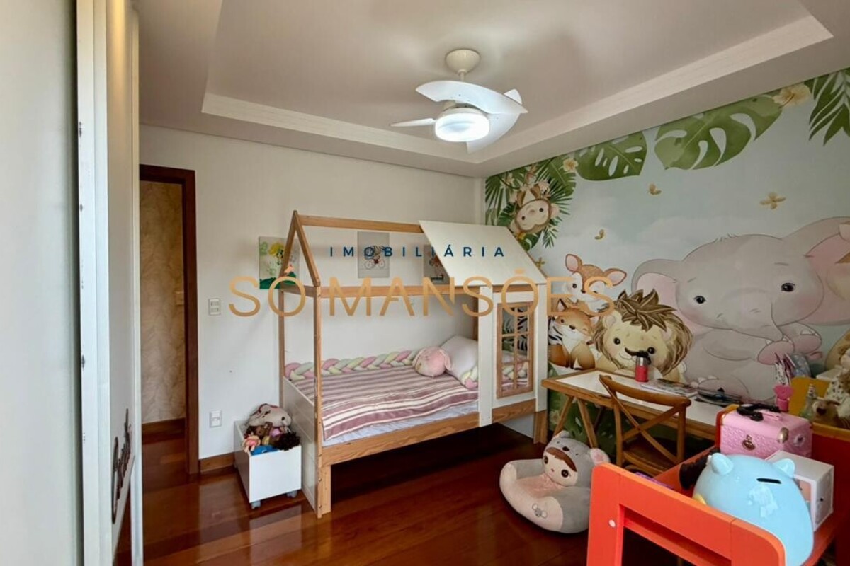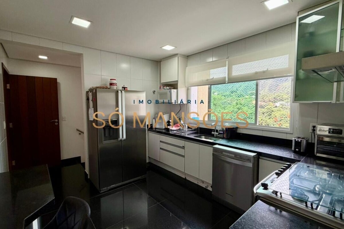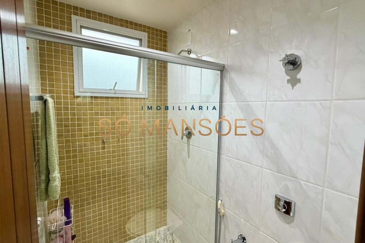 A garagem comporta quatro veículos, sendo duas vagas cobertas e duas descobertas. A área de serviço é ampla e funcional, contando com lavanderia, dois quartos de despejo e dependência completa de empregada.
