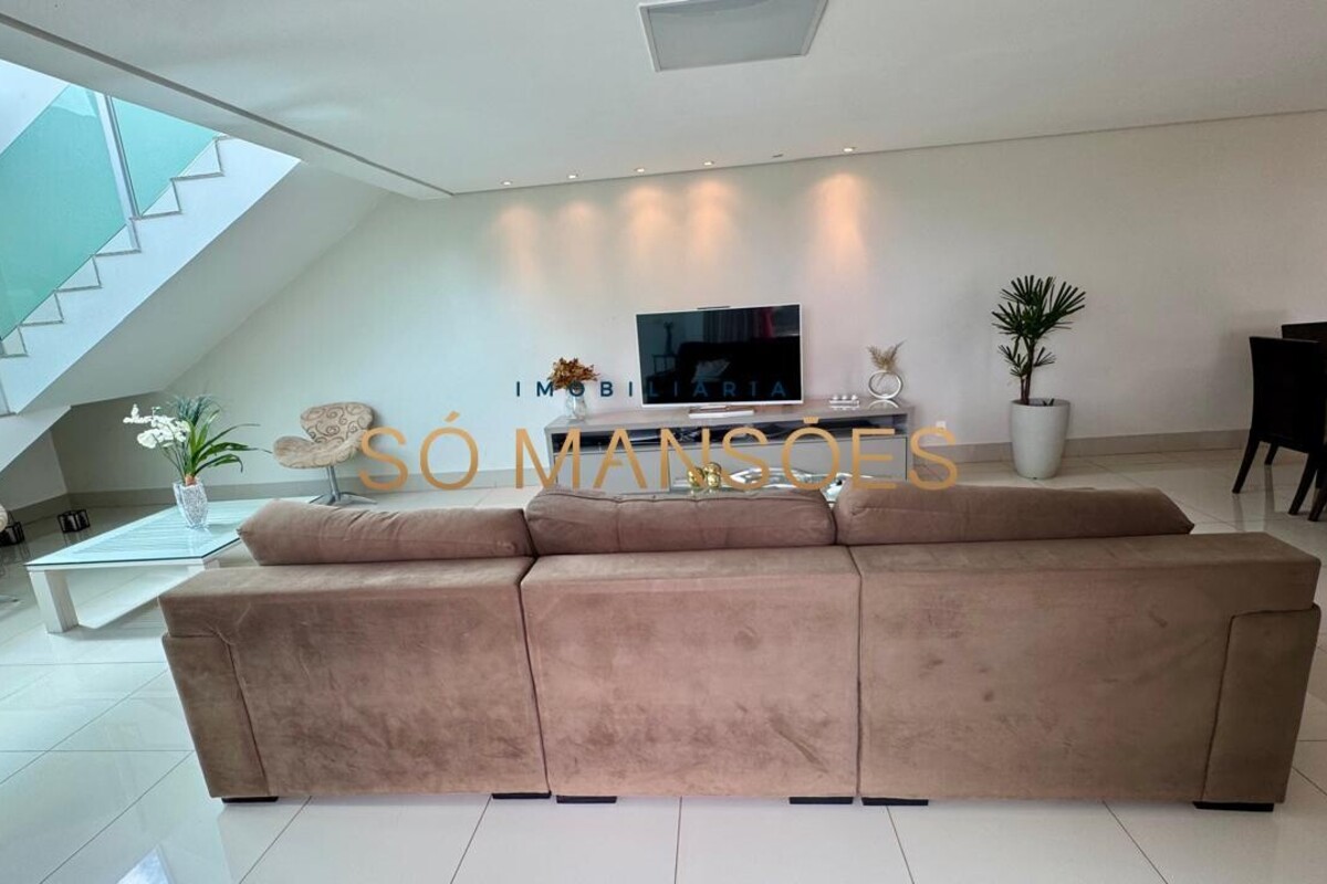 No pavimento inferior, a entrada revela ampla sala para três ambientes, com pé-direito duplo, proporcionando imponência e sensação de amplitude. A área social integra-se de forma harmoniosa à cozinha, ao espaço gourmet com churrasqueira e à área de lavanderia funcional, além de manter conexão direta com o jardim externo, criando ambiente ideal para convivência e lazer. A fluidez entre os espaços favorece a rotina e amplia as possibilidades de uso.
