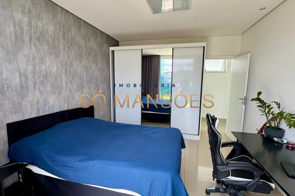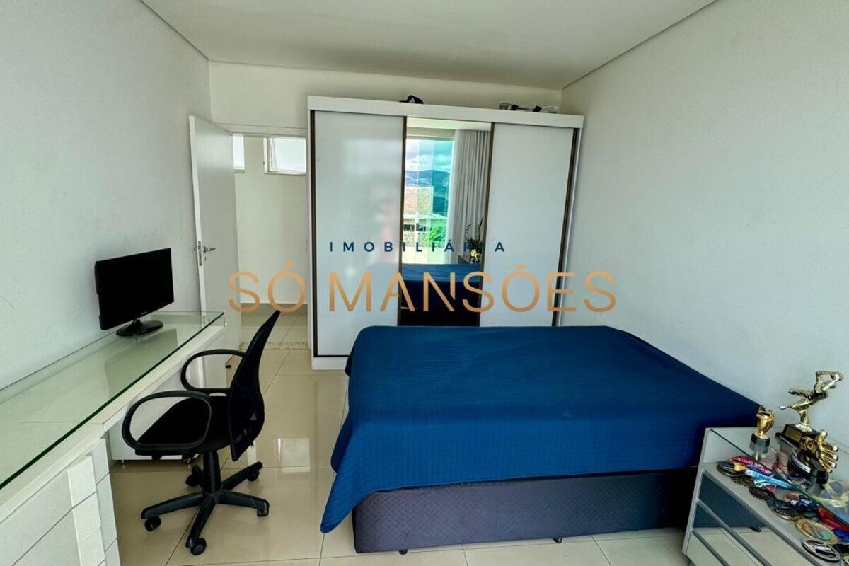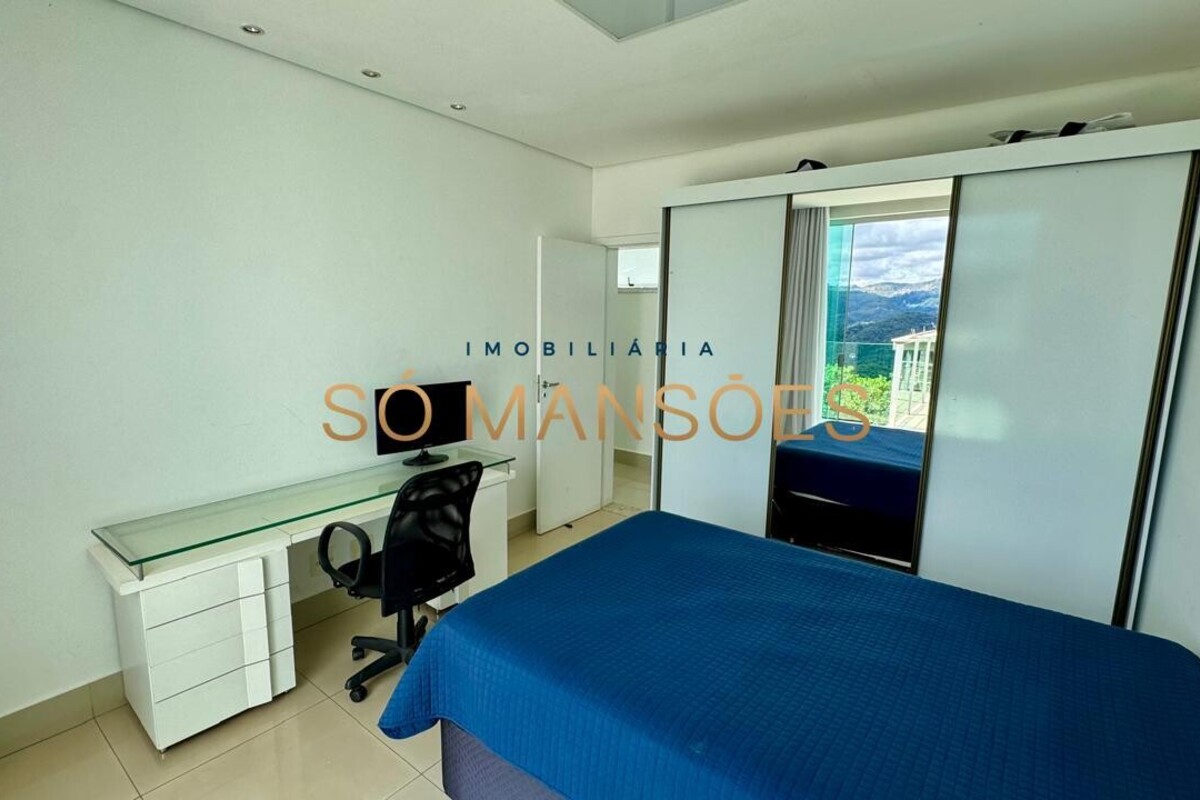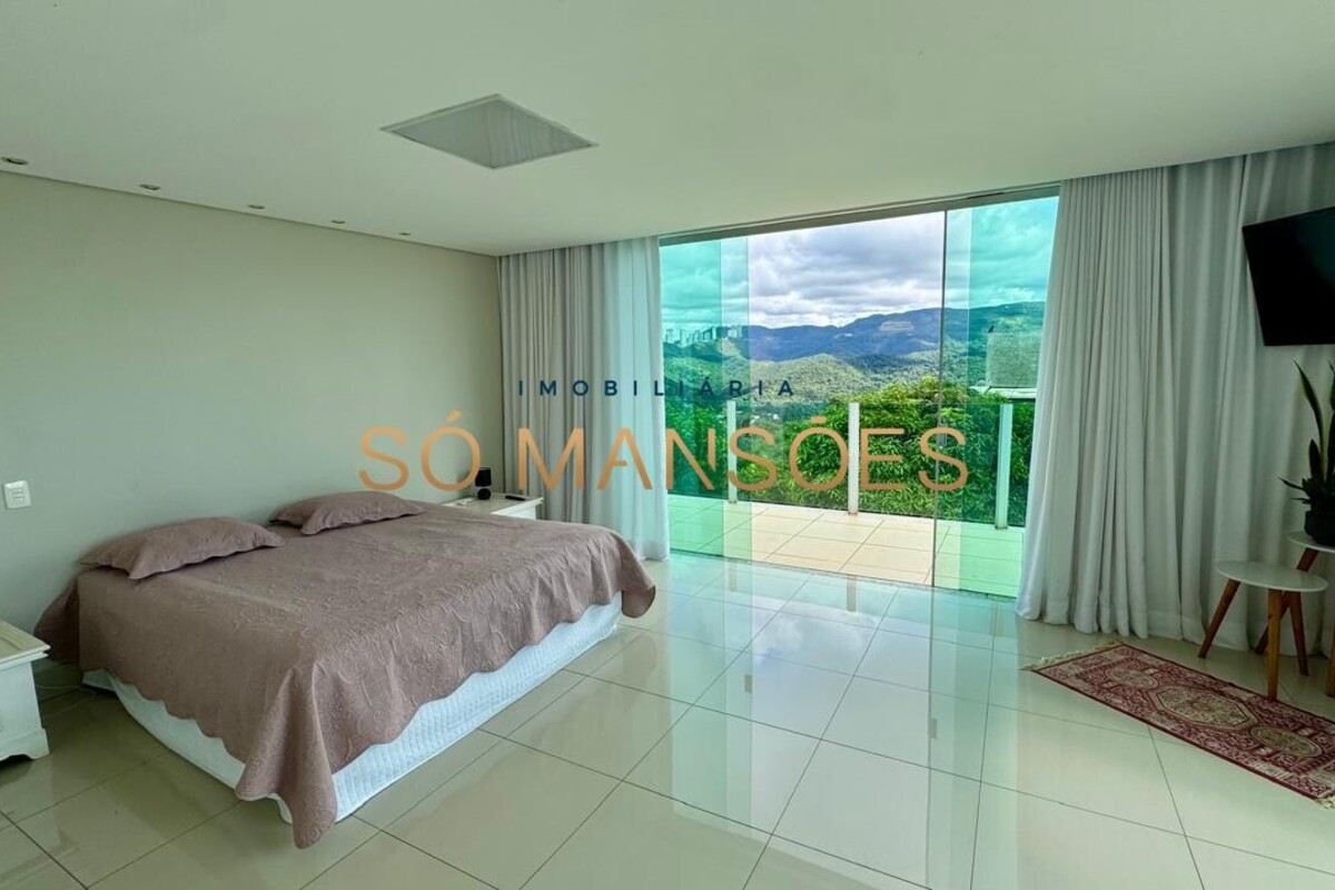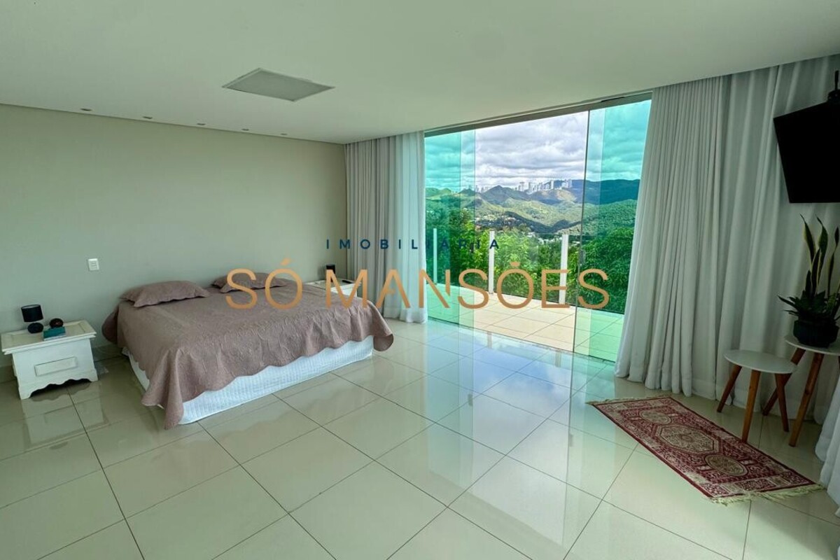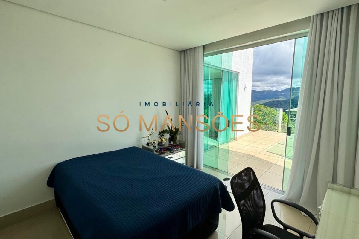 No pavimento superior, encontra-se a área íntima da residência, composta por três quartos, sendo uma suíte máster com amplo closet e dois quartos adicionais, atendidos por banheiro social. Todos os dormitórios possuem varanda privativa, oferecendo vista definitiva e privilegiada para as montanhas, garantindo tranquilidade, privacidade e permanente integração com a paisagem natural.