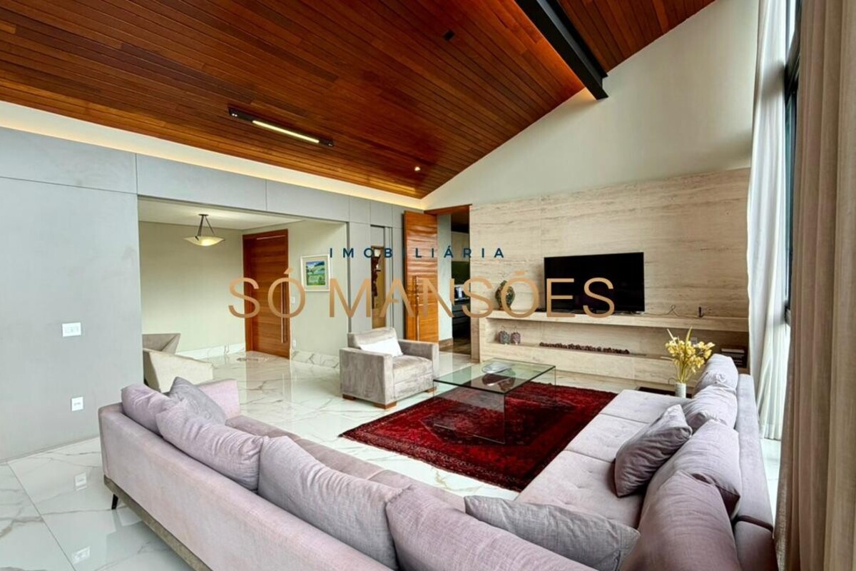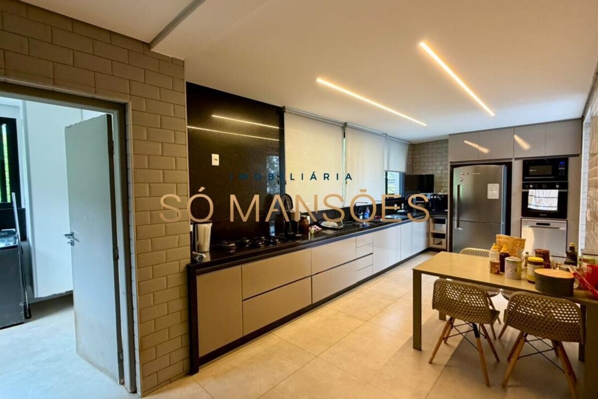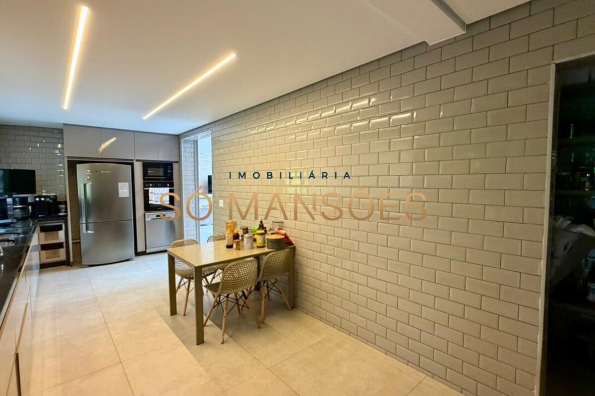 No pavimento principal, a residência conta com ampla sala para dois ambientes, lavabo, cozinha com despensa, área de serviço e dependência completa de empregada. A área íntima neste nível é composta por rouparia e quatro suítes, sendo três com closet, proporcionando organização e privacidade aos moradores.