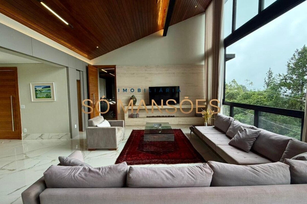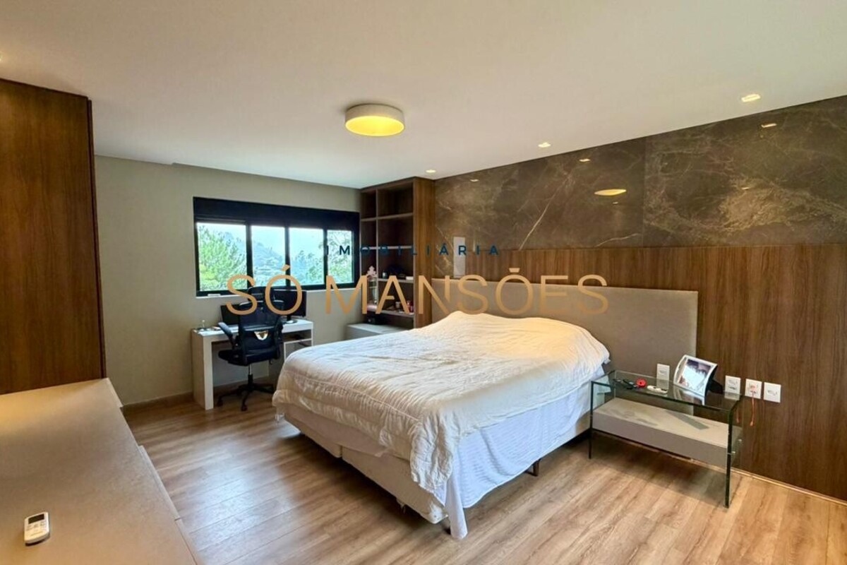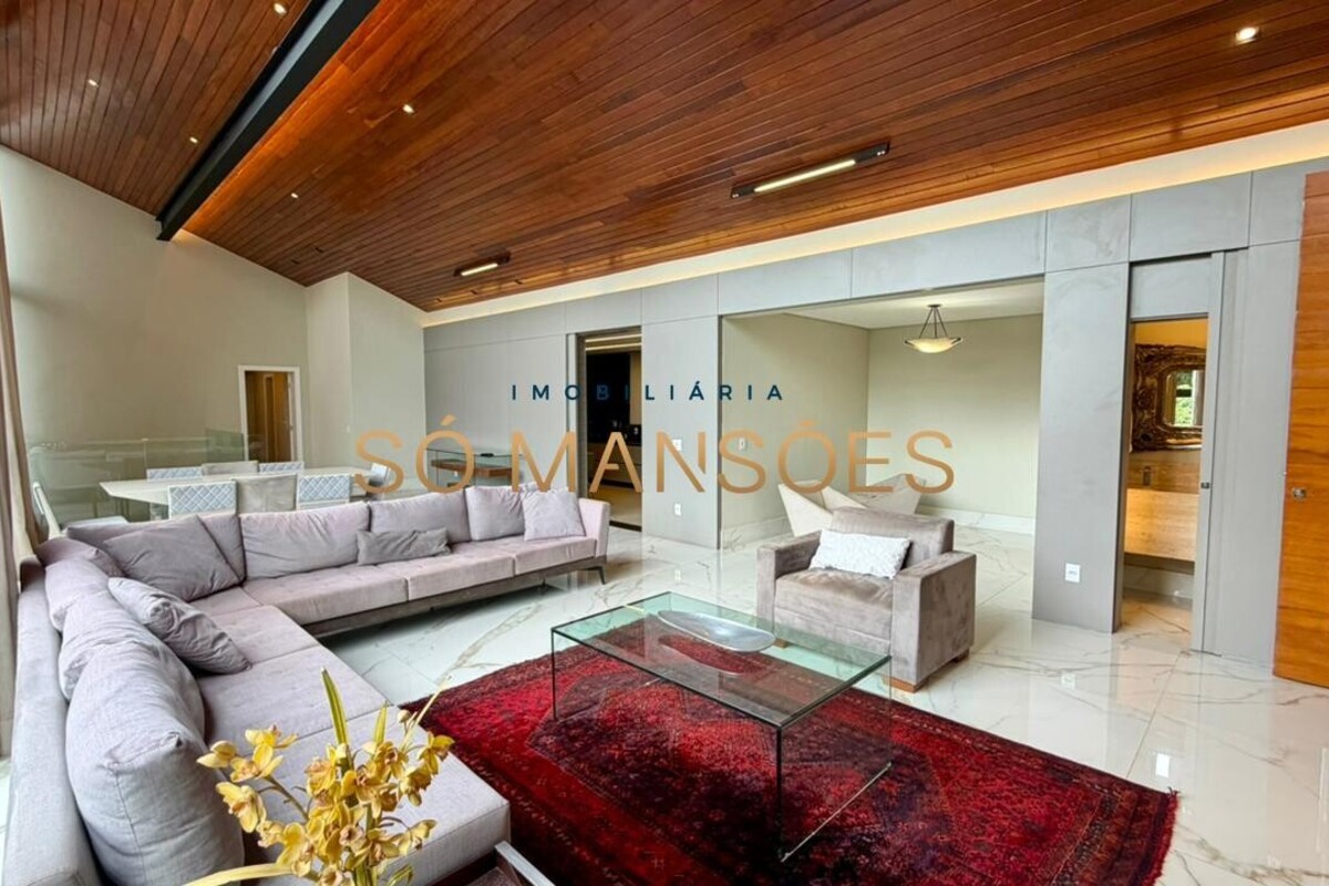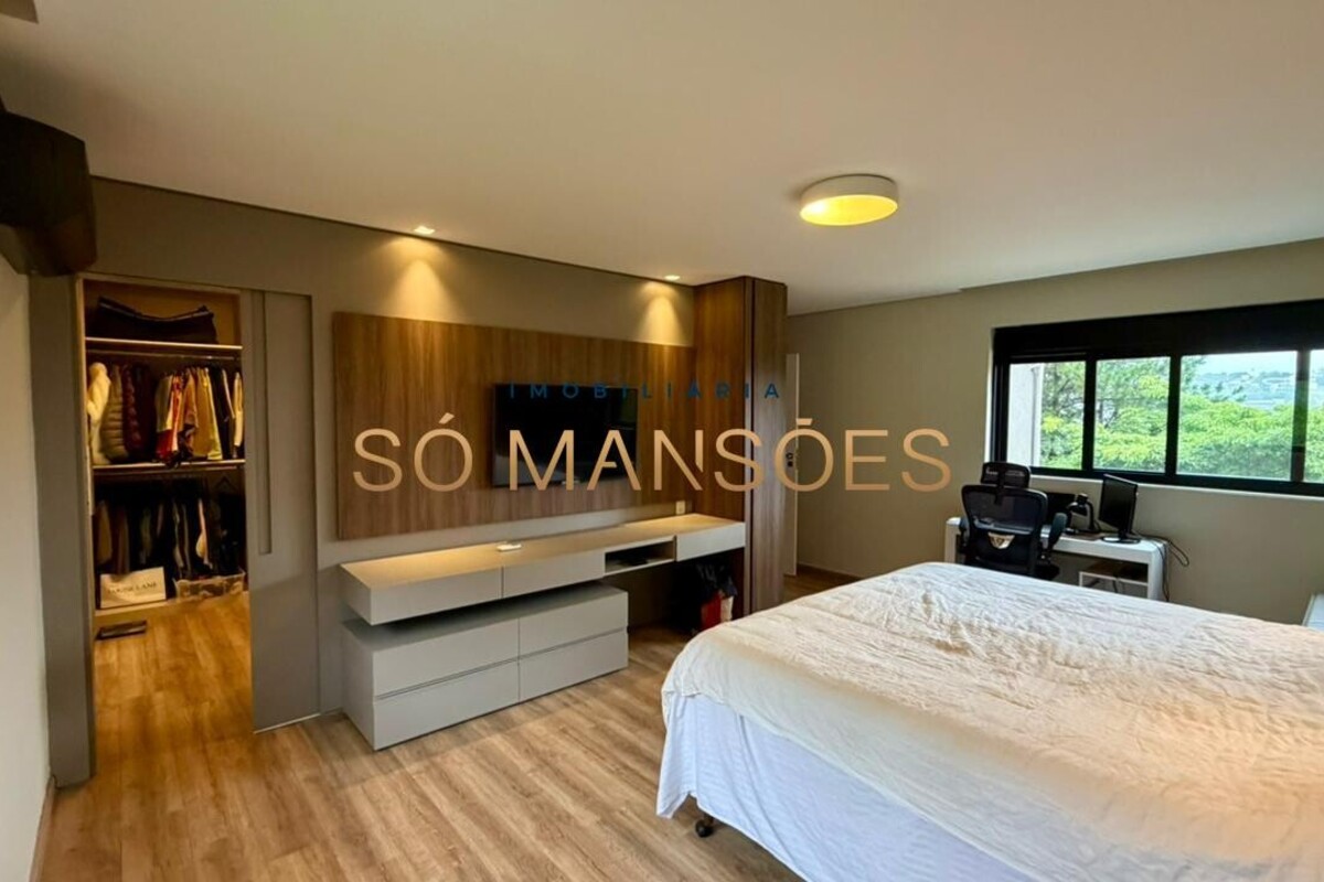 No pavimento principal, a residência conta com ampla sala para dois ambientes, lavabo, cozinha com despensa, área de serviço e dependência completa de empregada. A área íntima neste nível é composta por rouparia e quatro suítes, sendo três com closet, proporcionando organização e privacidade aos moradores.