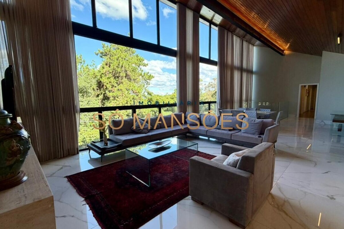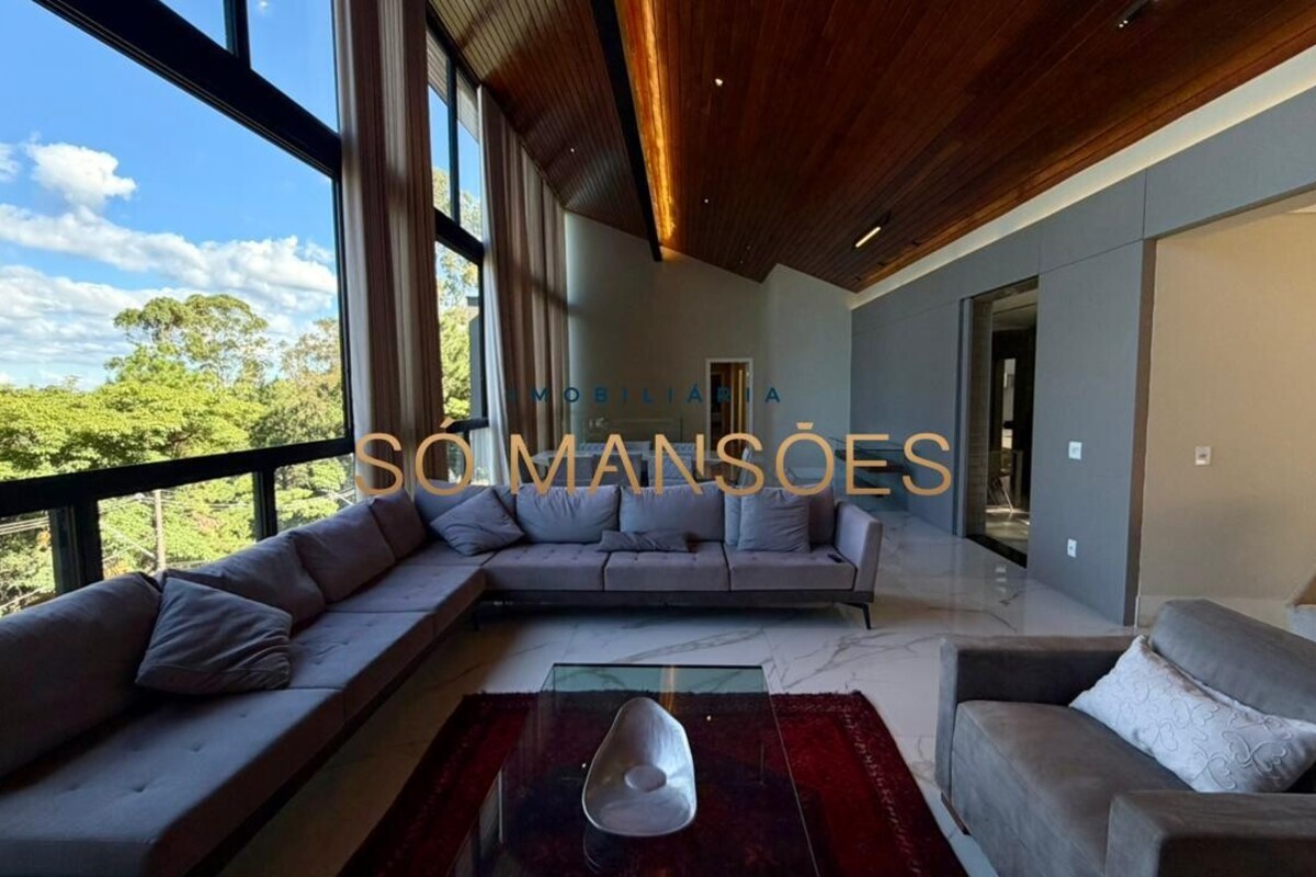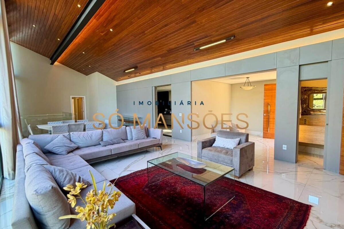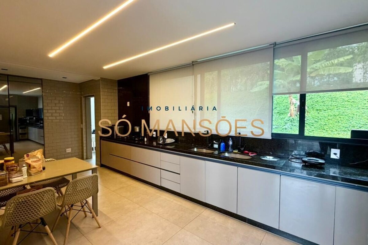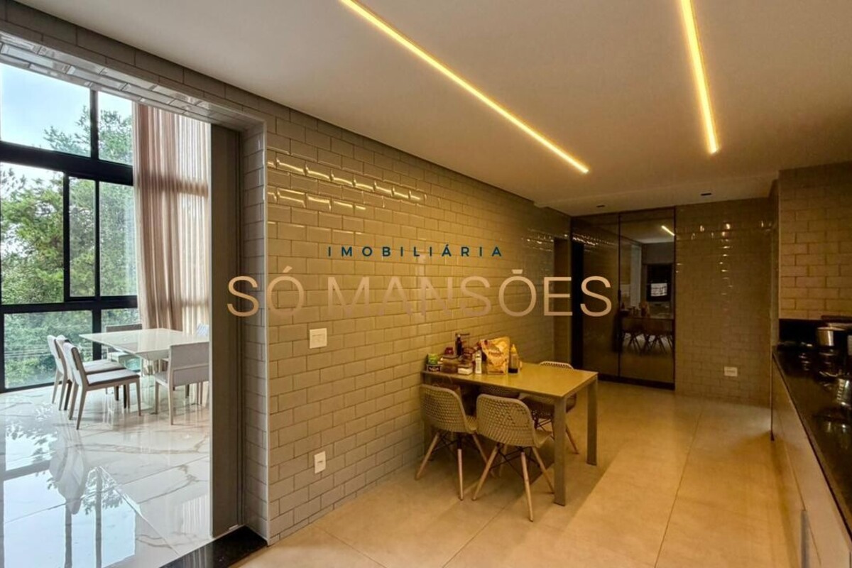 No pavimento principal, a residência conta com ampla sala para dois ambientes, lavabo, cozinha com despensa, área de serviço e dependência completa de empregada. A área íntima neste nível é composta por rouparia e quatro suítes, sendo três com closet, proporcionando organização e privacidade aos moradores.