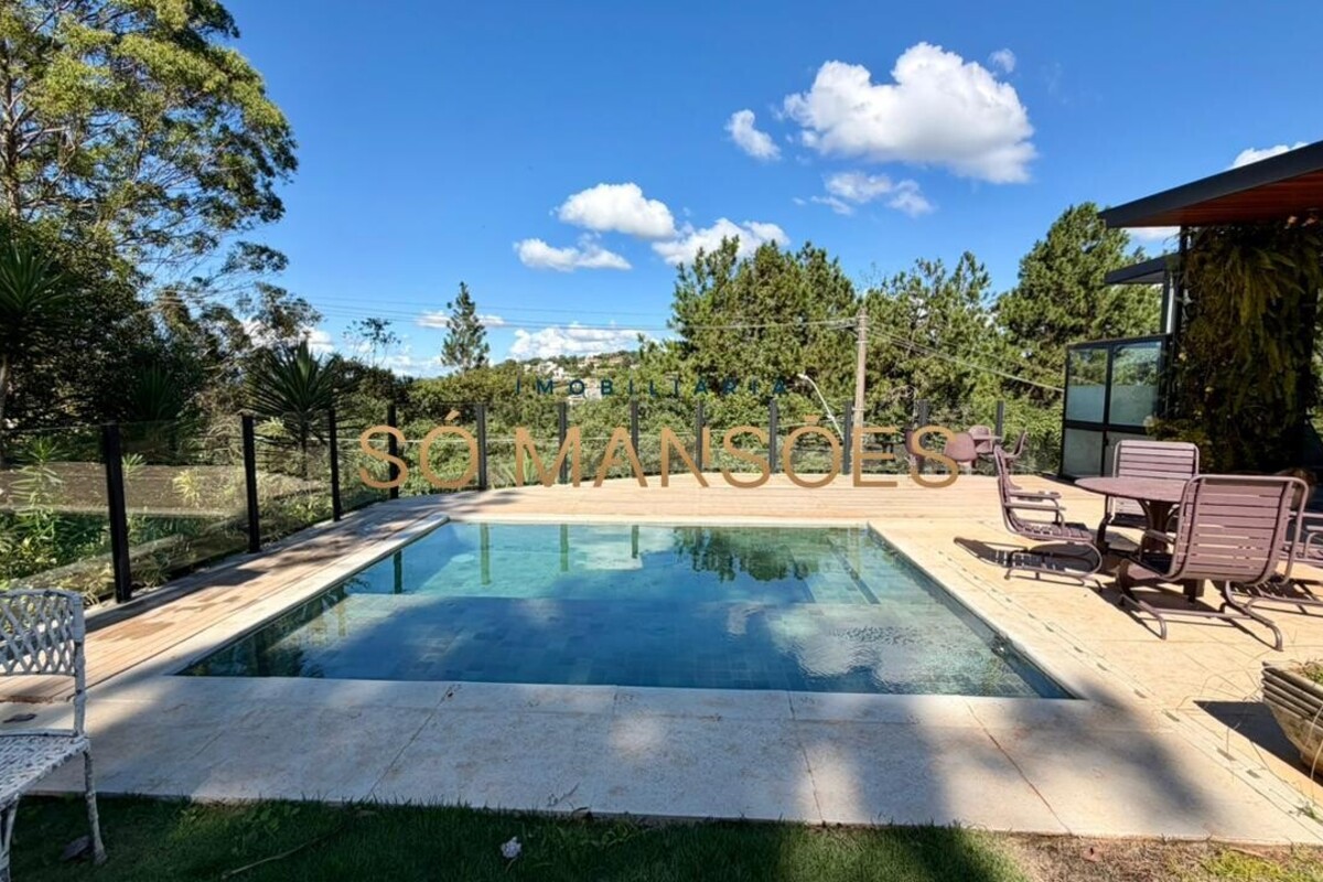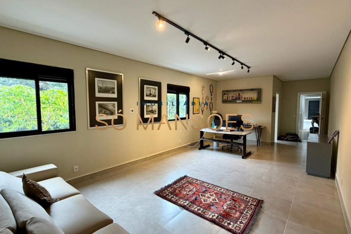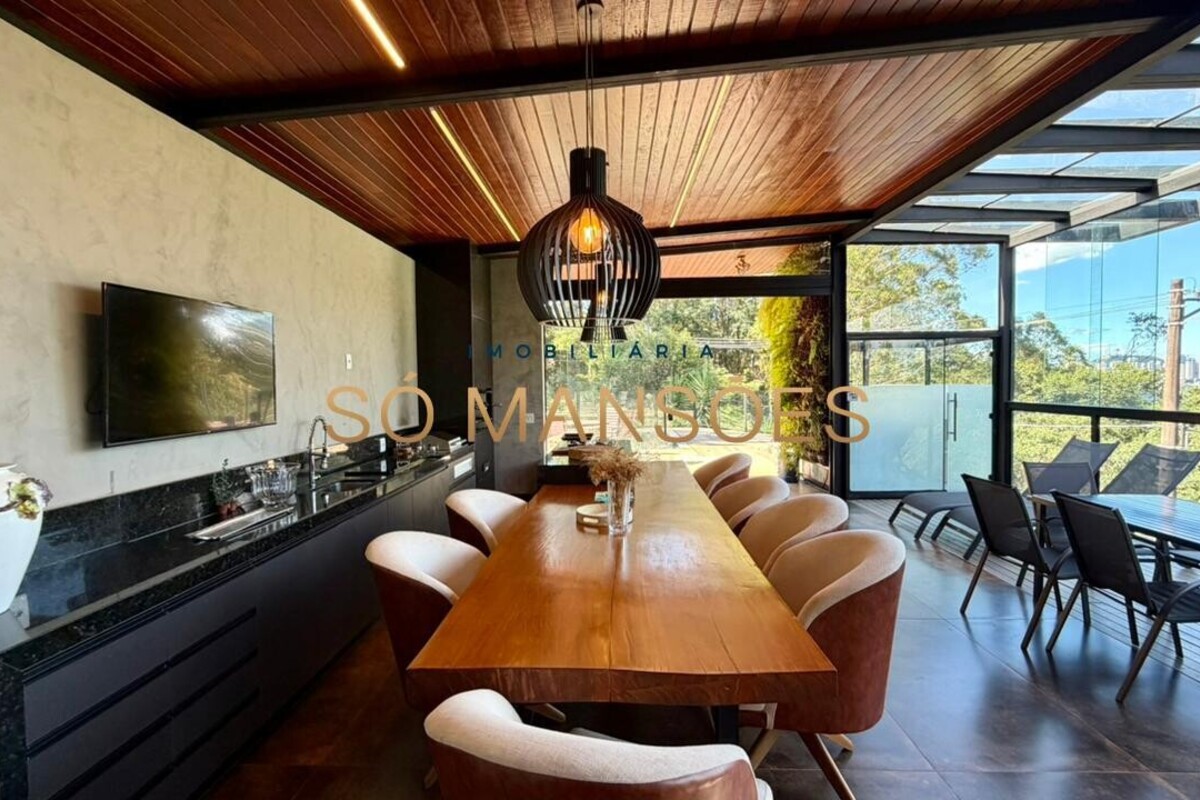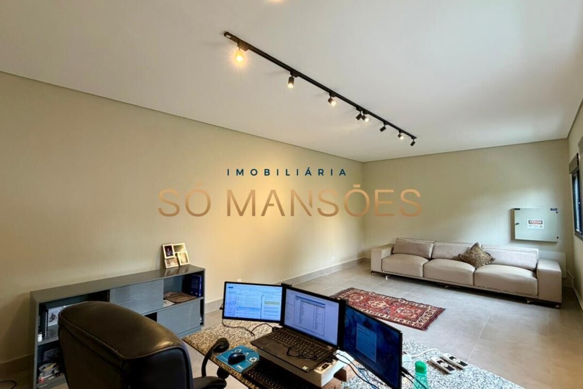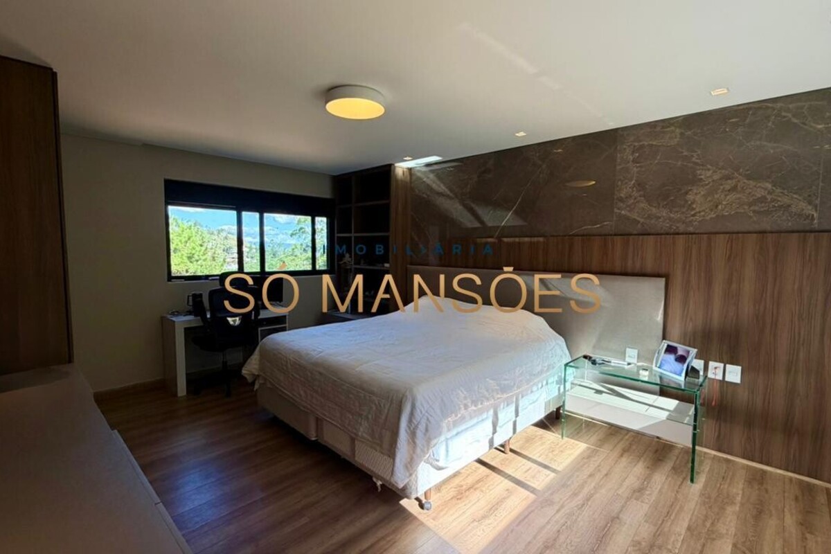 No pavimento principal, a residência conta com ampla sala para dois ambientes, lavabo, cozinha com despensa, área de serviço e dependência completa de empregada. A área íntima neste nível é composta por rouparia e quatro suítes, sendo três com closet, proporcionando organização e privacidade aos moradores.
