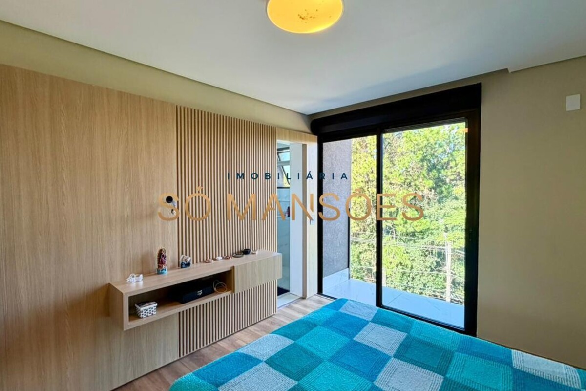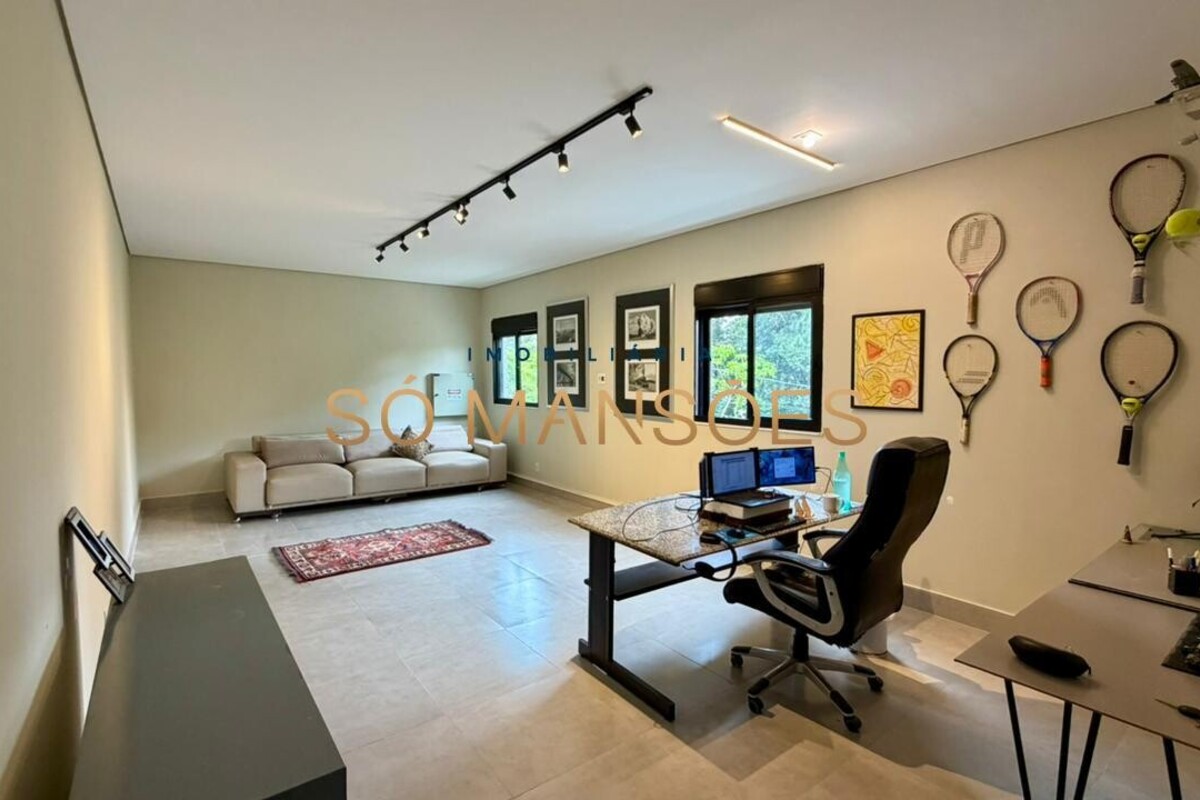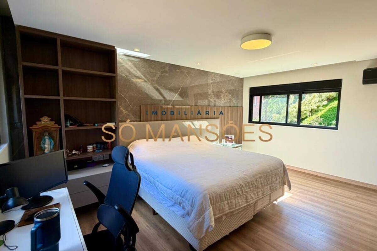 No pavimento inferior, o imóvel dispõe de uma ampla suíte adicional, além de garagem com capacidade para quatro veículos e depósito, garantindo praticidade e apoio à rotina da casa.