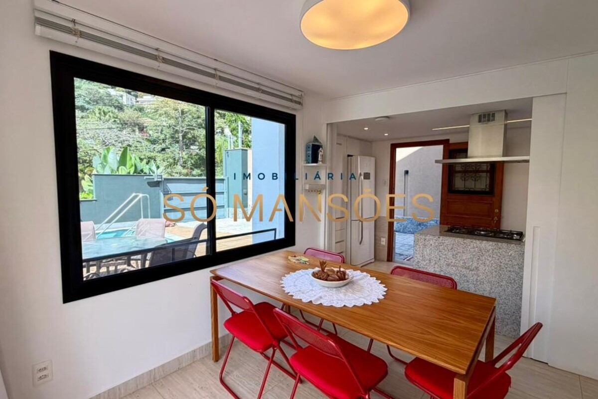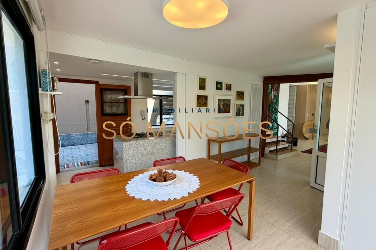 Construída em três pavimentos, a casa possui no pavimento principal uma ampla sala para três ambientes, banheiro completo, lavabo com acesso tanto à área interna quanto à área de piscina, além de cozinha e despensa.