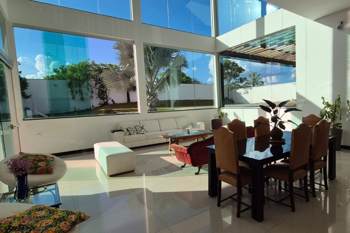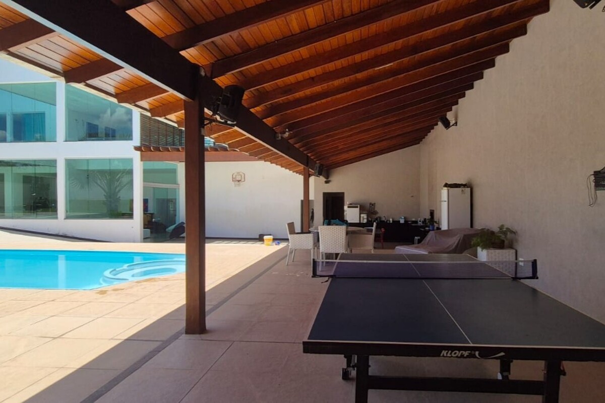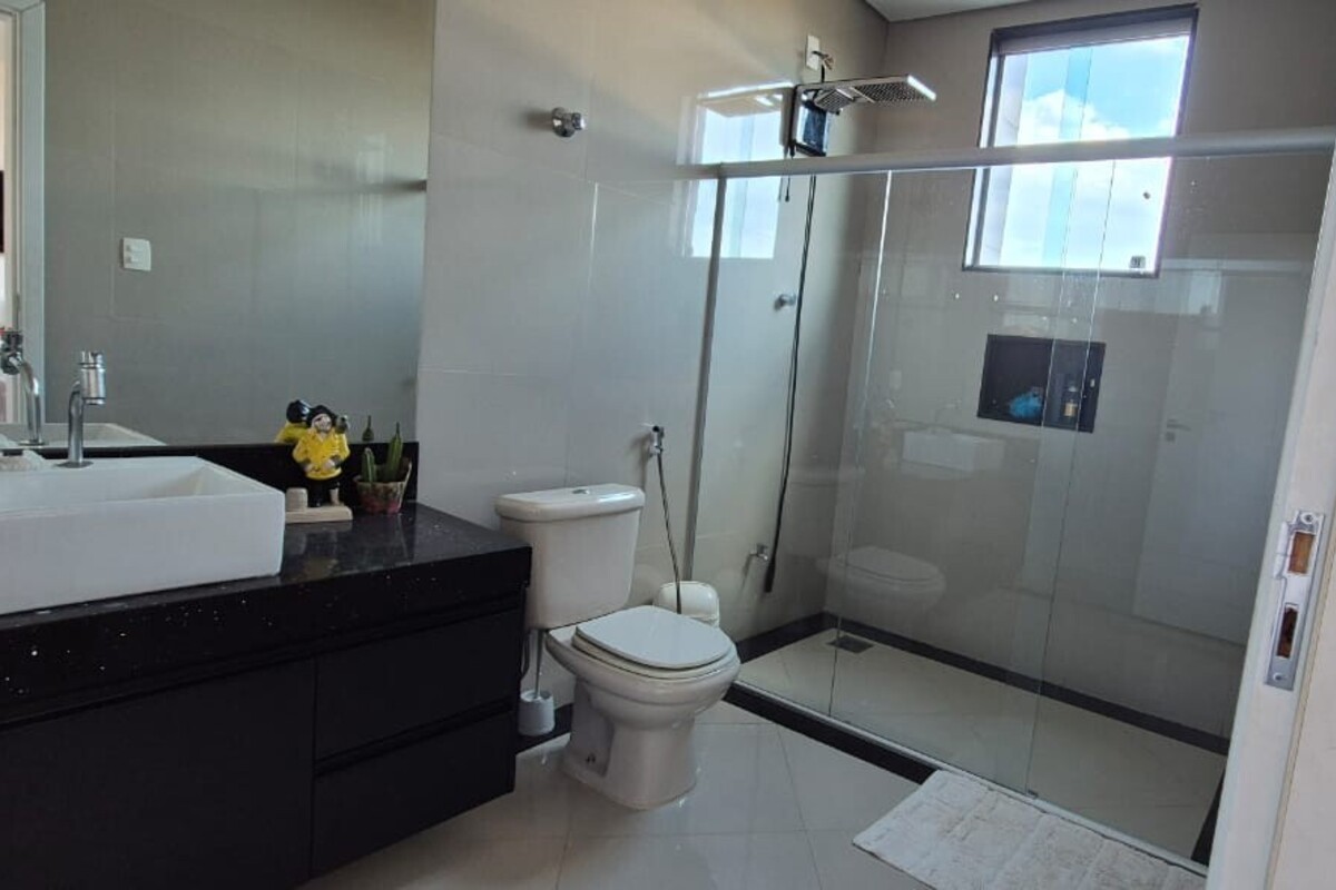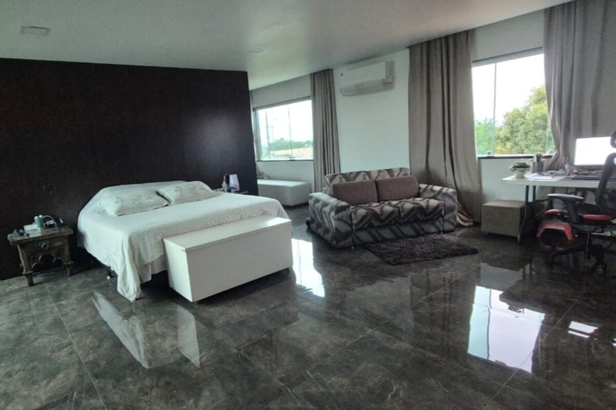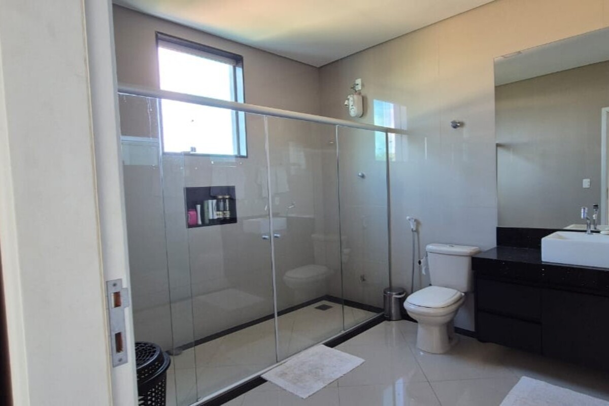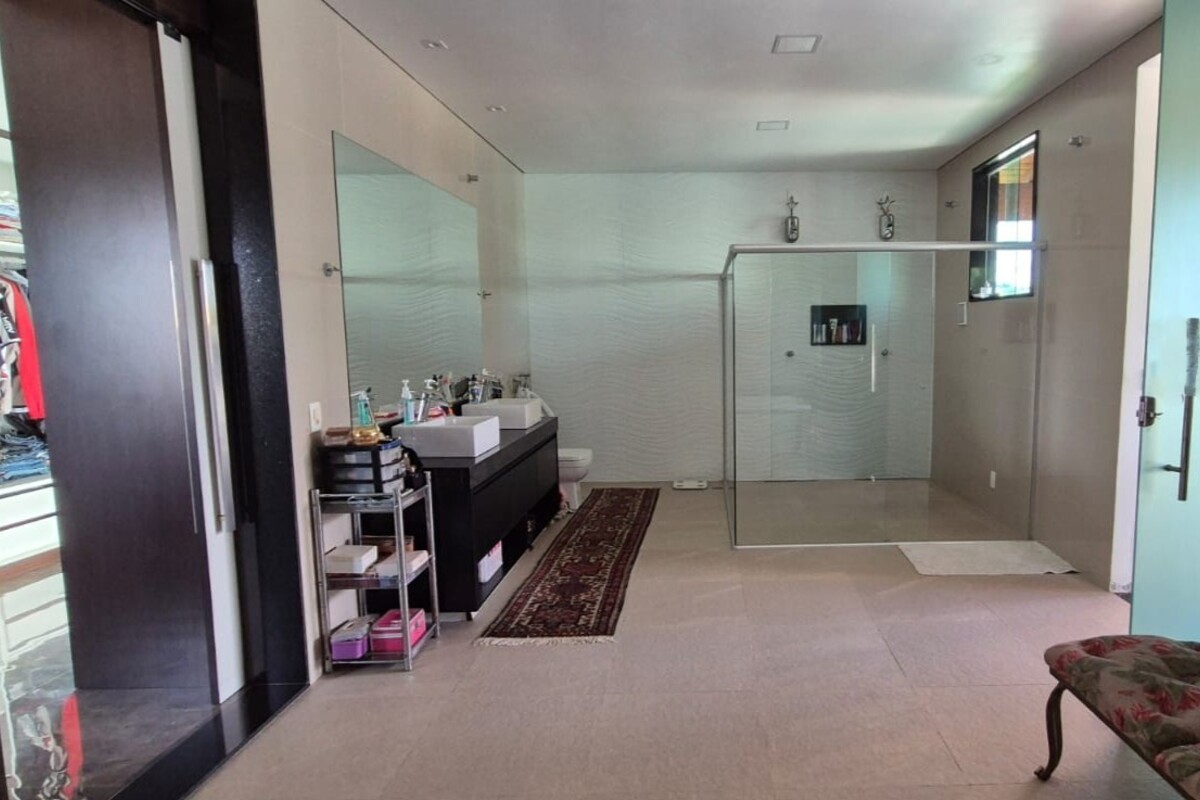 A casa dispõe de cinco suítes, com destaque para a suíte master que possui aproximadamente 140 m², oferecendo um espaço exclusivo de conforto e privacidade. Ao todo, o imóvel conta com oito banheiros, atendendo de forma prática toda a dinâmica da residência.