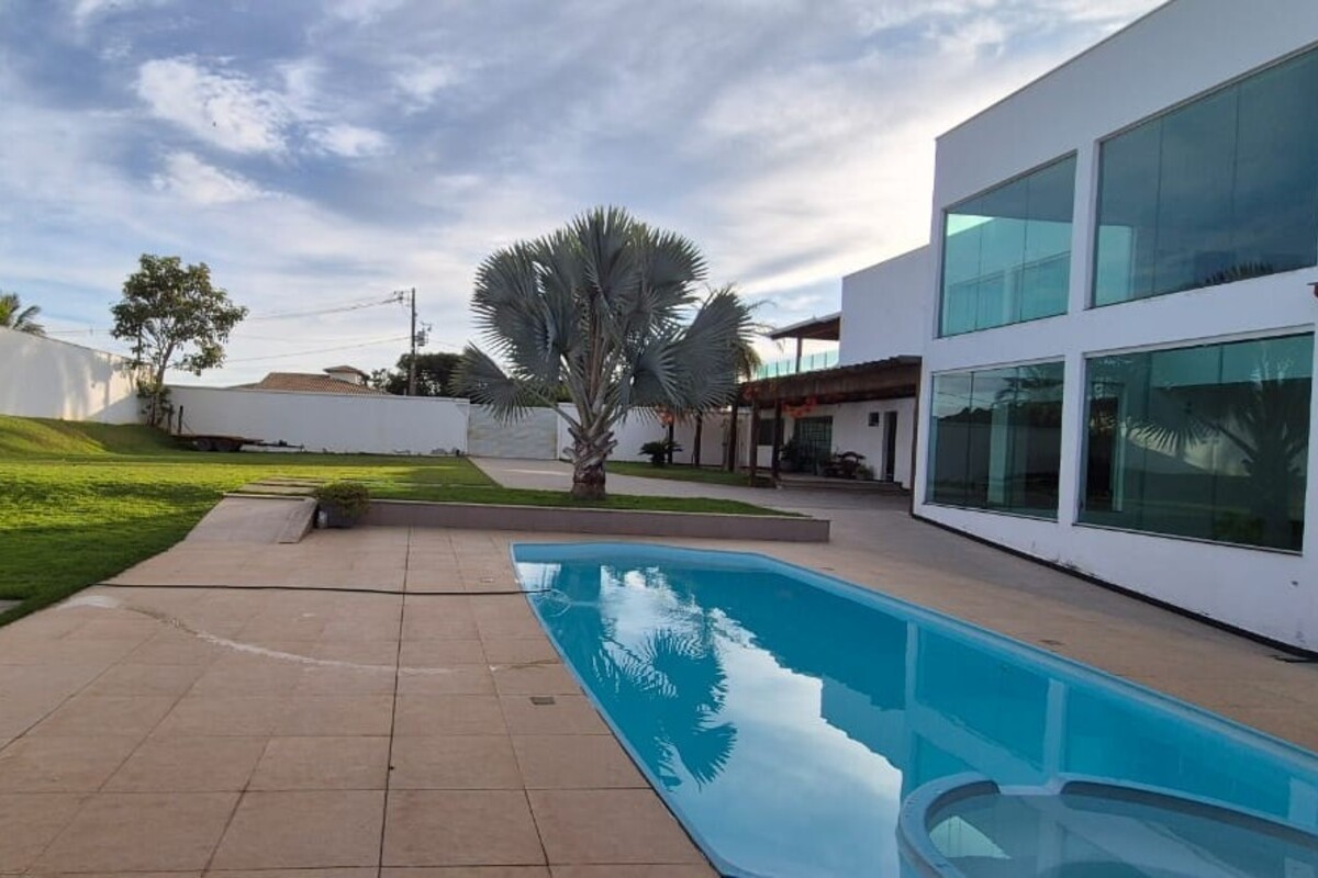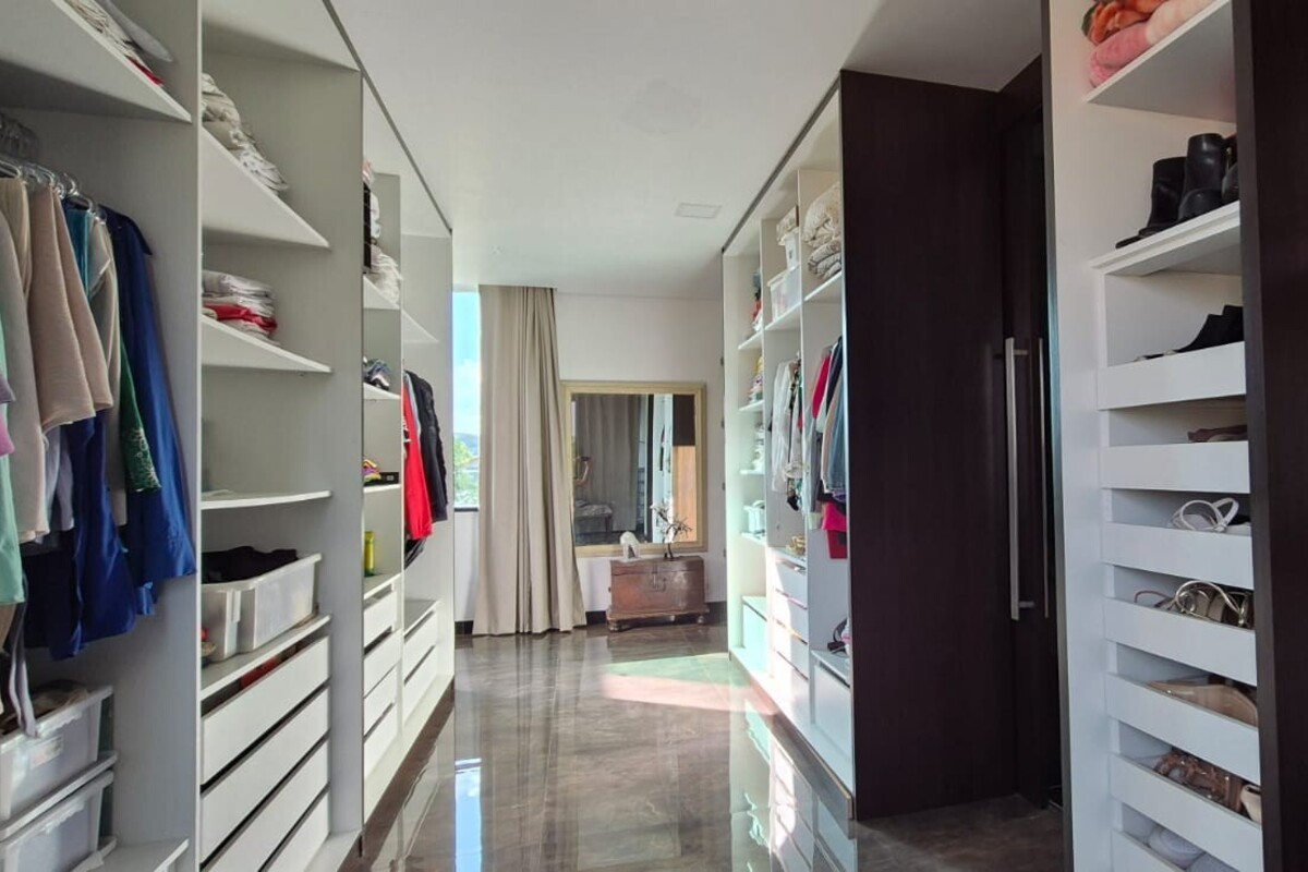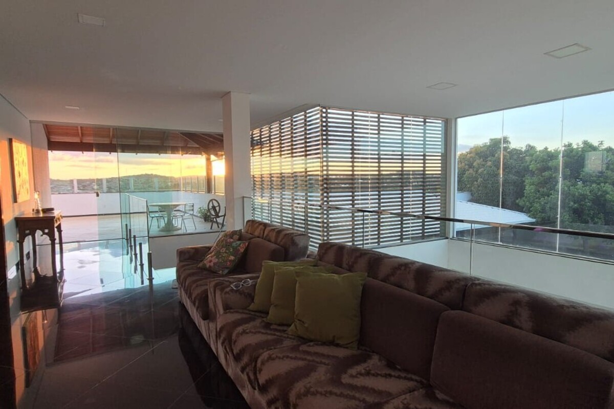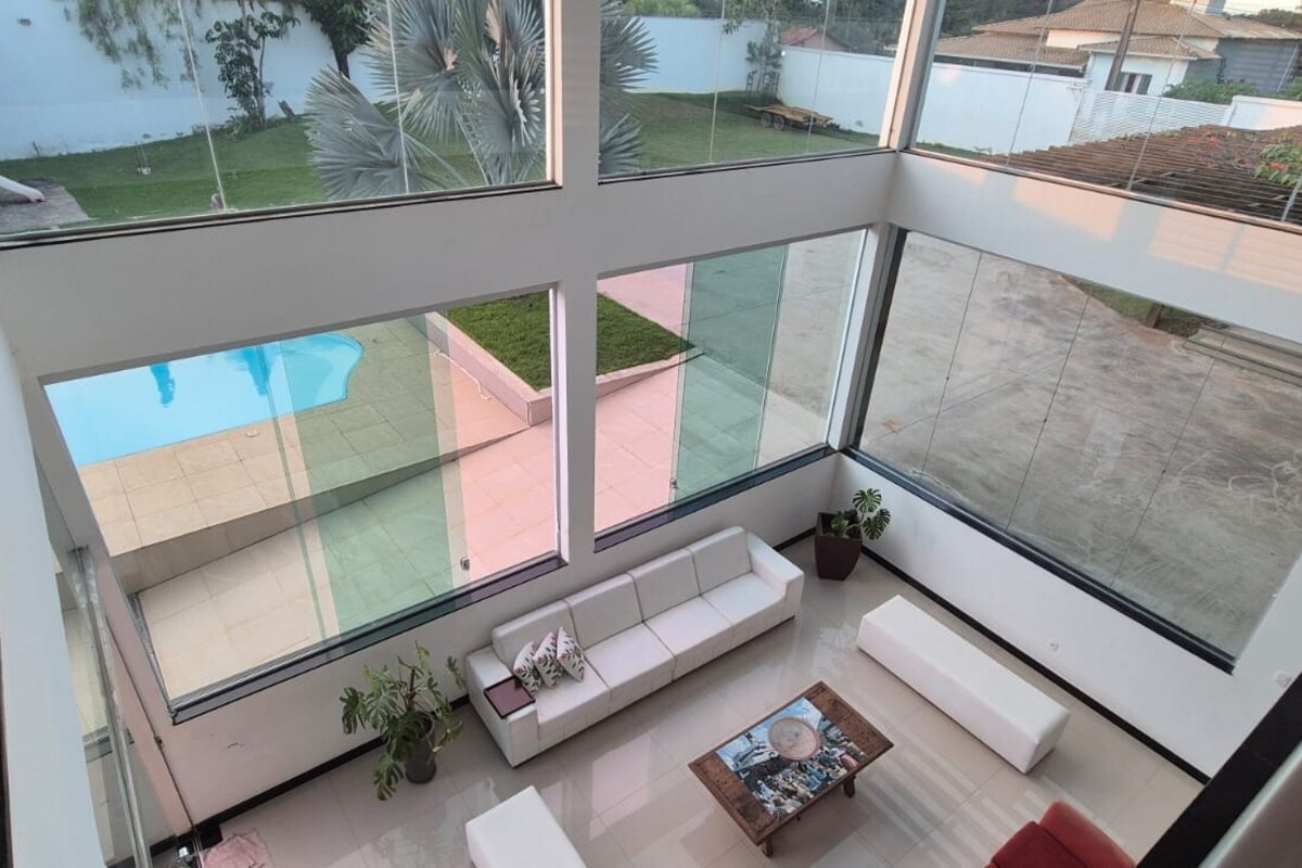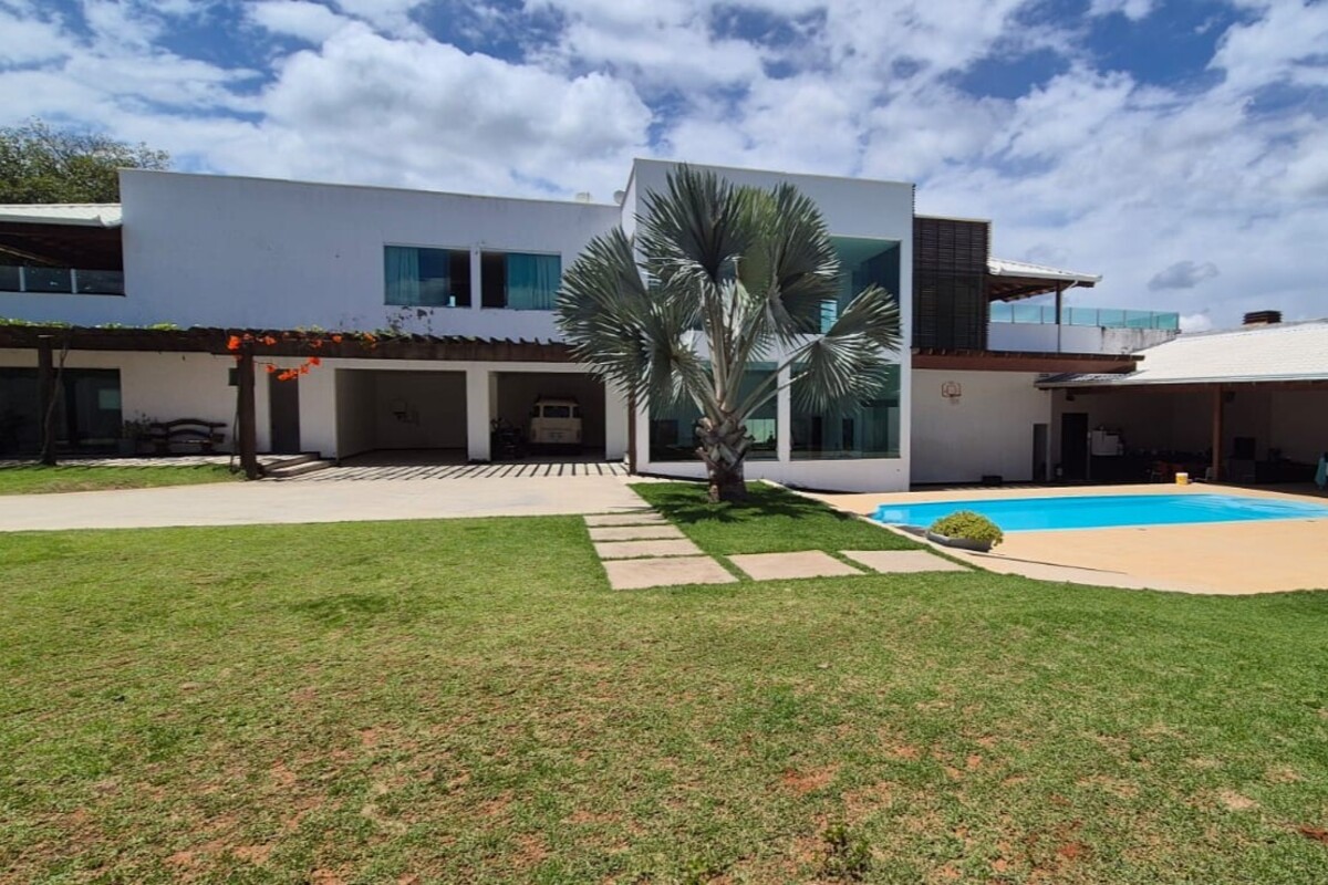 A casa dispõe de cinco suítes, com destaque para a suíte master que possui aproximadamente 140 m², oferecendo um espaço exclusivo de conforto e privacidade. Ao todo, o imóvel conta com oito banheiros, atendendo de forma prática toda a dinâmica da residência.