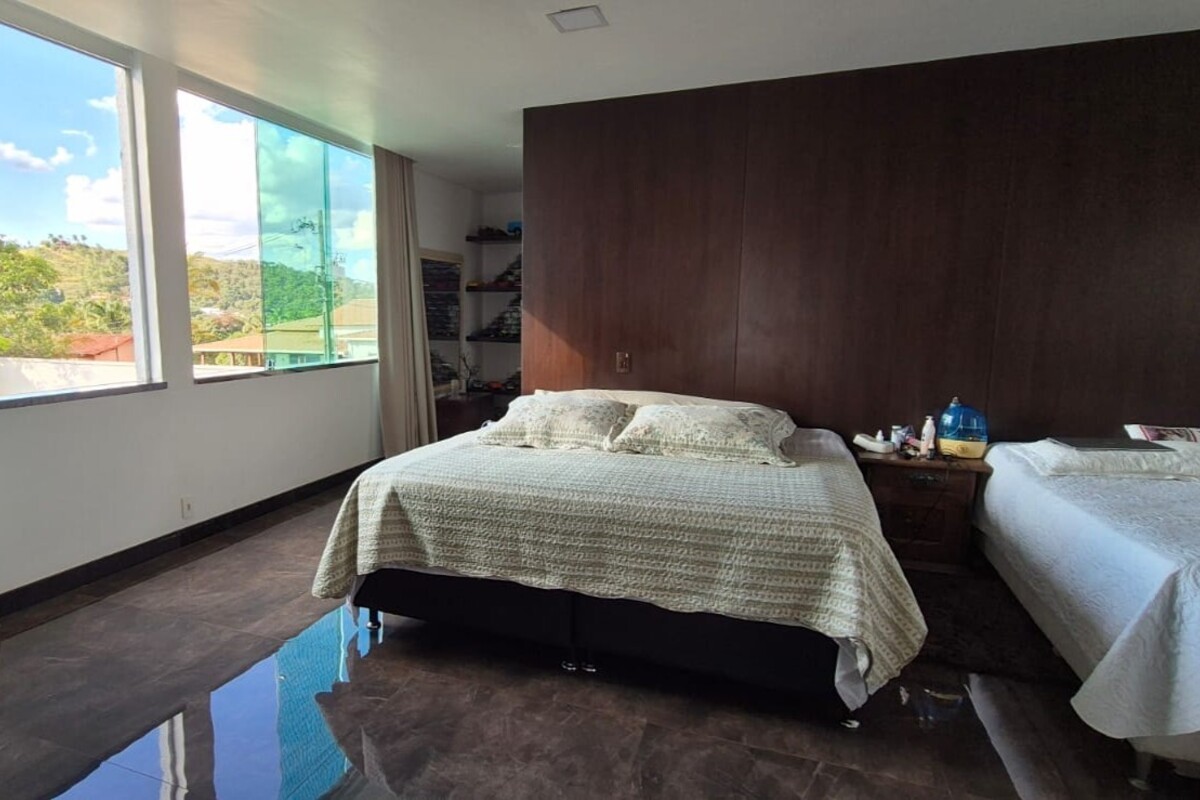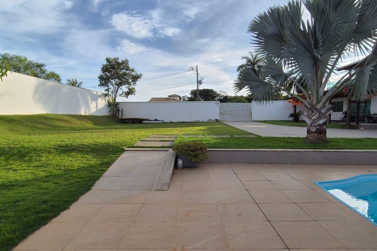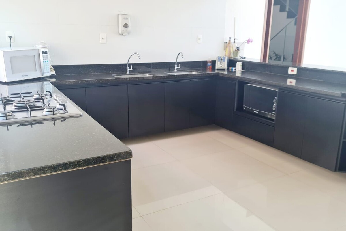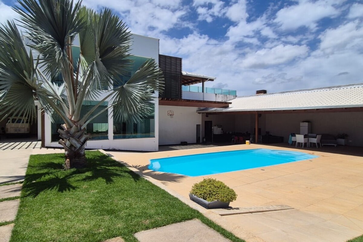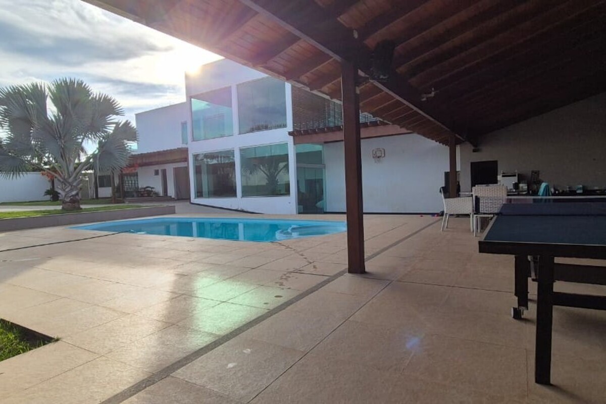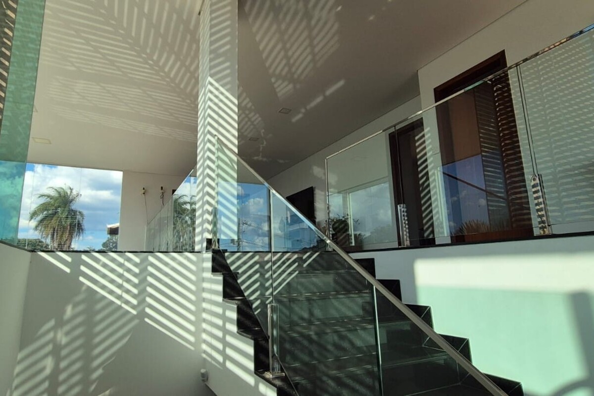 A casa dispõe de cinco suítes, com destaque para a suíte master que possui aproximadamente 140 m², oferecendo um espaço exclusivo de conforto e privacidade. Ao todo, o imóvel conta com oito banheiros, atendendo de forma prática toda a dinâmica da residência.