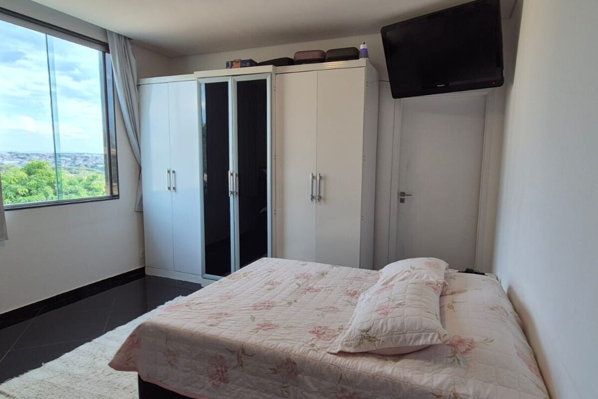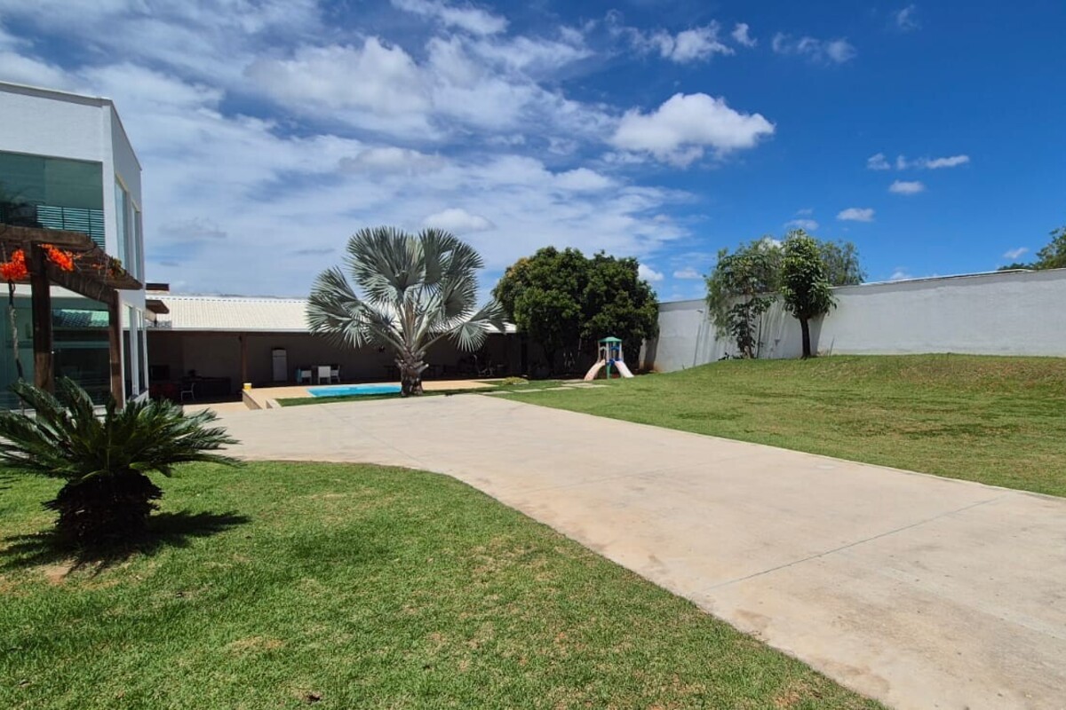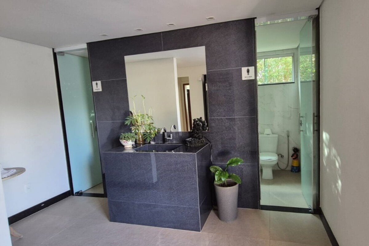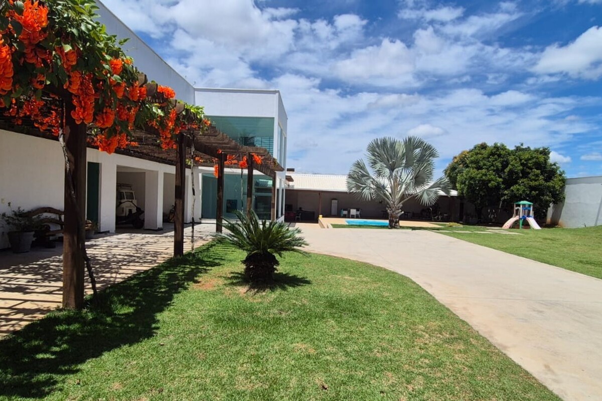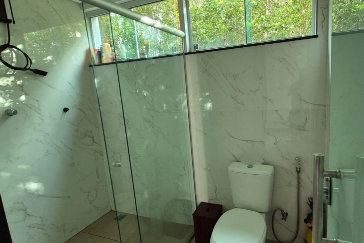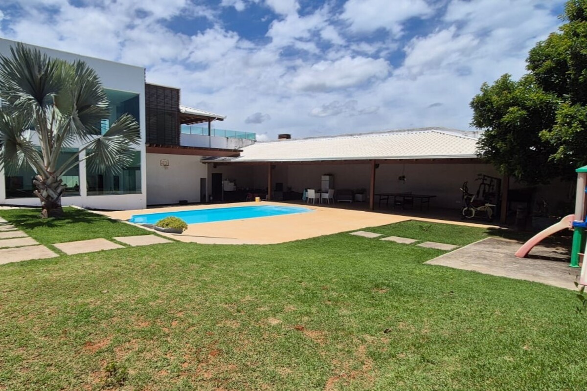 A casa dispõe de cinco suítes, com destaque para a suíte master que possui aproximadamente 140 m², oferecendo um espaço exclusivo de conforto e privacidade. Ao todo, o imóvel conta com oito banheiros, atendendo de forma prática toda a dinâmica da residência.