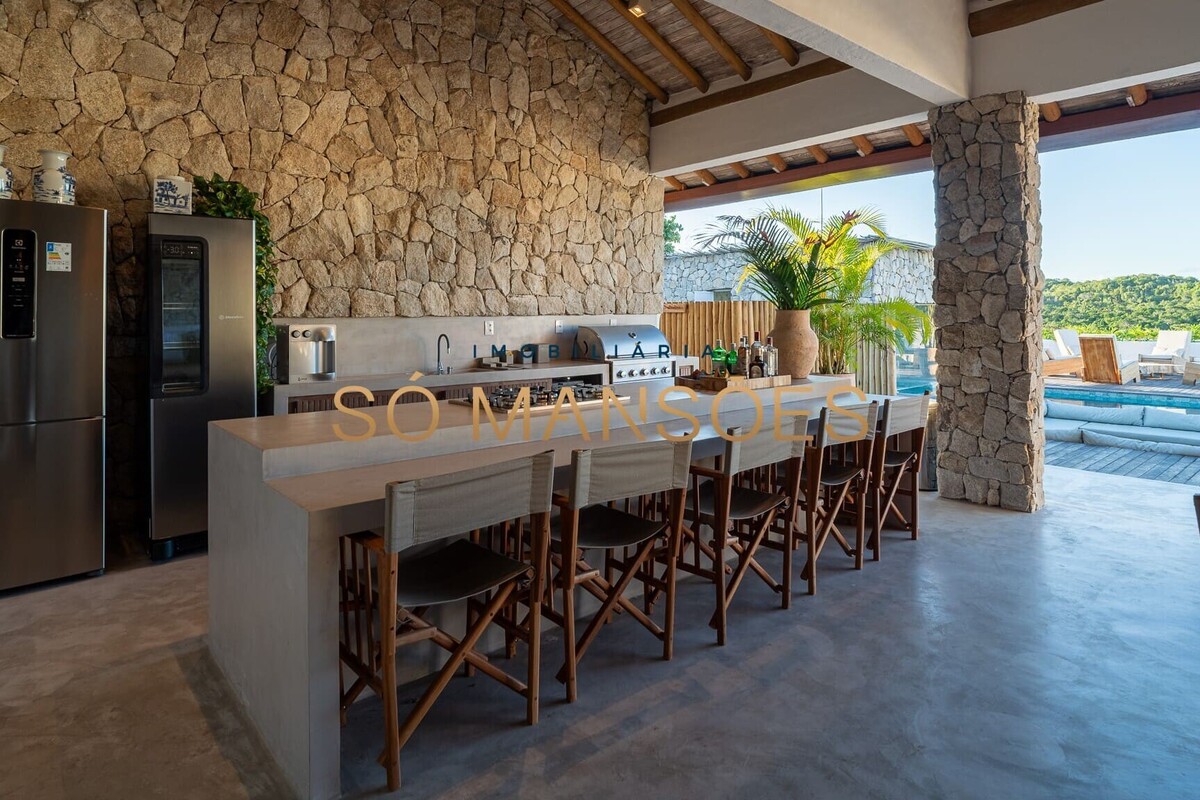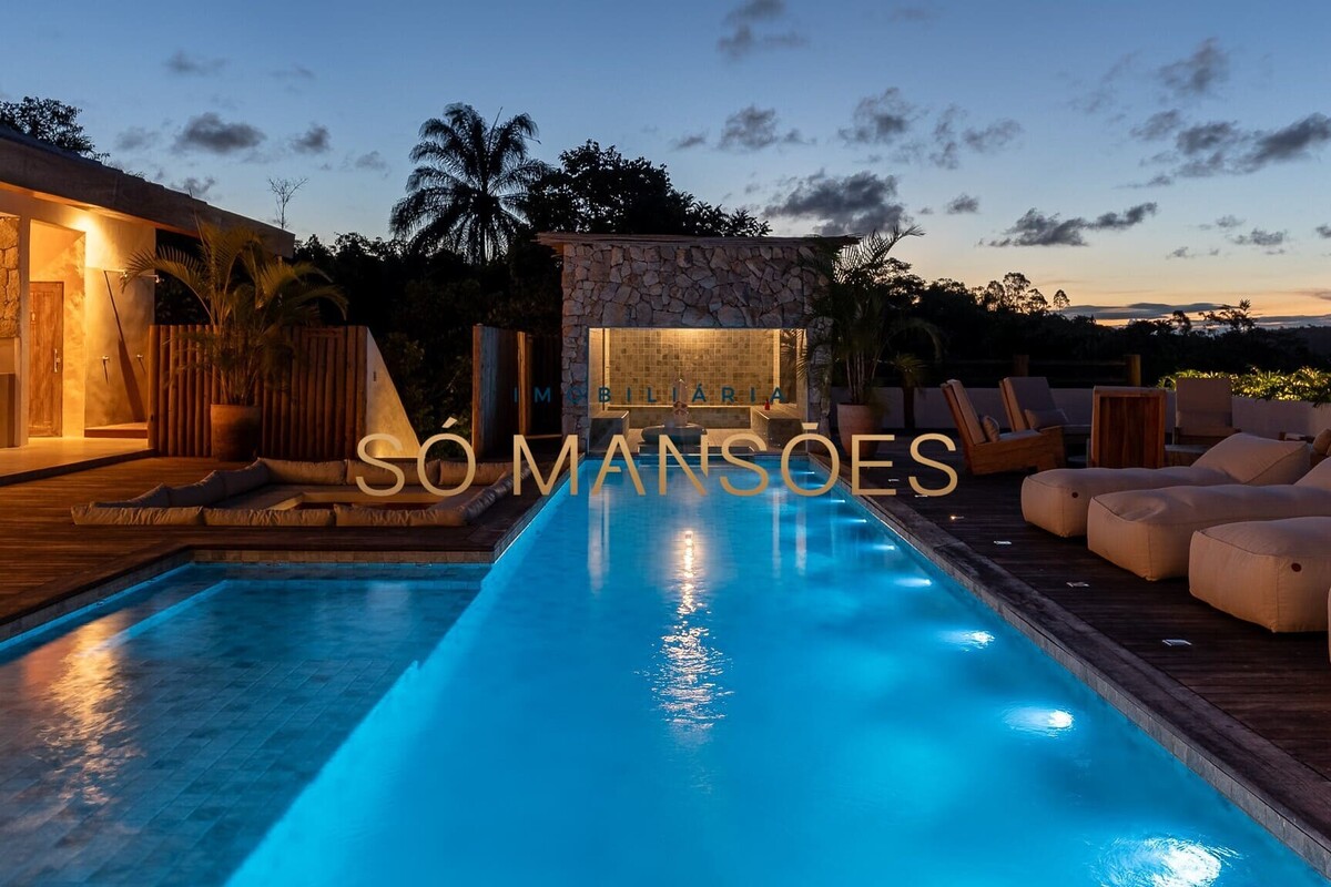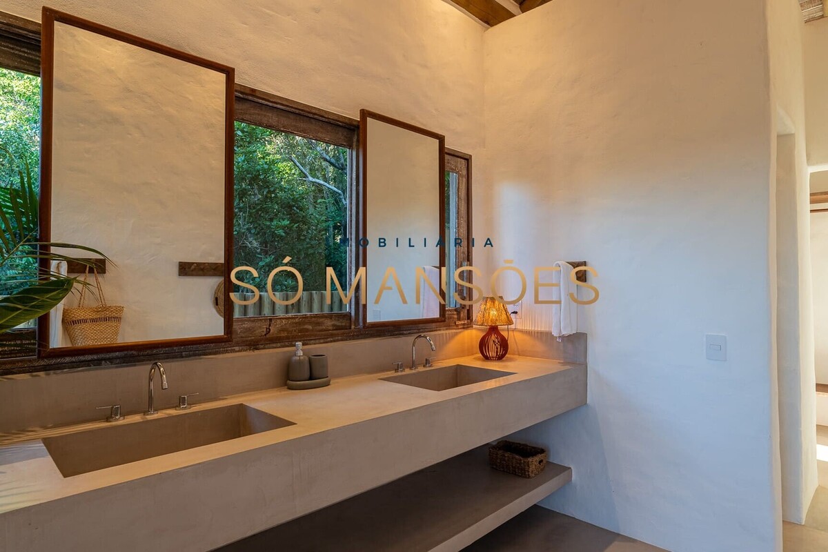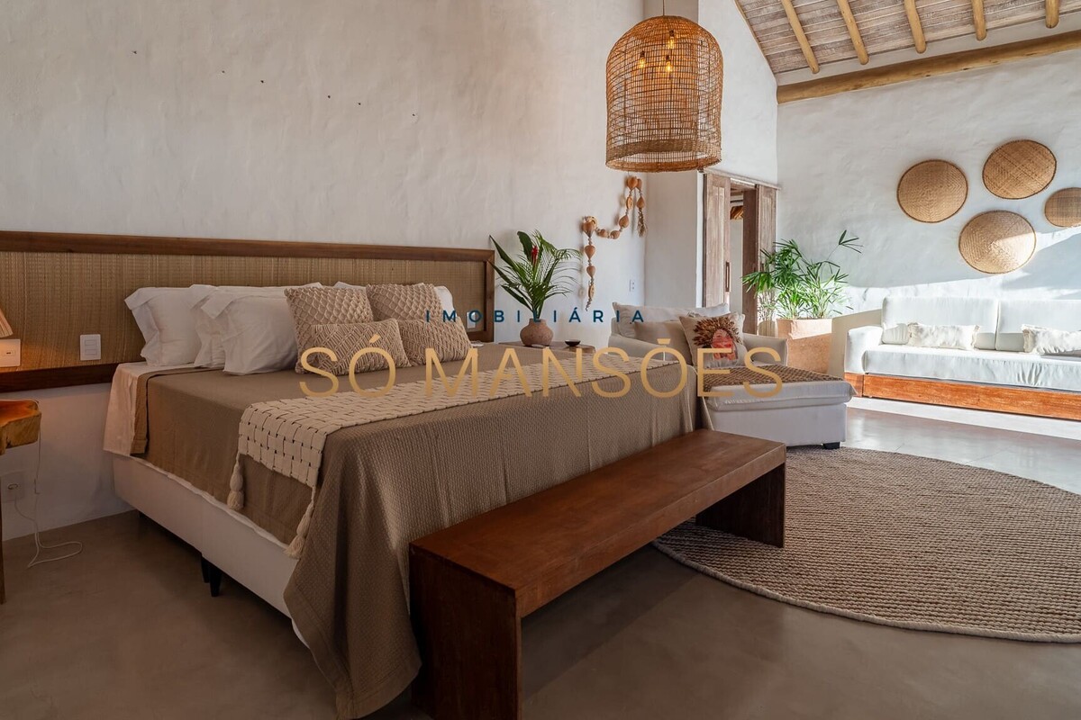 A casa conta com cinco suítes, todas equipadas com cama king size, incluindo uma suíte master com banheiro com hidromassagem. Há ainda um quarto com banheiro de apoio destinado a staff, equipado com duas camas de solteiro. Ao todo, o imóvel dispõe de dez banheiros, sendo cinco das suítes, um lavabo, dois banheiros de apoio à área da piscina e à área gourmet, um banheiro do quarto de apoio e um banheiro de apoio à cozinha.