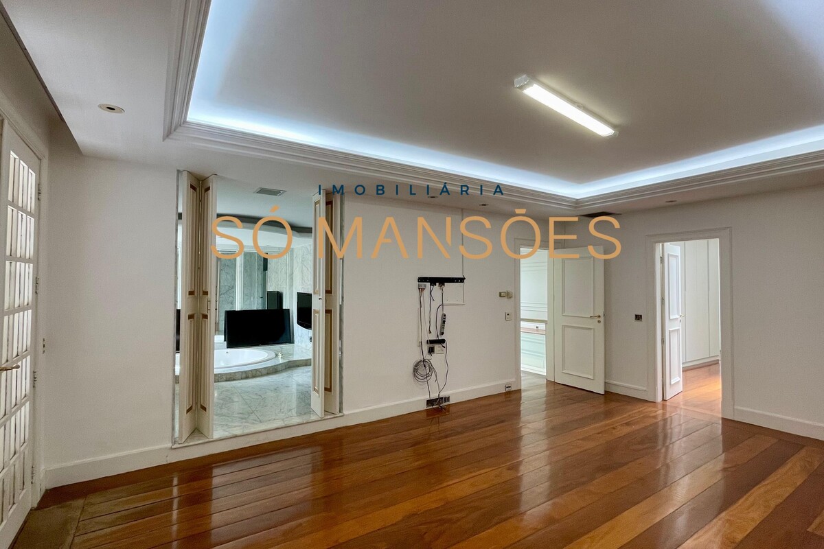 No segundo pavimento, um mezanino distribui a área íntima, composta por duas suítes e dois quartos que compartilham um banheiro. A suíte master oferece closet amplo e banheiro com hidromassagem. Essa configuração permite múltiplas possibilidades de uso, como salas de diretoria, apoio administrativo ou espaços de descanso corporativo.