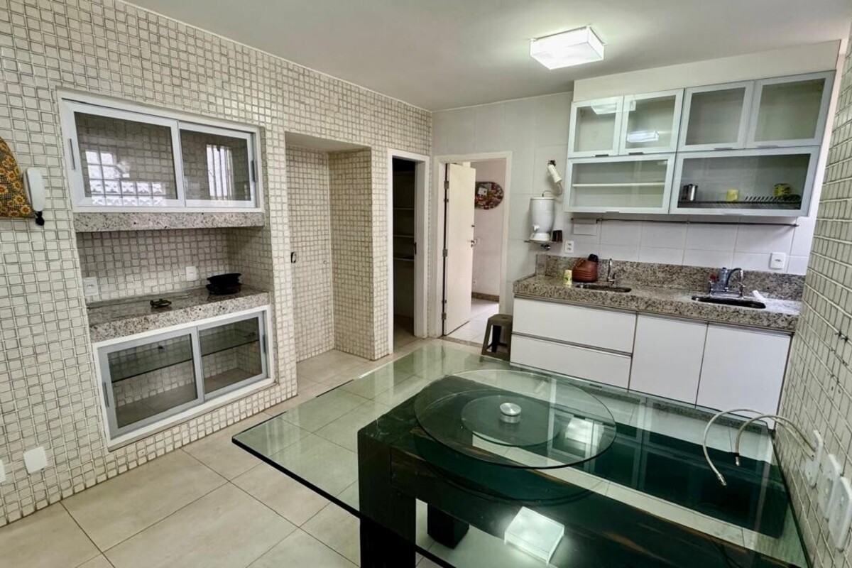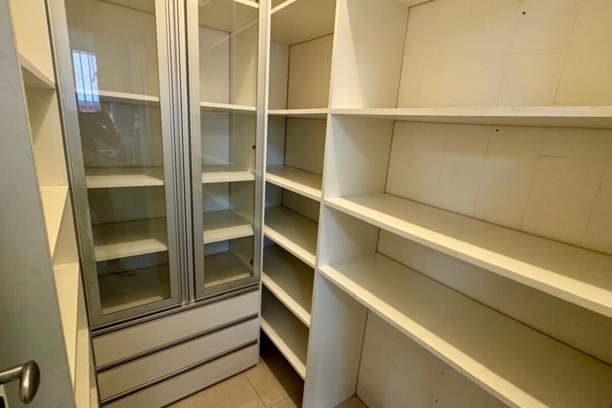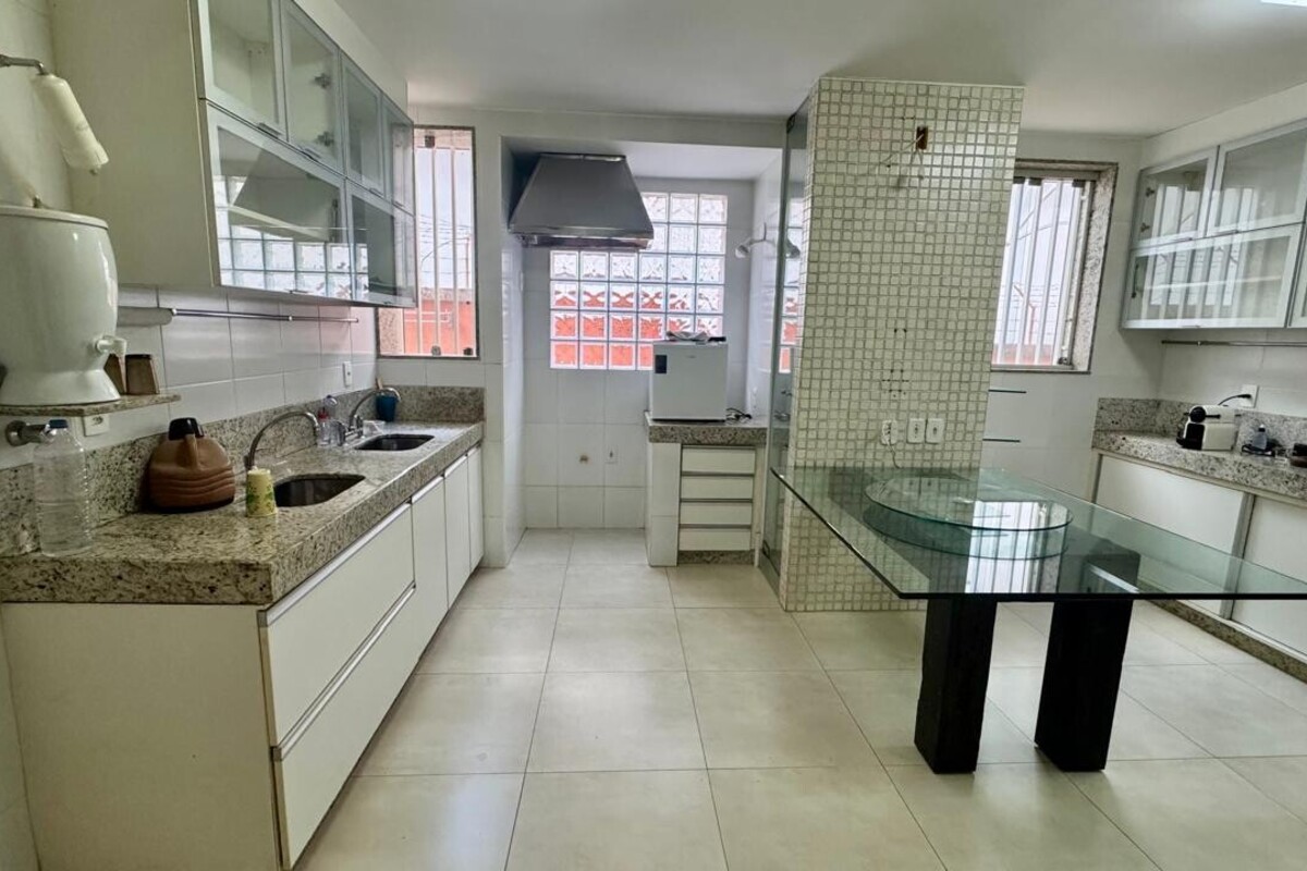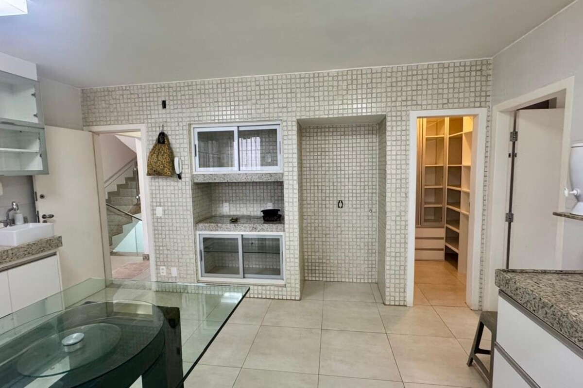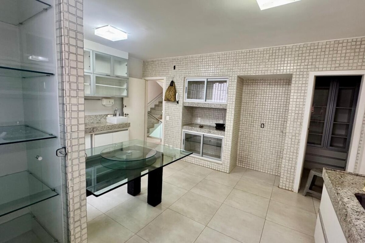 A cozinha é ampla, planejada e bem equipada, com ótimo aproveitamento de espaço, integrada à copa. A casa possui ainda área de serviço independente, despensa e dependência completa de empregada.